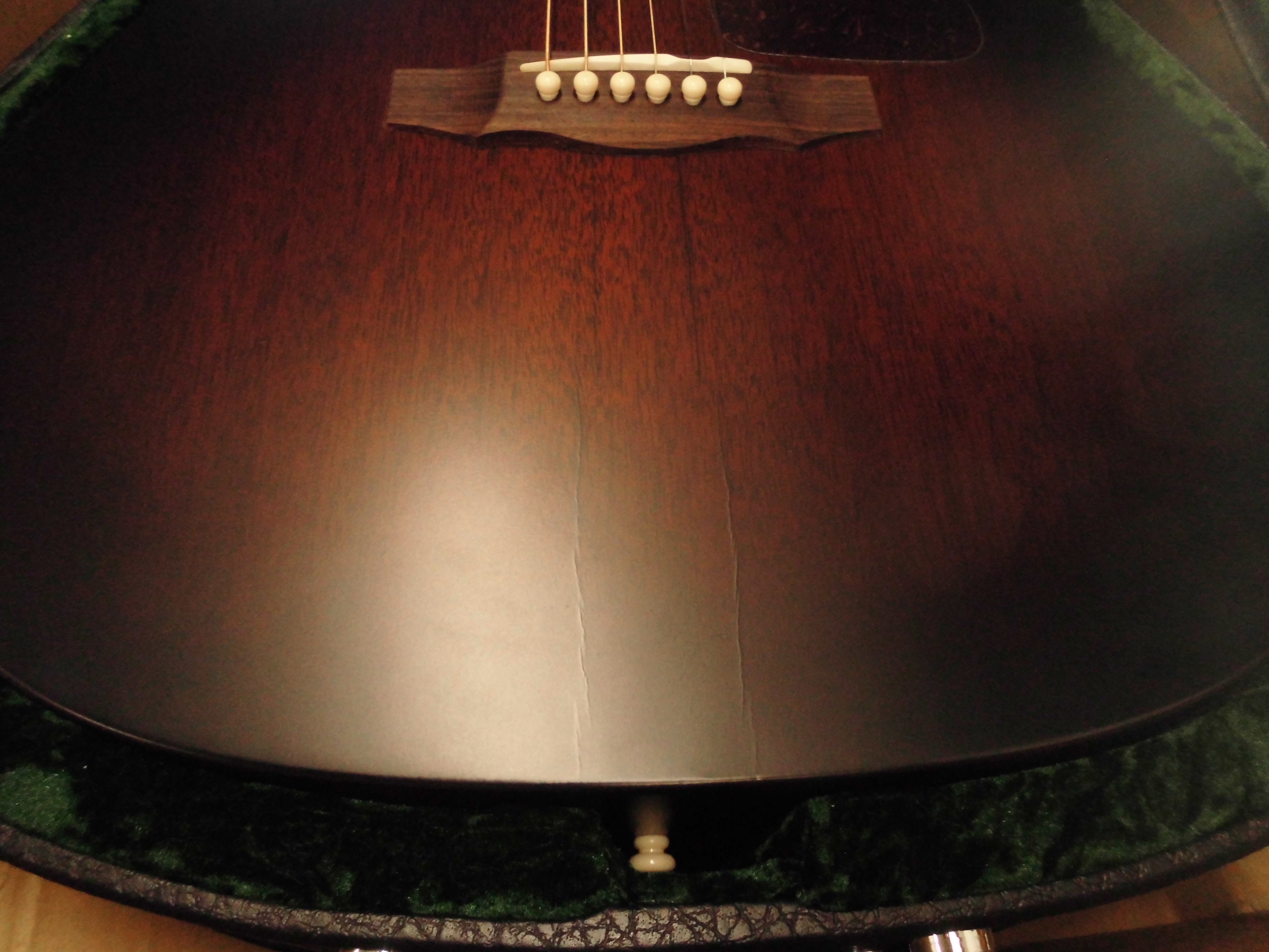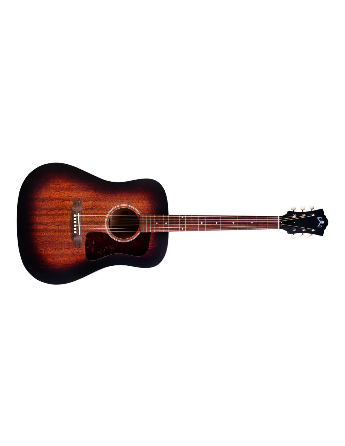 La D-20 VSB fabriquée aux États-Unis est une guitare acoustique dreadnought avec table, dos et éclisses en acajou massif, introduite dans le catalogue Guild en 1968. La D-20 VSB a un chevalet et une touche en palissandre avec des points en nacre, un sillet (43 mm) et un barré en os, le manche est en acajou avec profil C, l'échelle de l'instrument est de 651 mm. La finition est en polyuréthane satinée Vintage Sunburst extrêmement légère qui laisse le bois libre de vibrer. Les autres caractéristiques de la D-20 VSB sont : rosette de style vintage, logo Guild en nacre sur la tête, pickguard en celluloïd tortoise, mécaniques Guild ouvertes de style vintage avec tête en acrylique ivoire. Chaque D-20 VSB est accompagnée d'un certificat d'authenticité numéroté et d'un étui rigide en bois. défaut de finition sur la table Article reconditionné