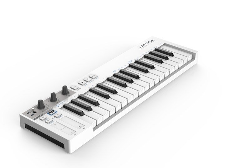 ARTURIA KEYSTEP est un contrôleur de clavier à 32 touches avec USB, MIDI, DIN et CV/Gate, des fonctions d'arpeggiateur et de séquenceur pas à pas, pour gérer des performances en studio et en live avec une grande quantité de connexions. Les caractéristiques techniques incluent un nouveau keybed Arturia Slimkey avec vélocité et aftertouch, Arpeggiateur à 8 modes : Up, down, inclusive, exclusive, random, note order, double up, double down, mode Séquenceur avec 8 séquences pas à pas polyphoniques avec insertion Rest, Tie et Legato, contrôle de la vitesse et tap tempo, boutons REC, PLAY et STOP pour le contrôle de la performance sur séquenceur et arpeggiateur, bouton sustain HOLD, connexion jack pour le pédale sustain, mode Chord play, sélection de canal MIDI, temps GATE, valeur SWING. Il présente également une connexion jack DC pour une utilisation autonome, USB MIDI pour connexion à un ordinateur et éditeur MCC, ports MIDI in/out, ports Sync i/o, sélecteurs sync select : Internal, USB, MIDI, Clock, sorties CV/GATE, sortie CV Velo/Aftertouch/Modwheel, Pitch bend et mod wheel ‘capacitive-touch’.