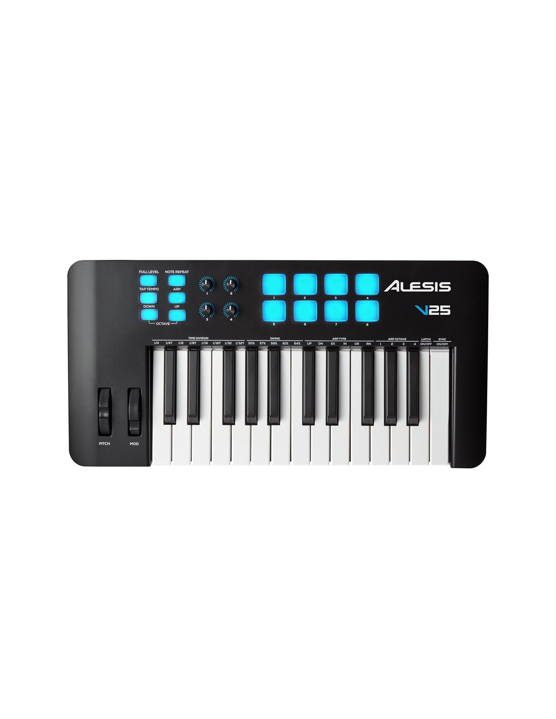 La V25 MKII est un clavier MIDI d'Alesis avec 25 touches. Il est équipé de roues pour le contrôle du pitch bend et de la modulation, de 4 potentiomètres assignables pour le contrôle de logiciels et de DAW, et de 8 pads rétroéclairés à LED sensibles à la vélocité.