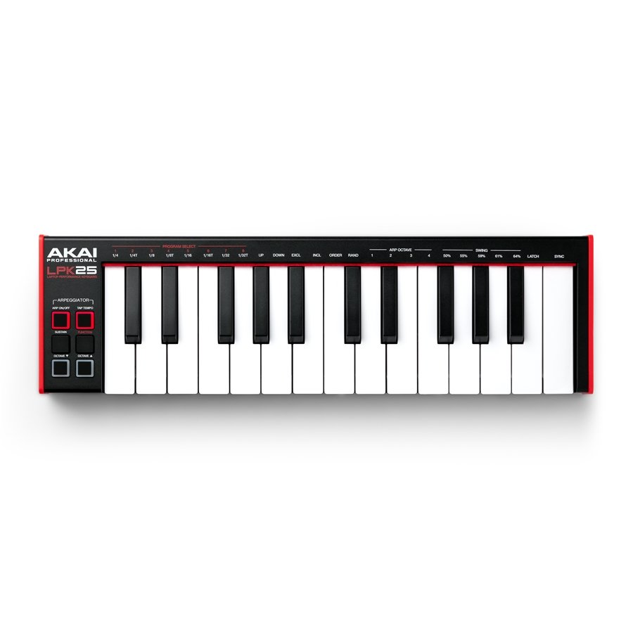 AKAI LPK25 MKII est un contrôleur MIDI USB plug&play avec 25 touches, des boutons pour la transposition des octaves, un protocole MIDI de 127 notes et 10 octaves, un arpeggiateur intégré à 7 modes : Up, Down, Exclusive, Inclusive, Order, Random et Latching, une division rythmique sélectionnable entre 1/4, 1/8, 1/16, 1/32 avec fonction swing et terzina. Avec l'achat, il est possible de télécharger gratuitement le logiciel MPC Beats fourni avec une riche dotation de sons, plugins et échantillons audio de batterie.