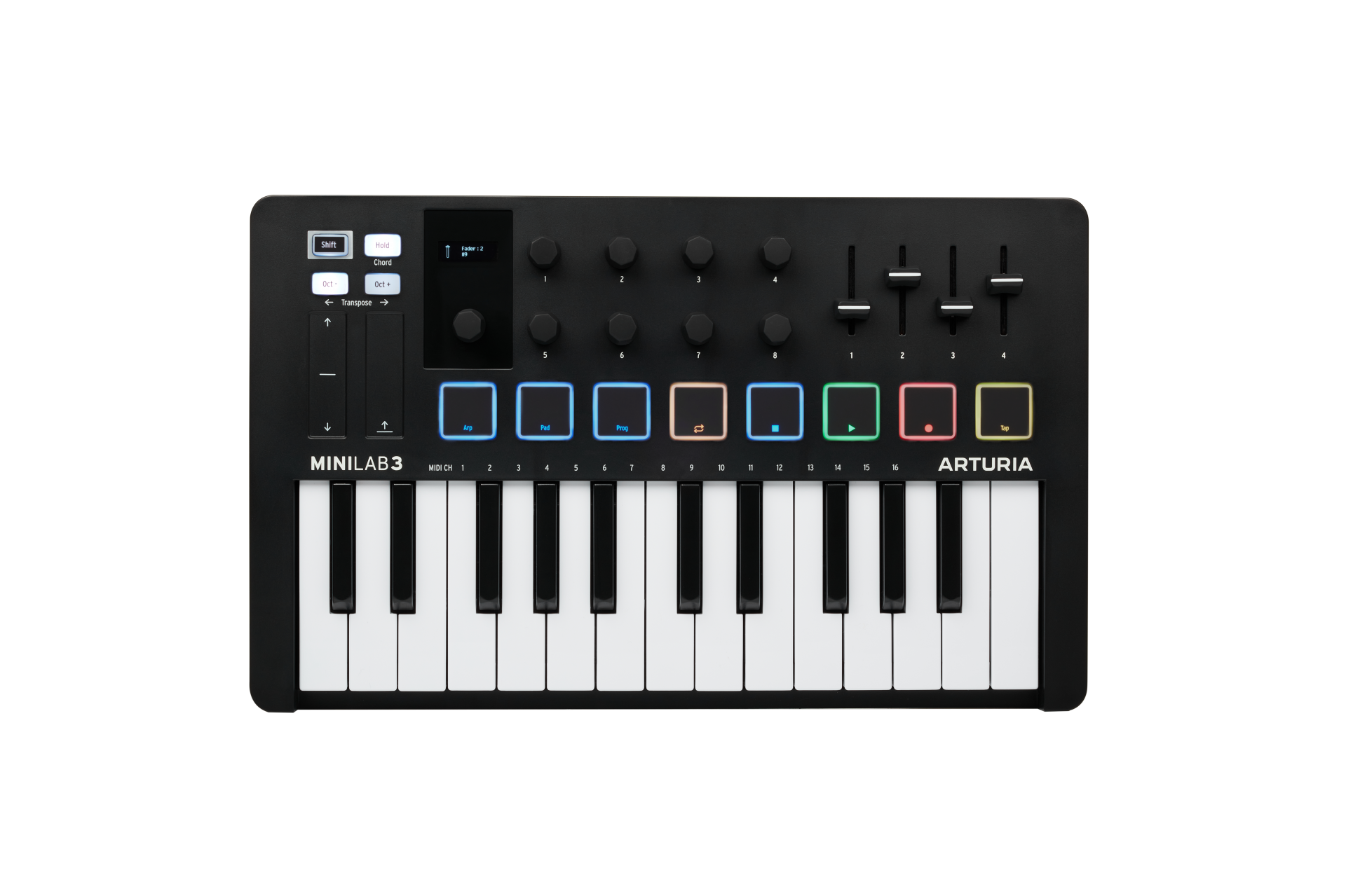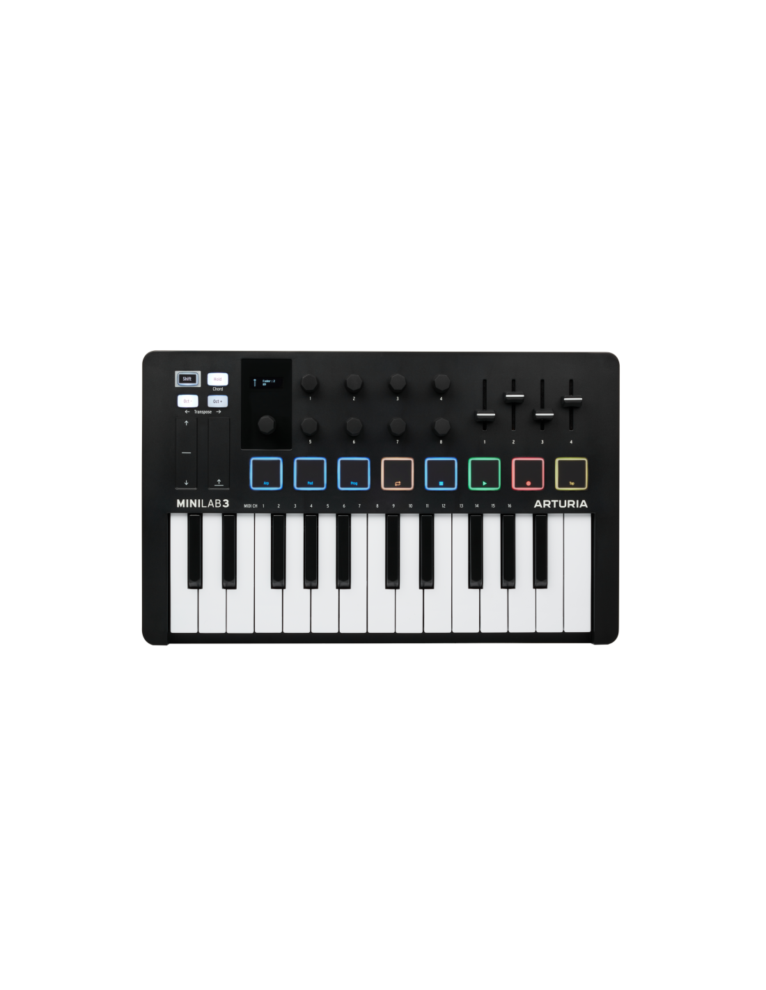 Le Minilab 3 Black est un clavier MIDI d'Arturia de couleur noire, avec 25 touches. Il est équipé de 8 pads rétroéclairés, 8 contrôles rotatifs, 4 faders, 2 capteurs sensibles au toucher pour le pitch bend et la modulation, un mini écran avec une molette de navigation et d'autres boutons pour l'intégration avec les principales DAW.