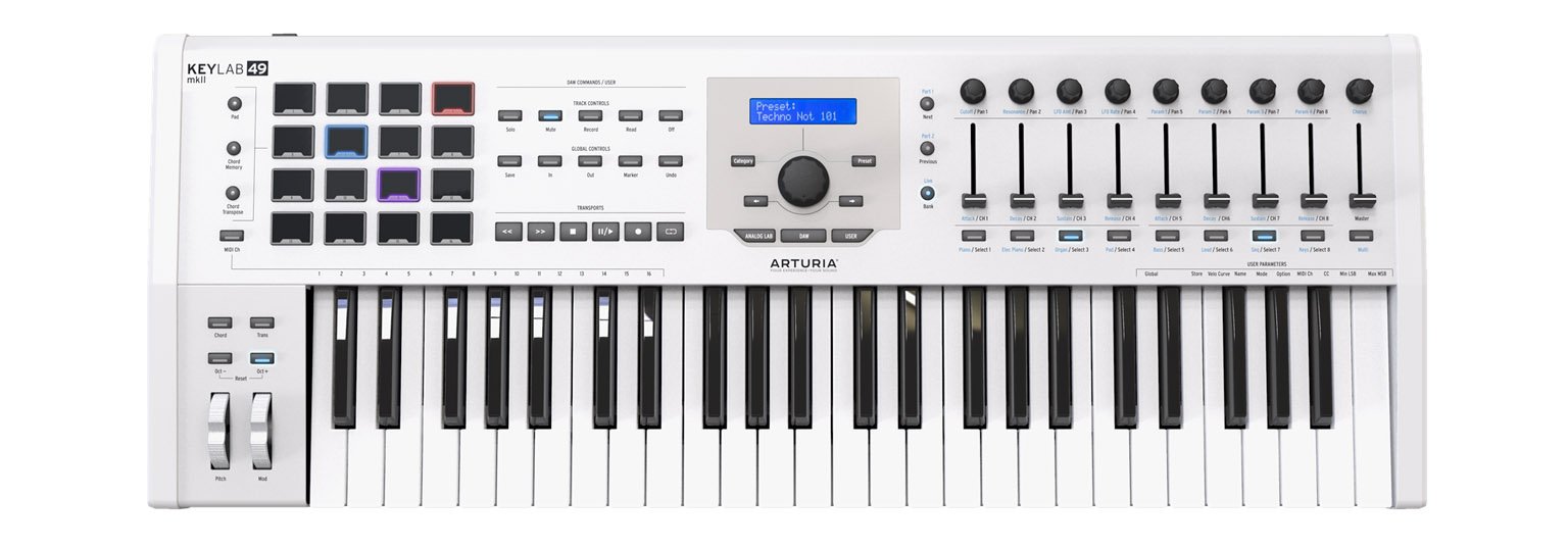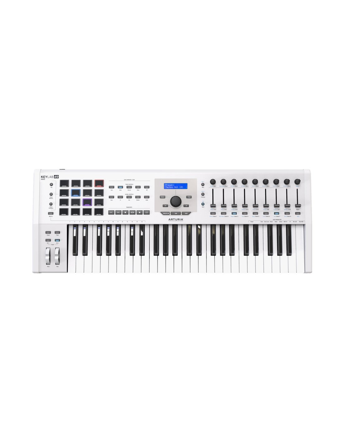 ARTURIA KEYLAB MK II 49 WHITE est un clavier MIDI d'Arturia de couleur blanche, avec 49 touches. Il est équipé de 16 pads rétroéclairés, 9 faders et contrôles rotatifs, section DAW command center et transport, 2 roues de pitch bend et de modulation et un écran LCD