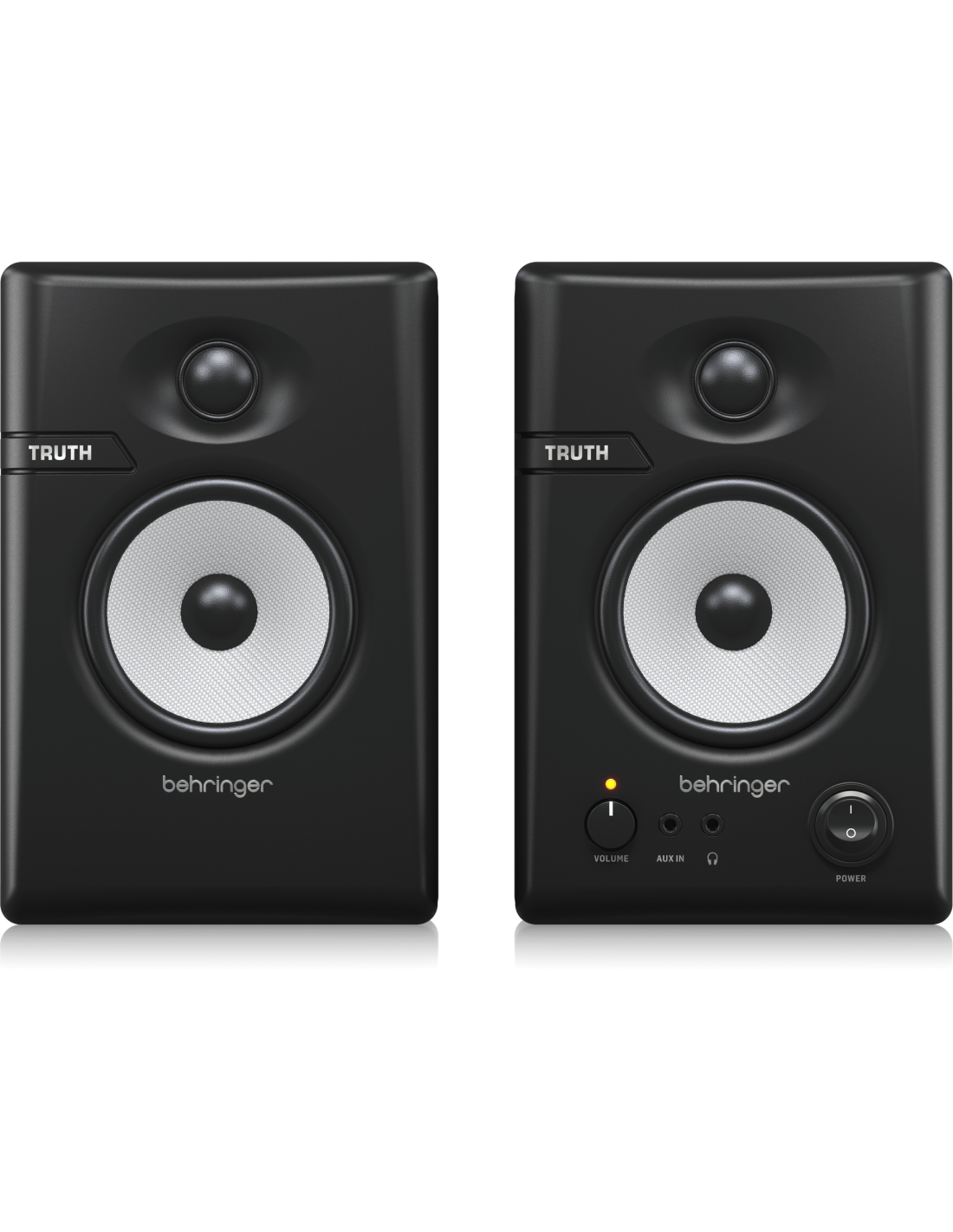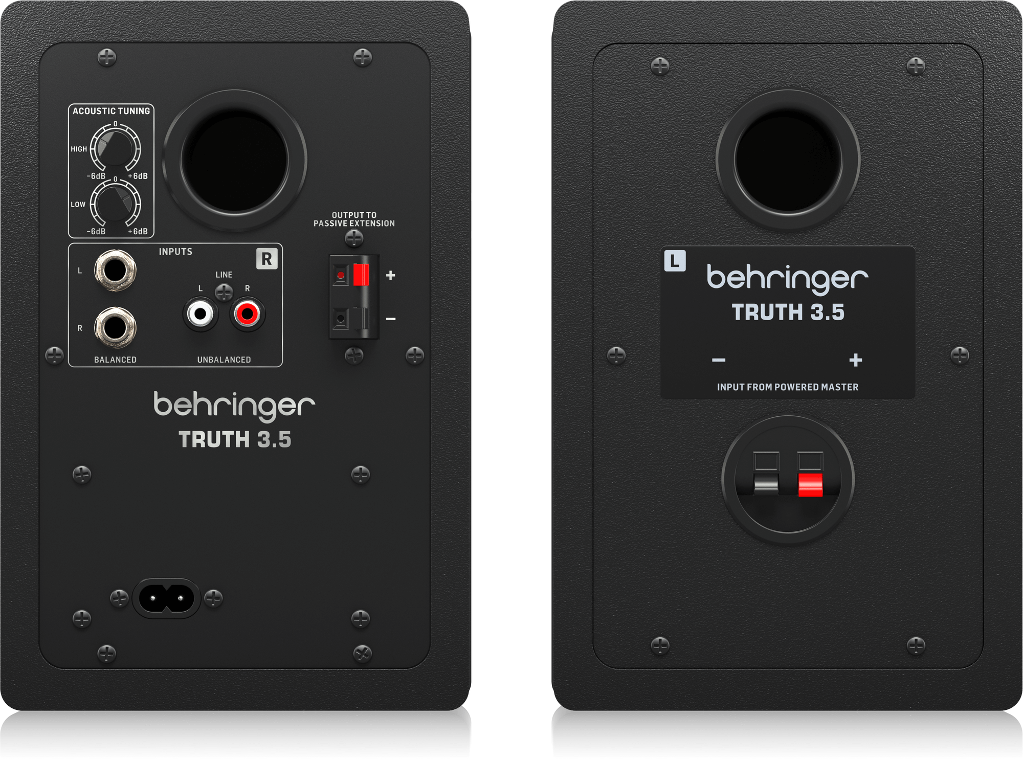 BEHRINGER TRUTH 3.5. Paire de moniteurs numériques de studio à 2 voies avec 64W de puissance. Les caractéristiques techniques incluent la technologie Waveguide pour le réglage des fréquences via 2 commandes Acoustic Tuning sur le panneau arrière du moniteur actif, Tweeter en dôme en soie de 1" haute résolution, Woofer de 3.5" à excursion longue avec cône en fibre de verre, entrées analogiques stéréo via TRS et RCA, contrôle du volume, entrée casque et auxiliaire sur le panneau avant, bass reflex.