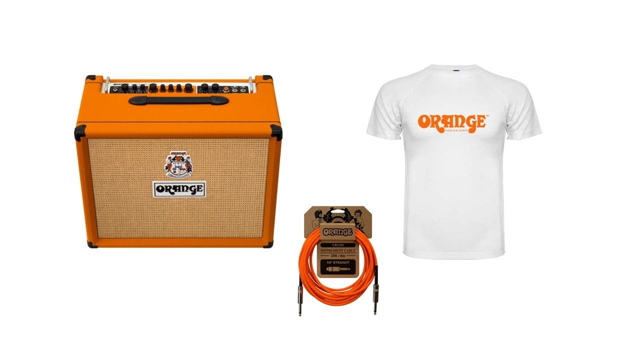 Set d'amplification composé de l'amplificateur Super Crush 100 Combo, du câble Twister et d'un t-shirt Orange.