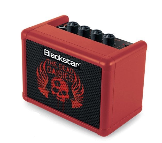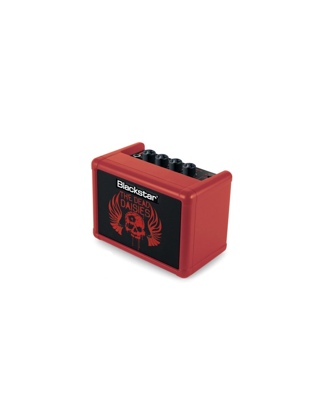 Amplificateur portable pour guitare Fly 3, édition limitée 'The Dead Daisies', avec connectivité Bluetooth. 2 canaux (Clean et Overdrive). ISF (Infinite Shape Feature). Delay numérique. Entrée auxiliaire pour CD ou MP3. Sortie casque. Sortie haut-parleur de 3'. Haut-parleur de 3'. Contrôles (gain, volume, interrupteur overdrive, égalisation (ISF), niveau de délai, temps de délai, entrée MP3/ligne, sortie émulée de haut-parleur, entrée). Batterie ou alimentation optionnelle (Blackstar FLY3 Power Supply). Dimensions : 170 x 126 x 102 mm. Poids : 0,9 kg.