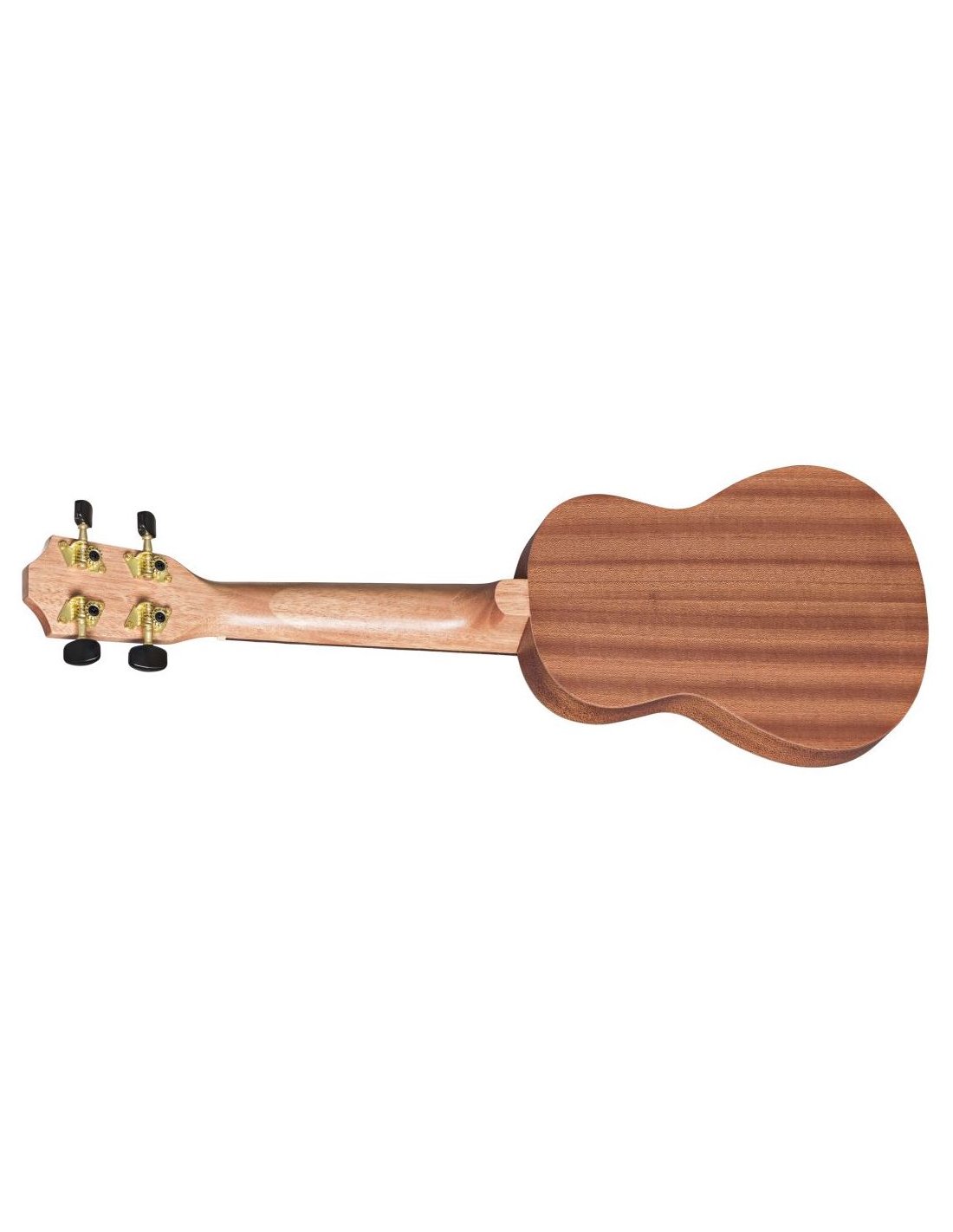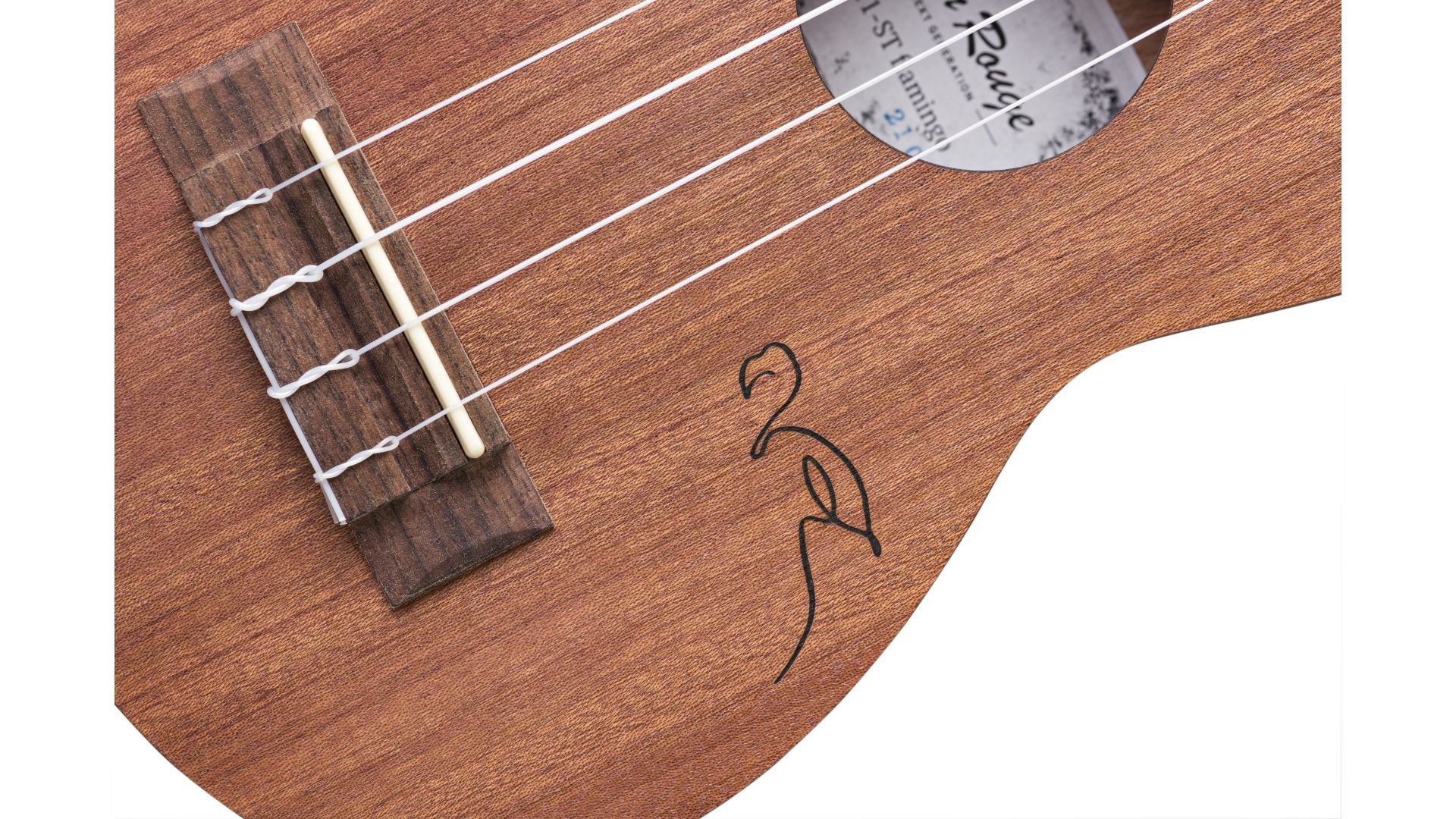 BATON ROUGE UR11-S FLAMINGO UKULELE SOPRANO est un Ukulélé format Soprano Travel avec un corps Slim en Acajou, un manche en Okoumé, un doigté et un chevalet en Noyer, des mécaniques ouvertes style guitare avec des boutons noirs, un design "Flamant" imprimé au laser, longueur de la touche 340mm, sillet de 35mm, cordes Aquila Nylgut préinstallées.