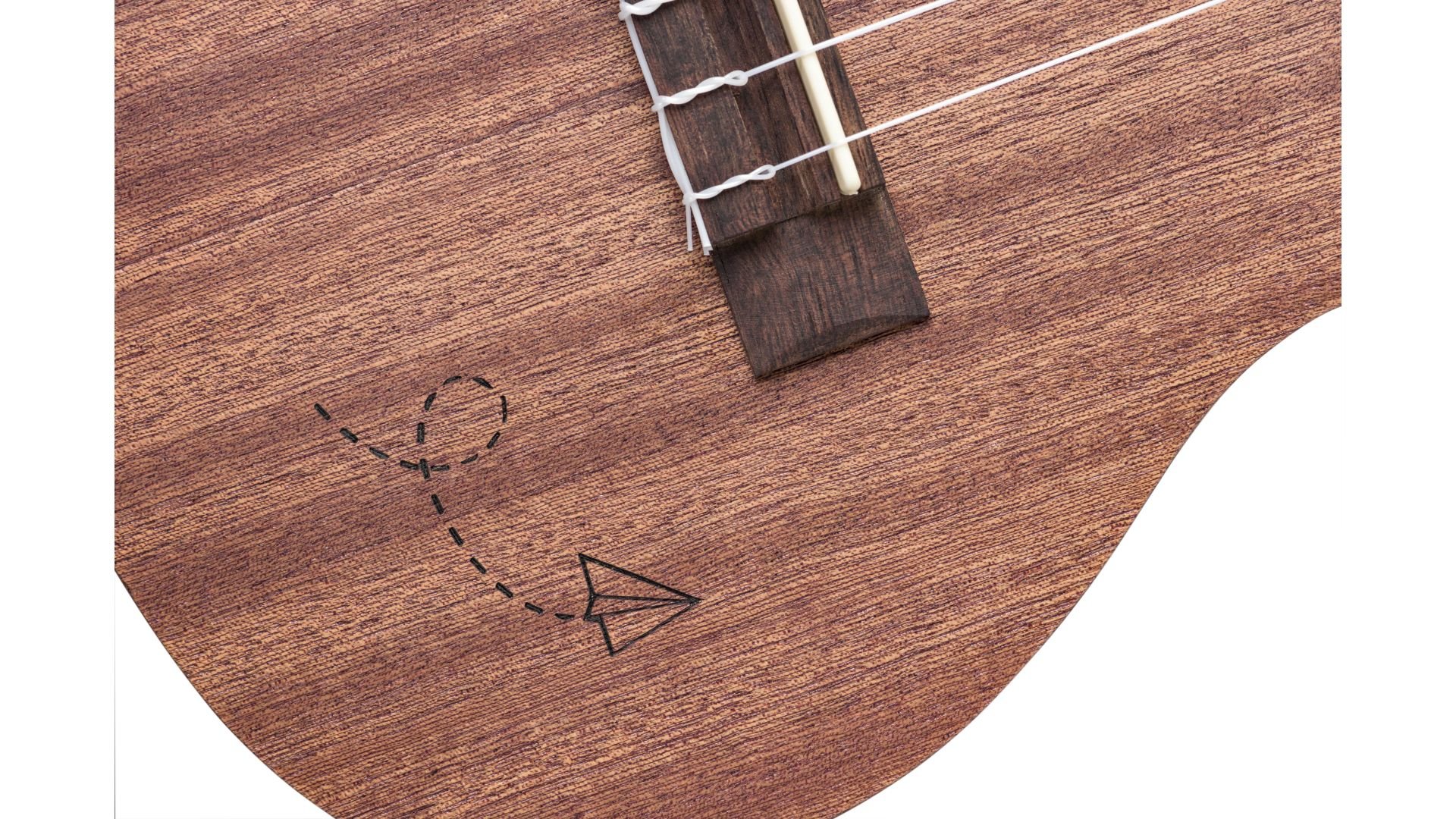 BATON ROUGE UR11-C PAPER PLANE UKULELE CONCERT est un Ukulélé format Concert avec un corps en Acajou, un manche en Okoumé, un touche et un chevalet en Noyer, des mécaniques ouvertes dorées style guitare avec des boutons noirs, dessin "Avion en papier" imprimé au laser, longueur de la touche 375mm, sillet de 35mm, cordes Aquila Nylgut préinstallées.