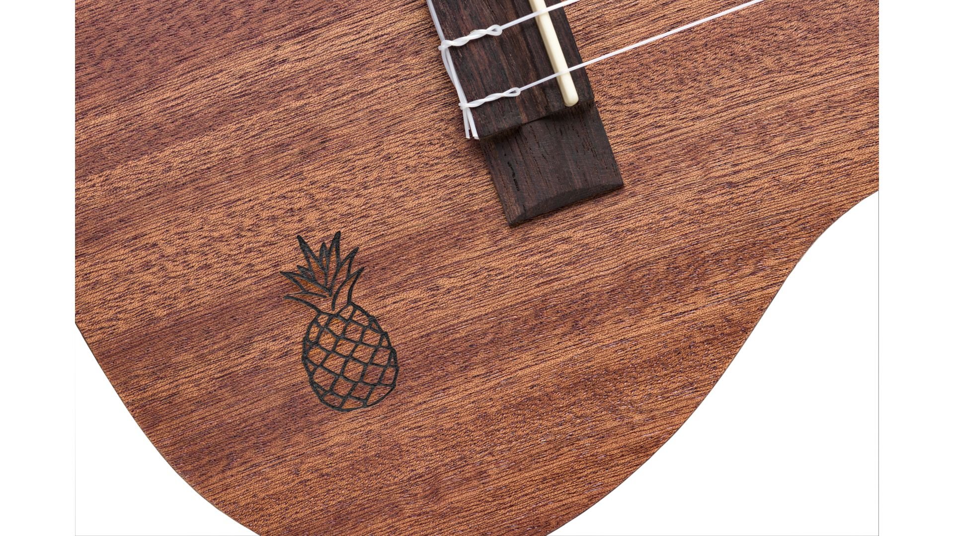 BATON ROUGE UR11-C UKULÉLÉ ANANAS CONCERT est un Ukulélé de format Concert avec un corps en Acajou, un manche en Okoumé, un touche et un chevalet en Noyer, des mécaniques ouvertes dorées de style guitare avec des boutons noirs, un design "Ananas" gravé au laser, longueur de la touche 375mm, sillet de 35mm, cordes Aquila Nylgut préinstallées.