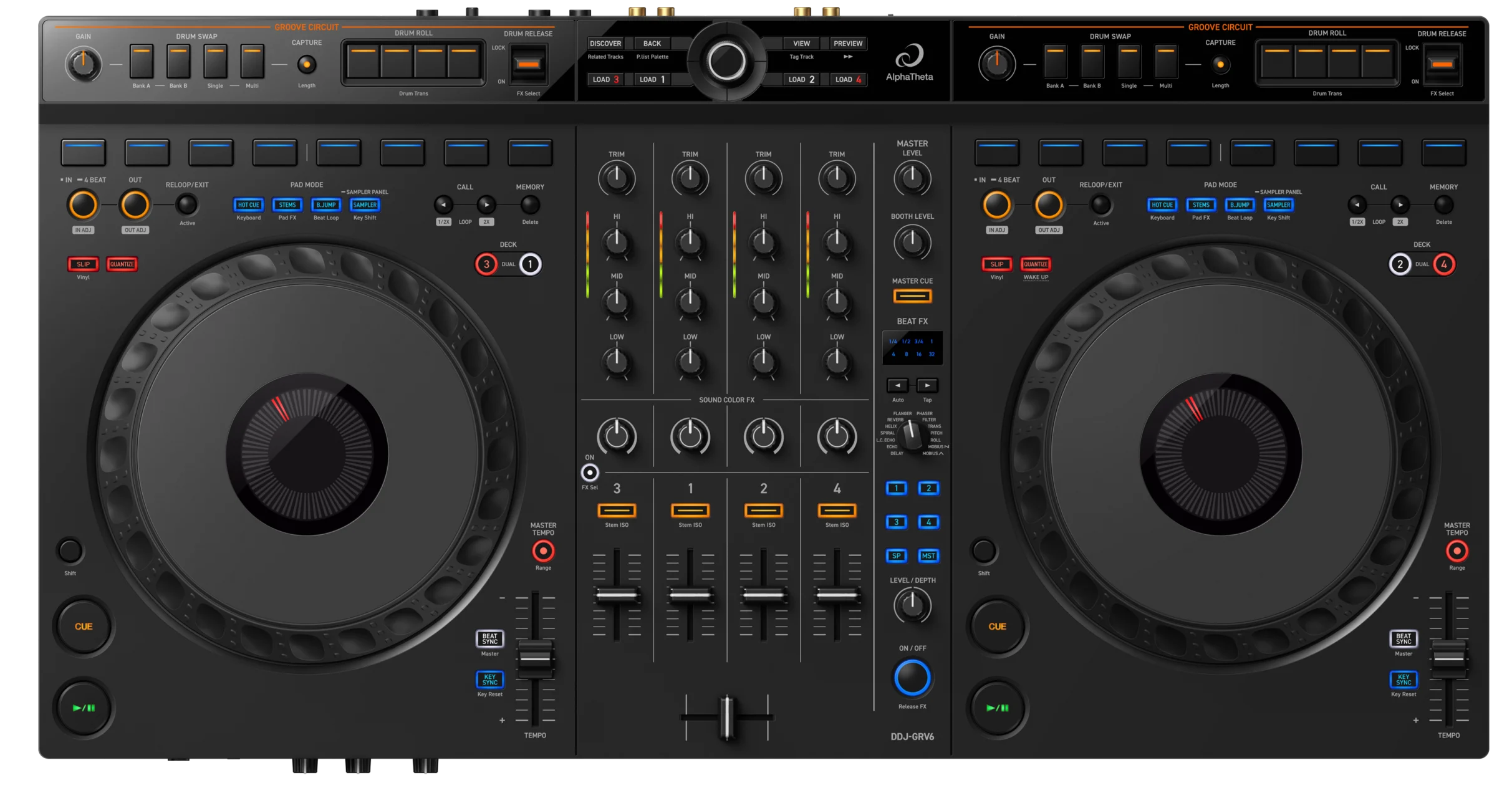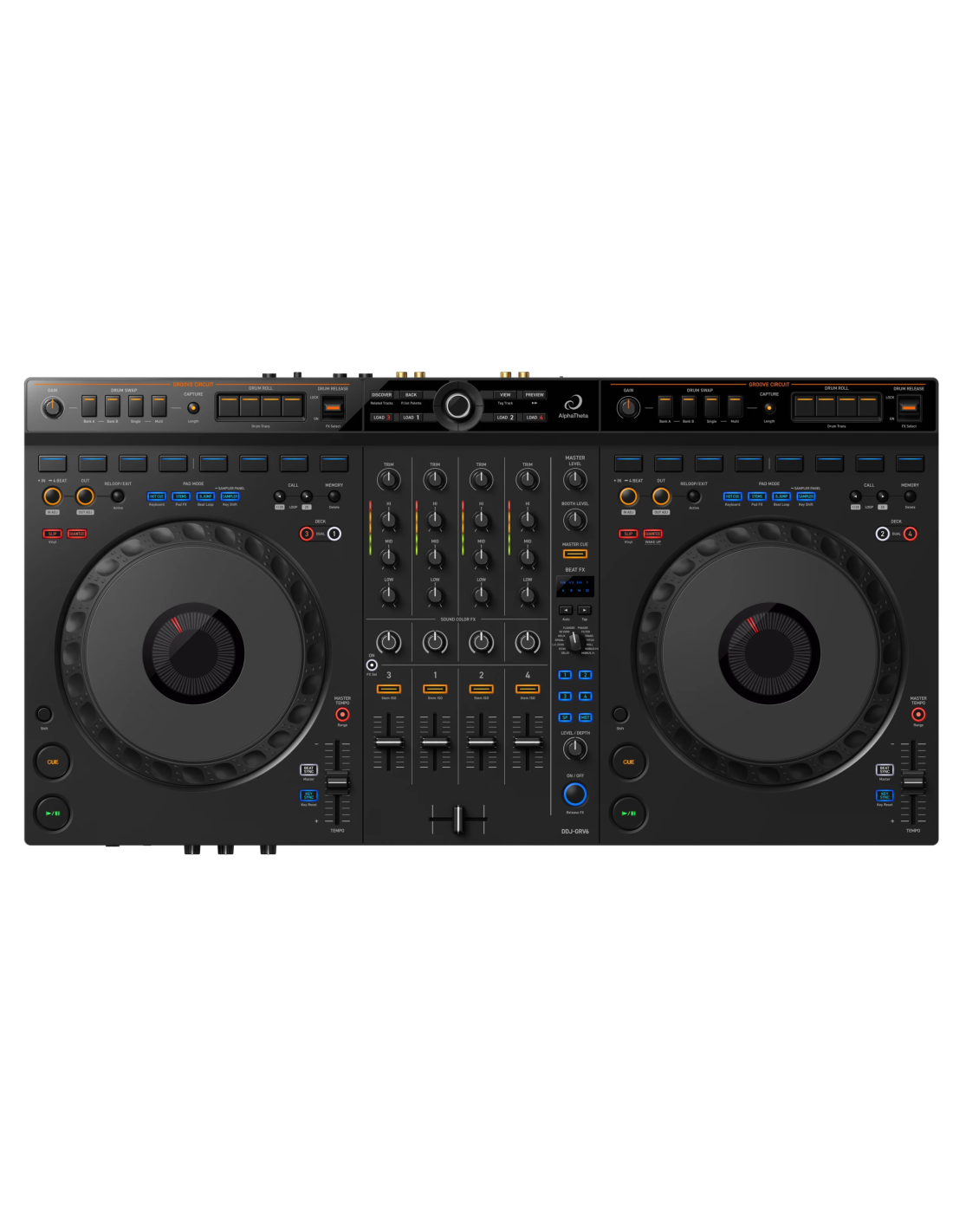 ALPHATHETA DDJ-GRV6 est un contrôleur DJ à 4 canaux conçu pour les débutants et les professionnels, léger et compact avec une interface intuitive, et compatible avec la plupart des applications DJ sur le marché. Les caractéristiques techniques incluent la compatibilité avec les logiciels Rekordbox, Djay et Serato DJ Pro et avec les principaux services de streaming audio : Apple Music, Beatport Streaming, Beatsource Streaming, SoundCloud Go+ et TIDAL, un mixeur à 4 canaux intégré avec EQ à 3 bandes, contrôle Trim, effets intégrés sur des encodeurs dédiés pour chaque canal, 2 jog wheels de 206 mm, 8 pads de performance pour deck avec fonction Pad FX qui permet le lancement d'effets en appuyant sur les pads, effets Roll, Trans, Echo Out et Delay, fonction Sampler avec le logiciel Rekordbox avec 16 emplacements × 4 banques et avec Serato DJ Pro avec 8 emplacements × 4 banques, 8 fonctions Hot Cues, fonction Groove Circuit pour manipuler des parties de batterie et créer des remix, navigation intuitive via Smart Rotary Selector, fonctionnement via bus USB-C. Il présente une entrée Mic via Jack 6,3 mm TRS, des sorties master sur jack 6,3 mm TRS et RCA, Booth via RCA, 2 sorties casque sur jack 6,3 mm et 3,5 mm TRS.