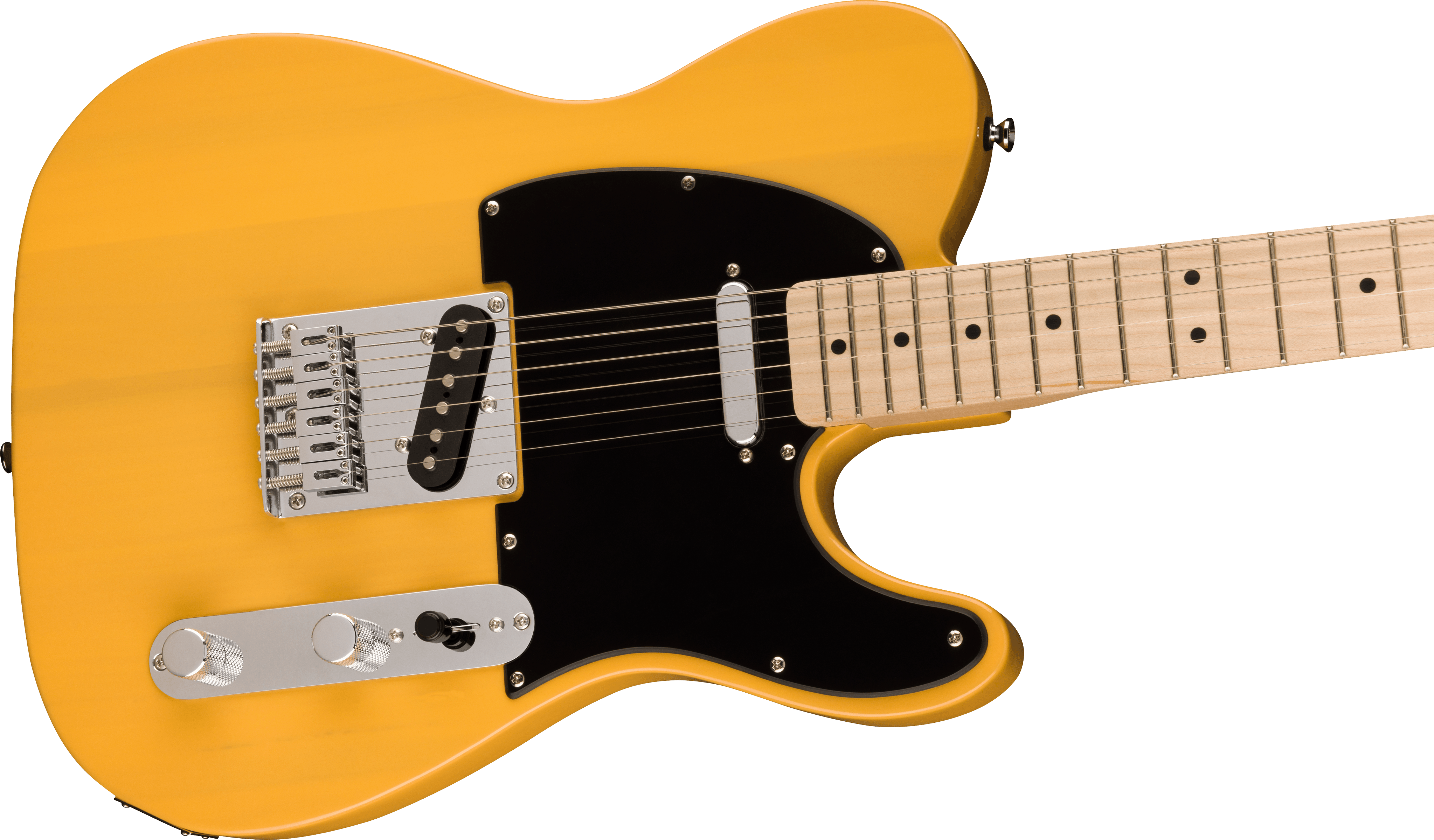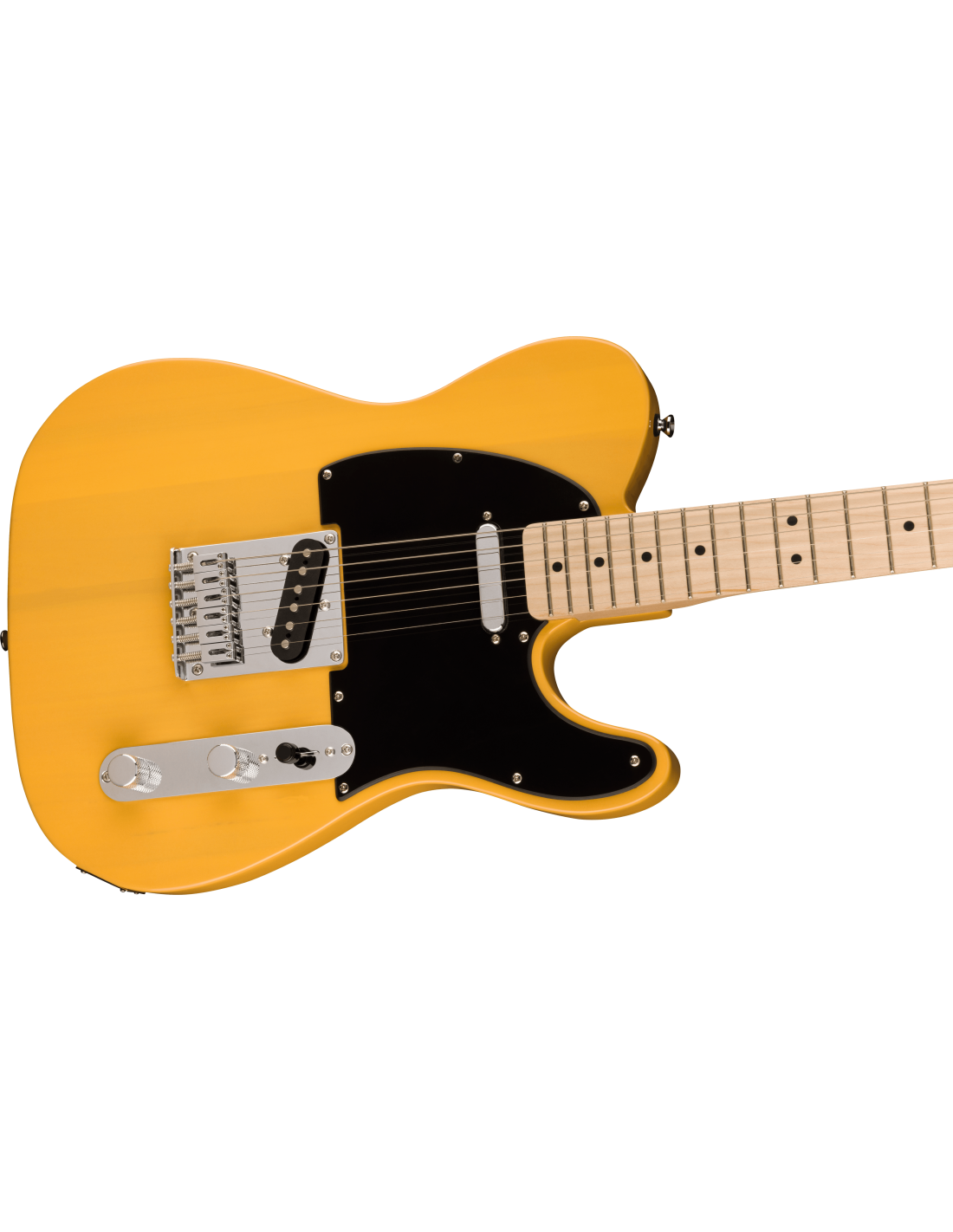 Guitare Électrique Squier Tele couleur BUTTERSCOTCH BLONDE. La Squier Tele est une guitare électrique à 6 cordes. Les caractéristiques techniques incluent un corps en peuplier, un manche et une touche en érable avec 21 frettes Medium Jumbo, un rayon de 9,5", 2 micros Ceramic Single Coil et un matériel chromé.
