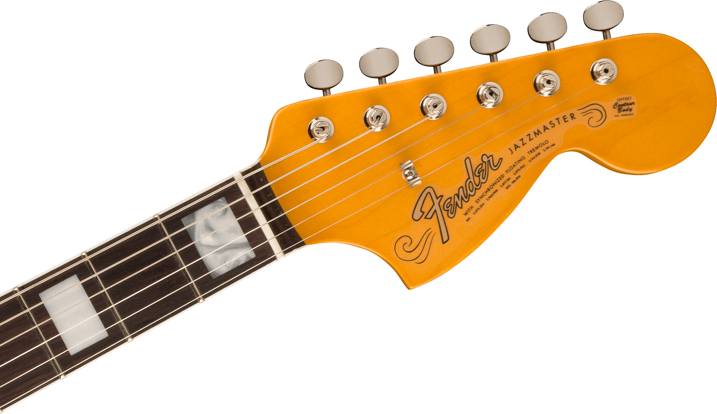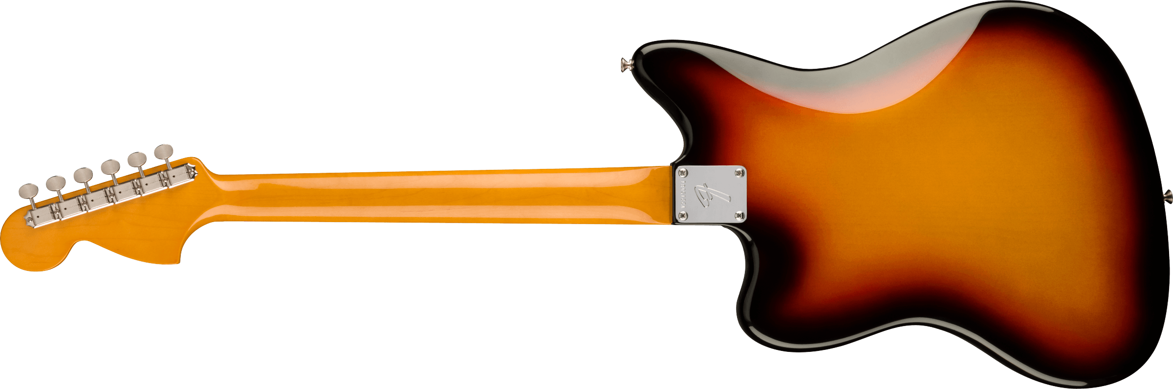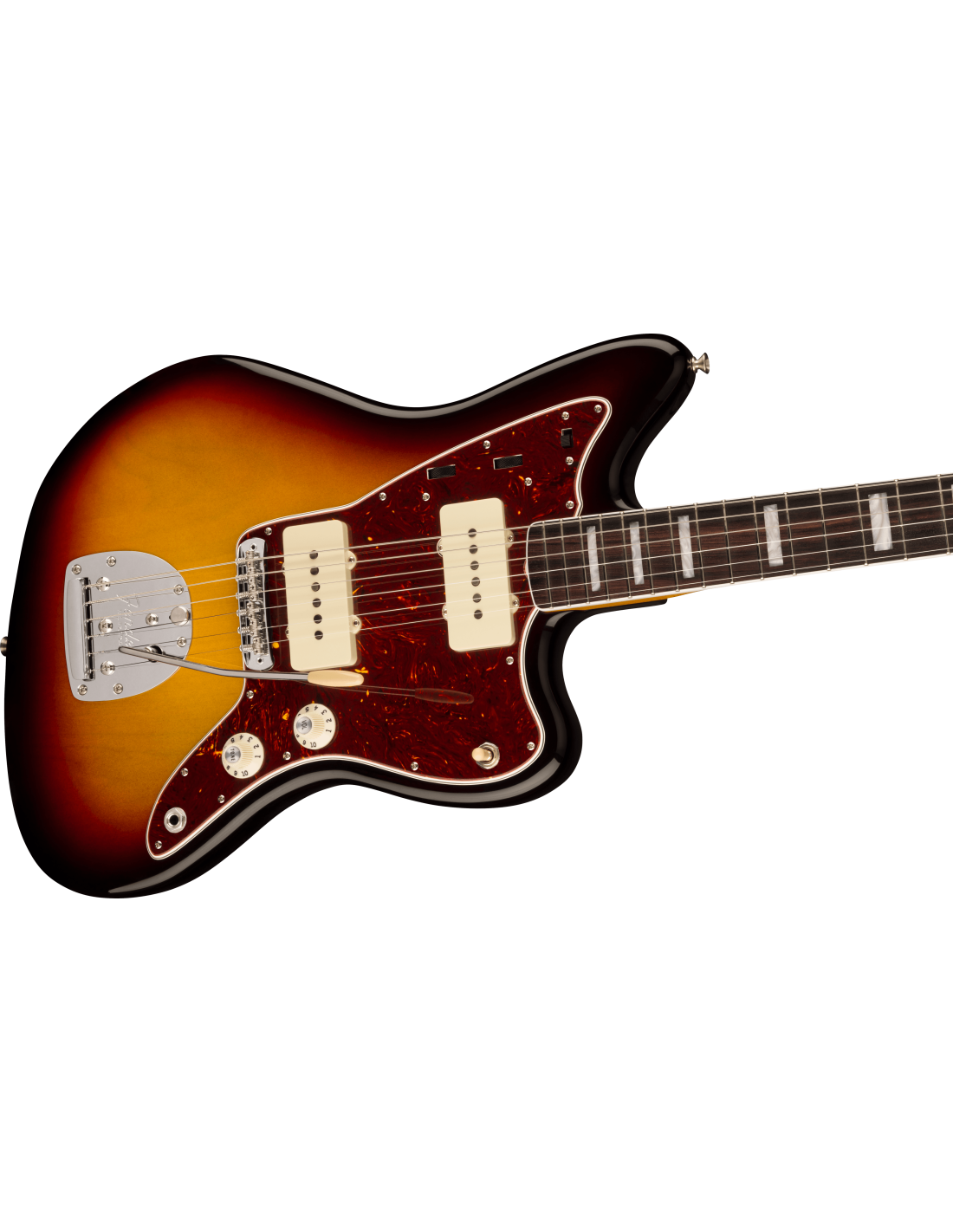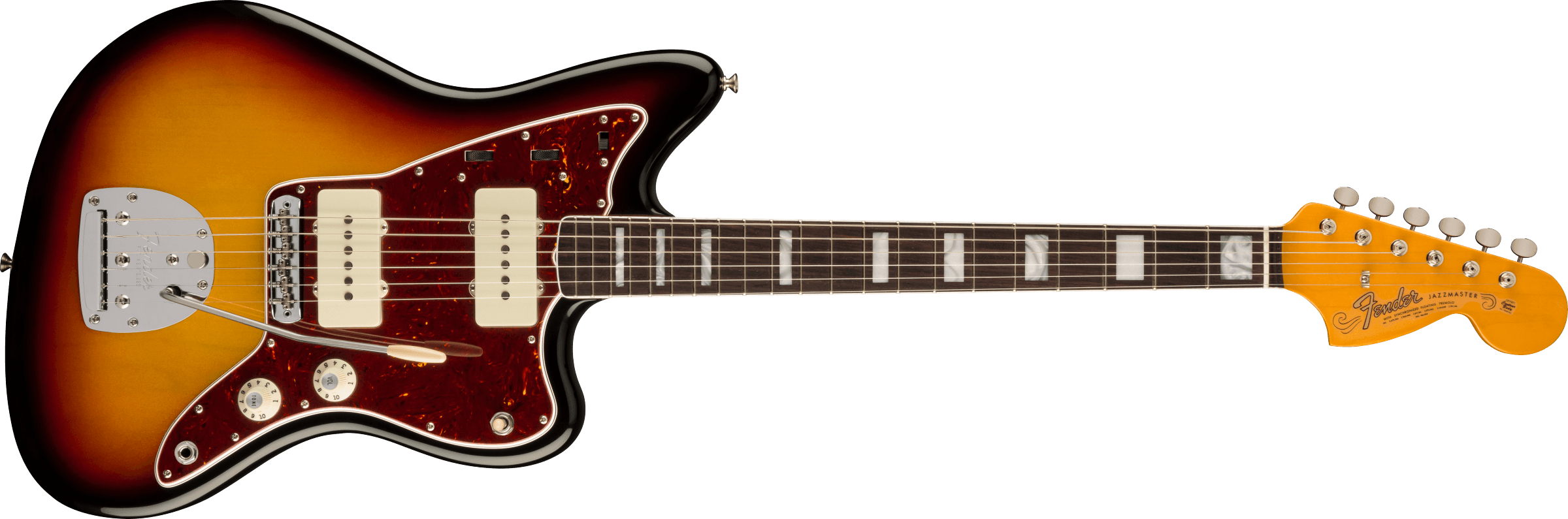 Guitare Électrique Fender American Vintage II 1966 Jazzmaster, couleur £-Color Sunburst. La Fender American Vintage II 1966 Jazzmaster est une guitare électrique à 6 cordes. Elle présente un manche en Érable avec profil en C, avec un touche bordée en Palissandre Round-Lam avec un rayon de 7,25” et 21 frettes Vintage Tall. Échelle de 25 1/2”. Le corps est en Tilleul, avec un pickguard en tortue à 4 couches. Finition en Nitrocellulose. La partie électronique se compose de deux micros Fender Pure Vintage ’66 Single Coil Jazzmaster. Deux ensembles de contrôles sélectionnables : le circuit “Lead” comprend un Volume Master, un Ton Master et un sélecteur à 3 positions. Le circuit Rhythm comprend deux roulettes à effleurement pour le contrôle du Volume et du Ton du micro au manche. Matériel en Nickel/Chrome. Pont Pure Vintage Jazzmaster avec des selles filetées en acier. Tremolo Flottant Pure Vintage. Étui rigide de style Vintage inclus.