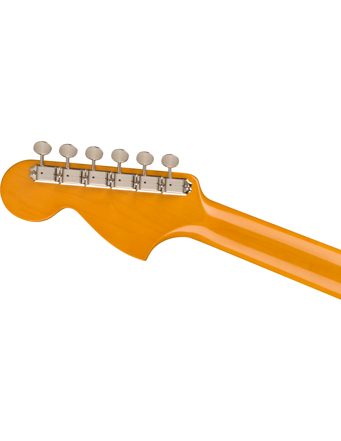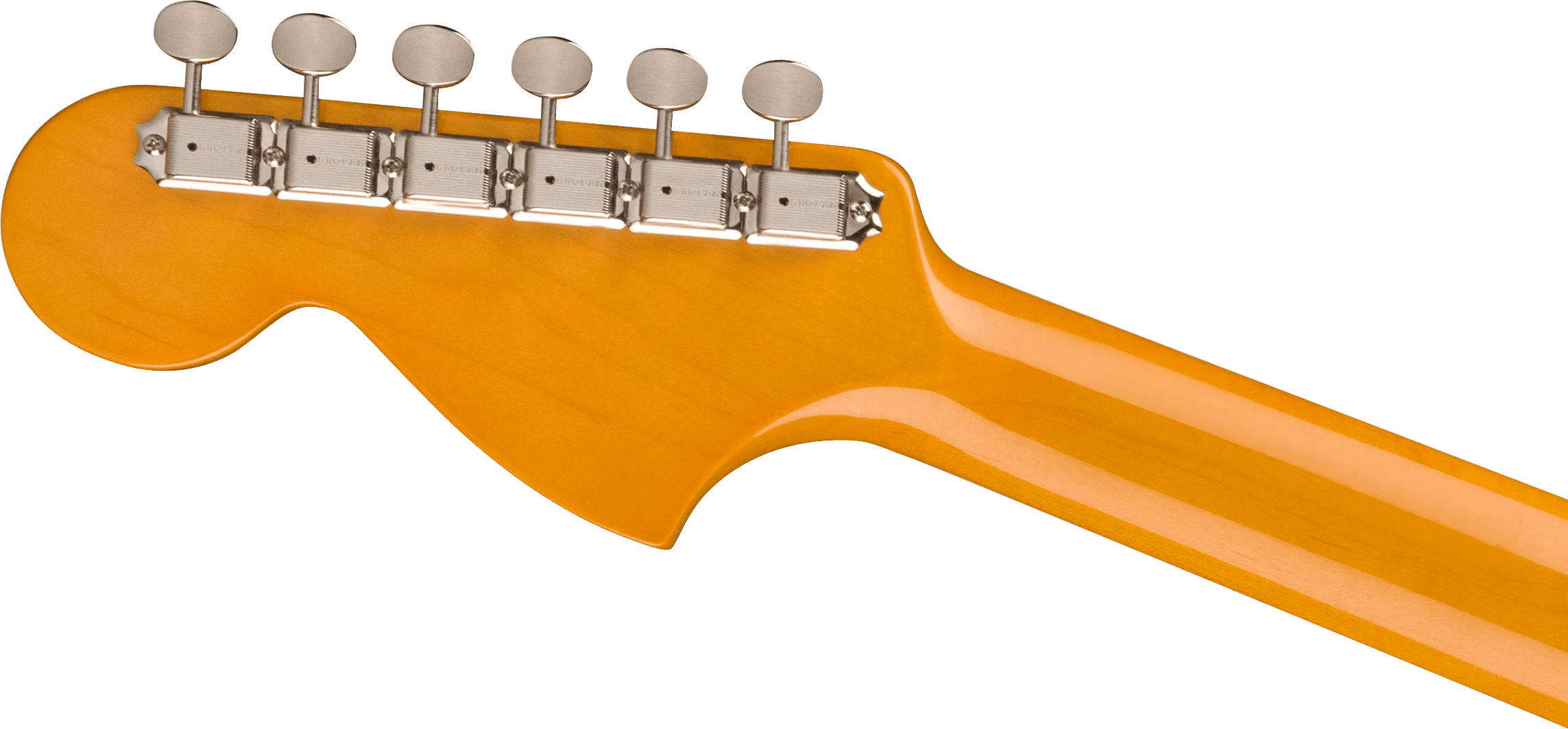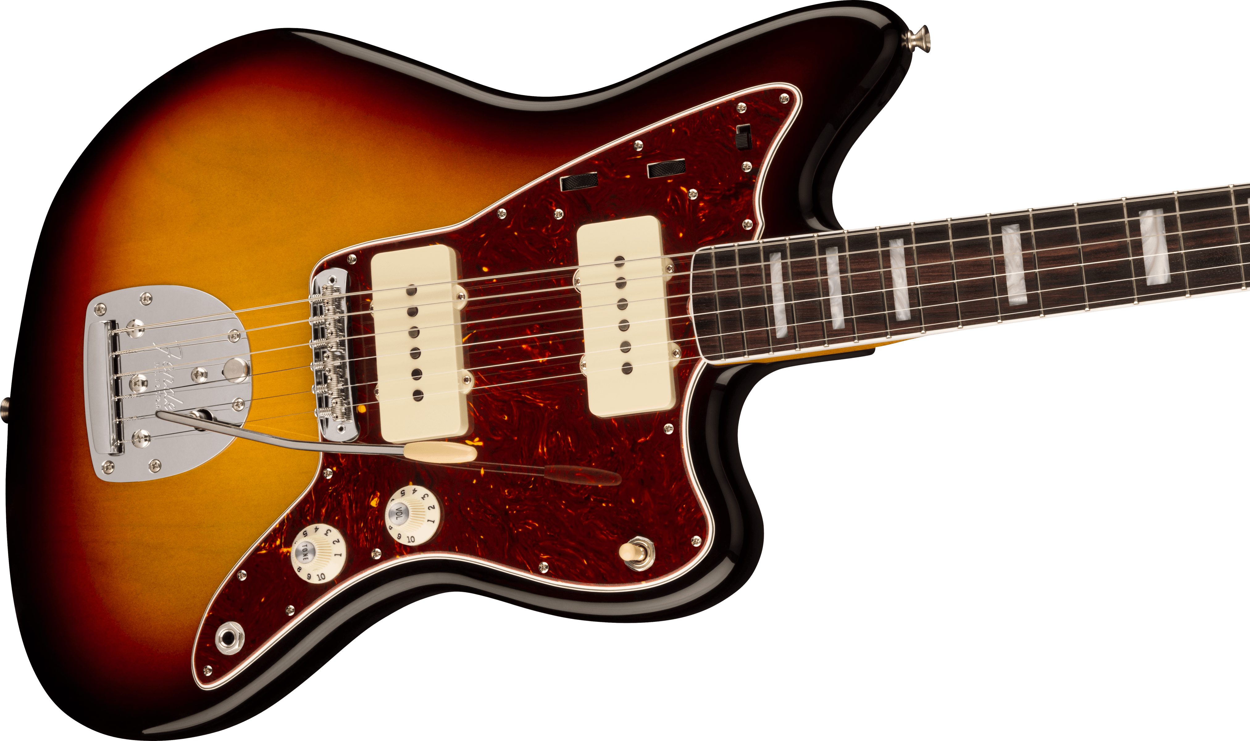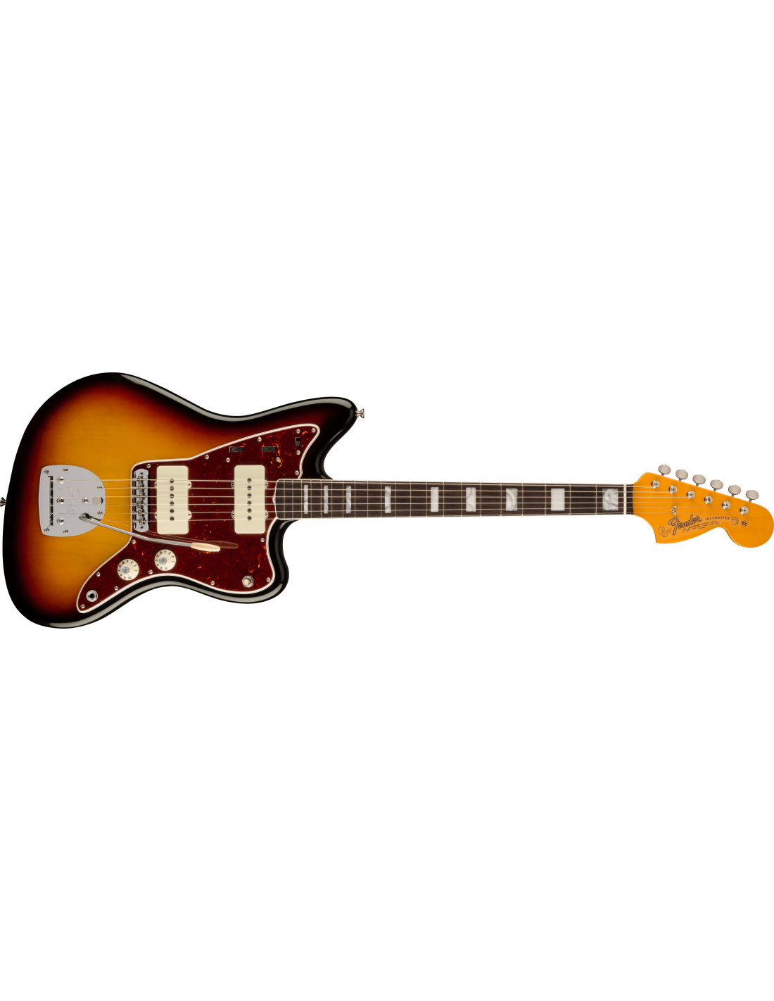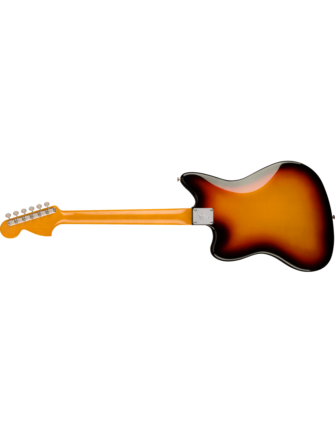 Guitare Électrique Fender American Vintage II 1966 Jazzmaster, couleur £-Color Sunburst. La Fender American Vintage II 1966 Jazzmaster est une guitare électrique à 6 cordes. Elle présente un manche en Érable avec profil en C, avec un touche bordée en Palissandre Round-Lam avec un rayon de 7,25” et 21 frettes Vintage Tall. Échelle de 25 1/2”. Le corps est en Tilleul, avec un pickguard en tortue à 4 couches. Finition en Nitrocellulose. La partie électronique se compose de deux micros Fender Pure Vintage ’66 Single Coil Jazzmaster. Deux ensembles de contrôles sélectionnables : le circuit “Lead” comprend un Volume Master, un Ton Master et un sélecteur à 3 positions. Le circuit Rhythm comprend deux roulettes à effleurement pour le contrôle du Volume et du Ton du micro au manche. Matériel en Nickel/Chrome. Pont Pure Vintage Jazzmaster avec des selles filetées en acier. Tremolo Flottant Pure Vintage. Étui rigide de style Vintage inclus.