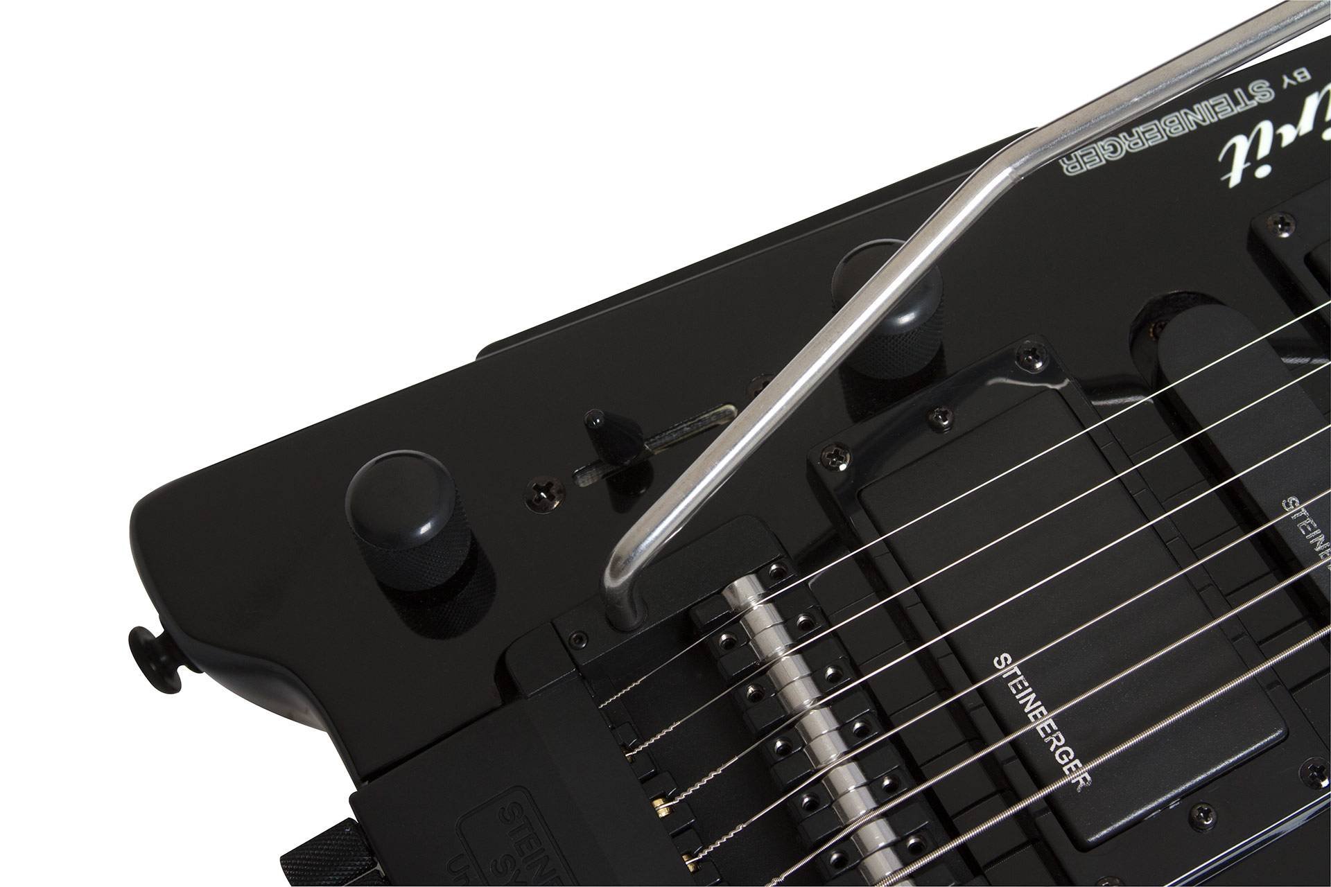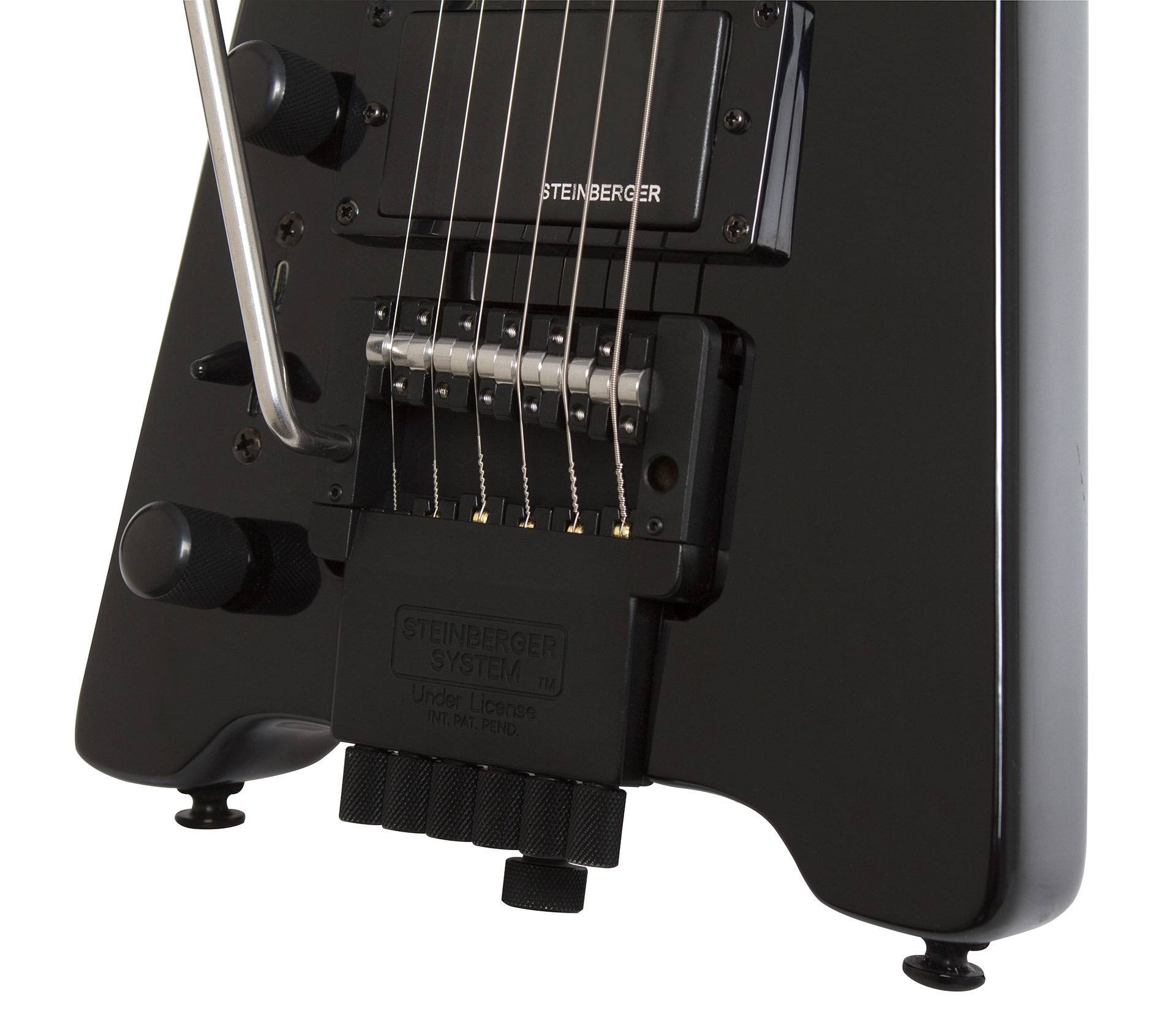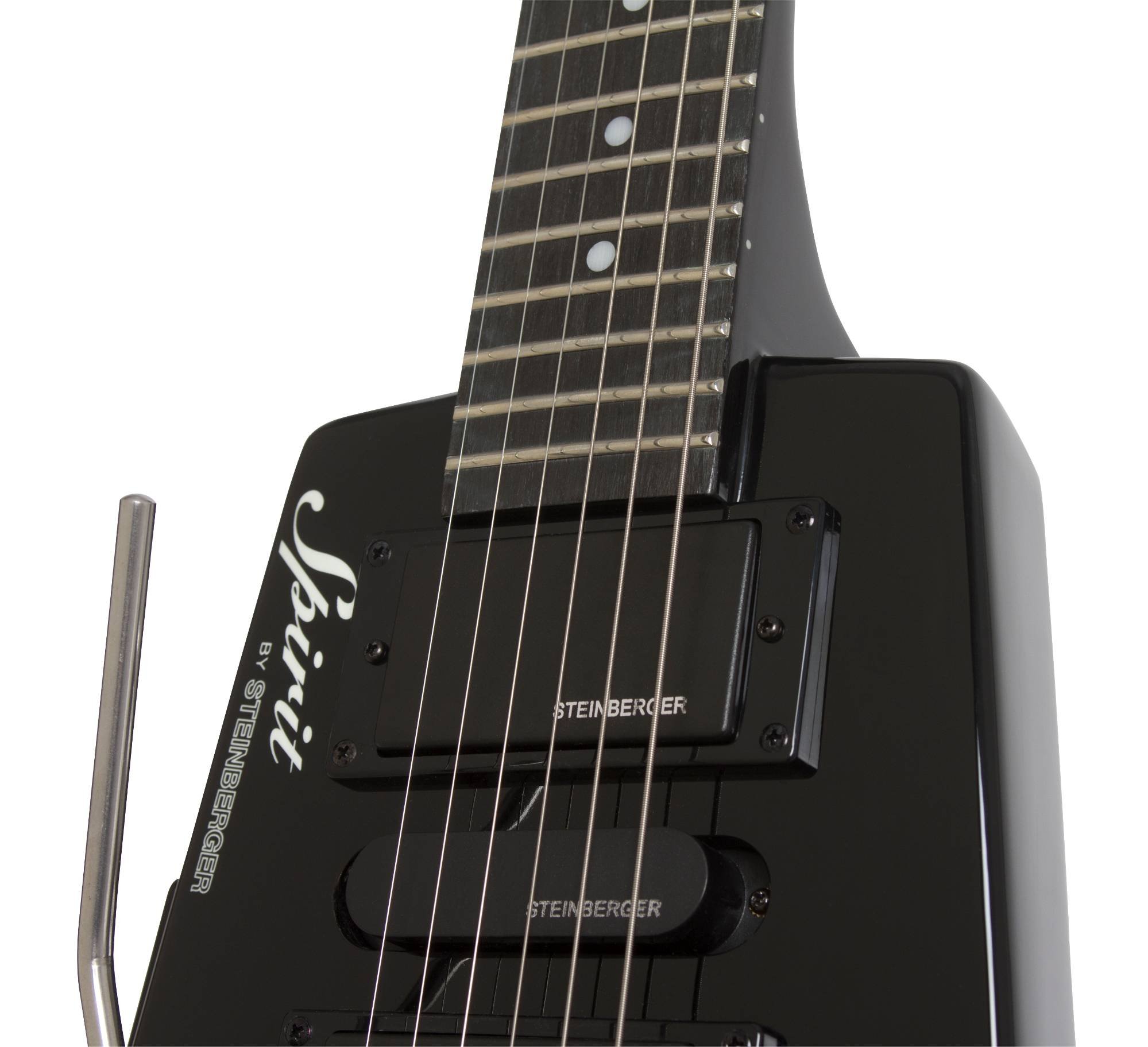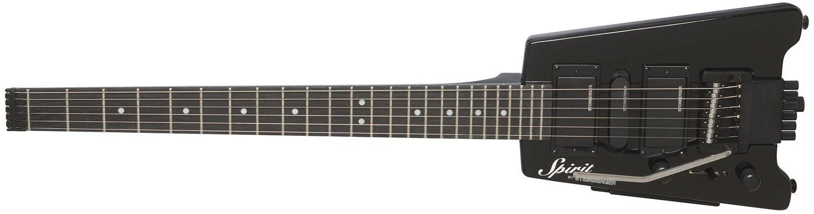 SPIRIT GT-PRO DELUXE BLACK GAUCHE + GIGBAG est une guitare électrique gauchère Solid body headless modèle STEINBERGER Spirit GT Pro Deluxe Black avec un corps en tilleul et un dessus en érable quilté AAA plaqué, un manche en érable dur 3 pièces à profil SlimTaper D '60, un doigté en bois dur ingénierie à rayon 14" avec 24 frettes Medium Jumbo en acier et des incrustations dot blanches, matériel Black, mécaniques Direct Pull avec un rapport 40:1 breveté et un pont Locking R-Trem Tremolo avec une selle en acier. L'électronique à configuration HSH, consiste en 1 micro Humbucker Steinberger HB-1 au pont, 1 micro Single-Coil Steinberger SC-1 au centre et 1 micro Humbucker Steinberger HB-2 au manche avec des contrôles de volume et de tonalité et un sélecteur de micro à 5 voies. Inclut Steinberger Gig Bag