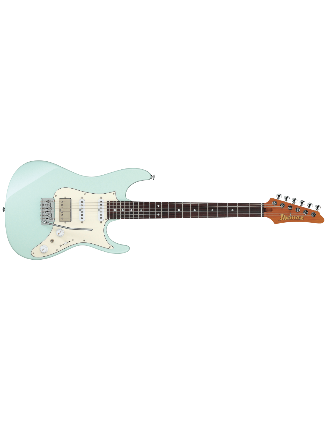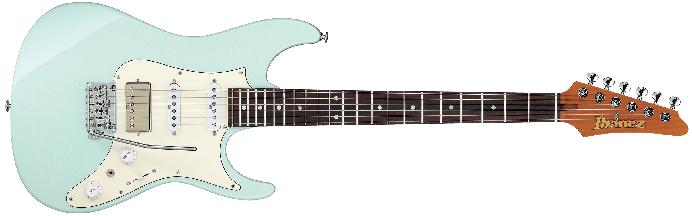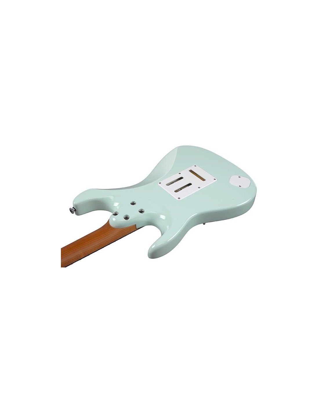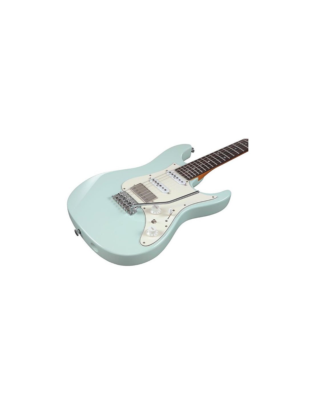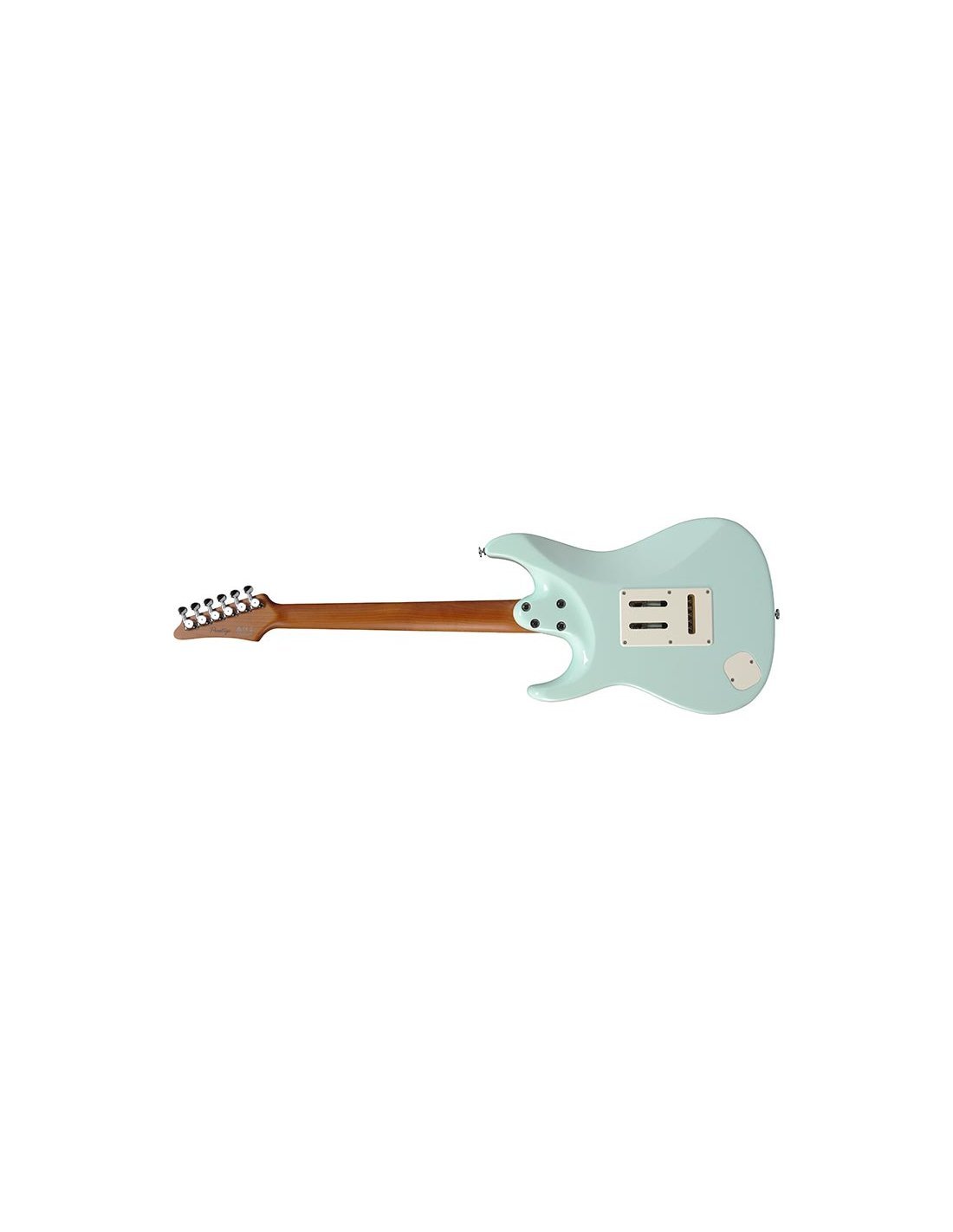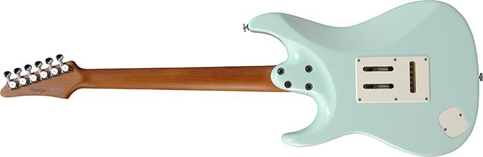IBANEZ AZ2204NW-SFB est une guitare électrique Solid body de style Strat avec un corps en tilleul, un manche AZ Oval CS-Tech Wood en érable torréfié, un doigté à rayon composé en palissandre avec 22 frettes Jumbo en acier avec traitement de bord "Prestige" et des incrustations dot en nacre, un sillet en os, du matériel chromé, des mécaniques Gotoh Magnum Lock et un pont Gotoh T1702B avec 5 ressorts et un système de trémolo à levier. L'électronique se compose de 3 micros en configuration HSS : un Humbucker Seymour Duncan Fortuna au pont et 2 Single Coil Seymour Duncan Fortuna au centre et au manche avec des contrôles de volume et de tonalité, un sélecteur de micros à 5 voies et un sélecteur Alter-Switch pour passer de la configuration Single coil à Humbucker.
