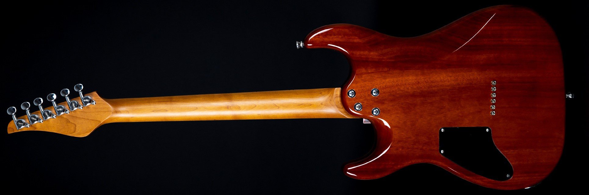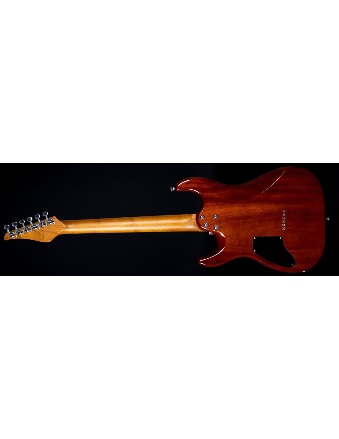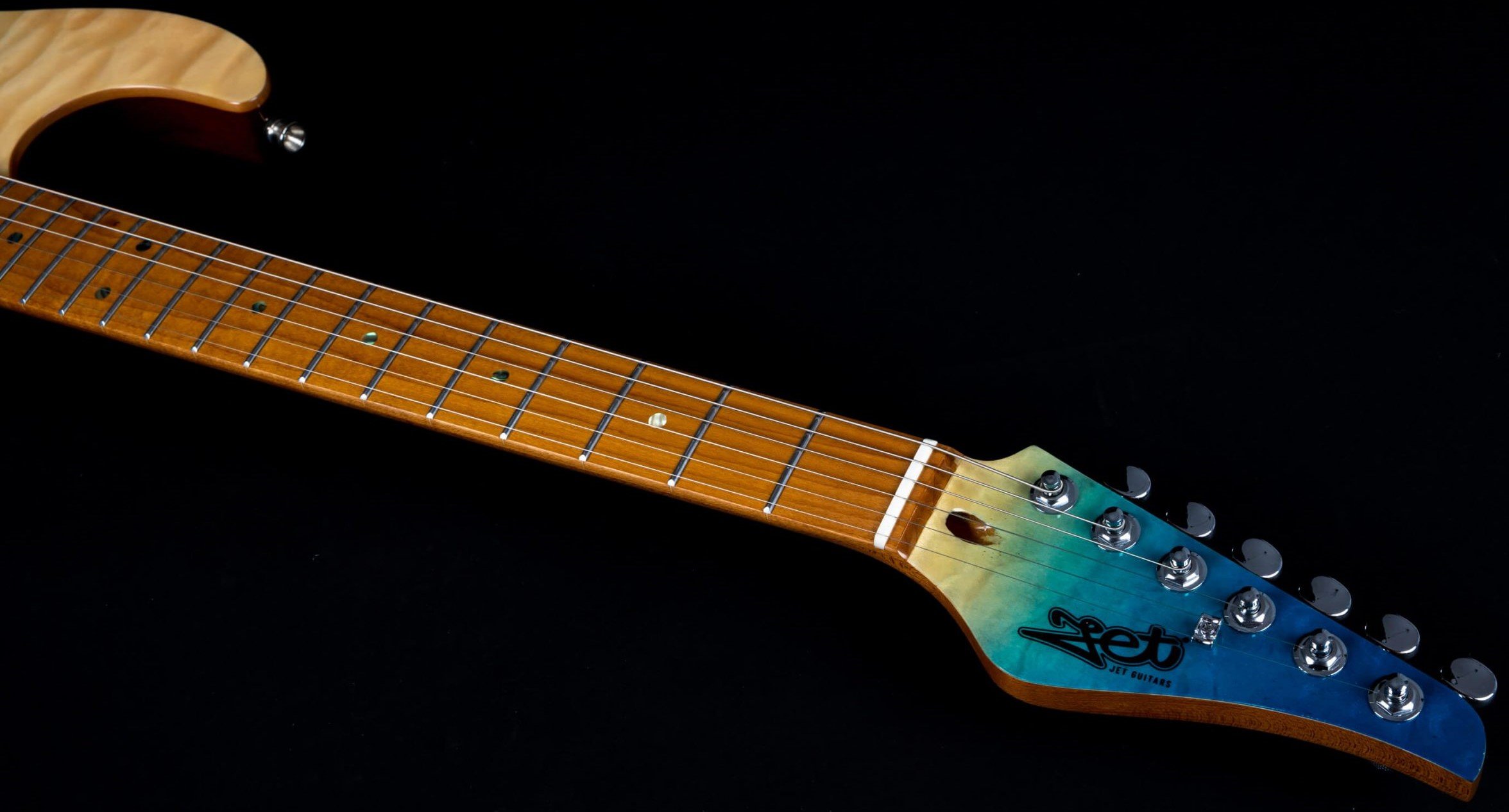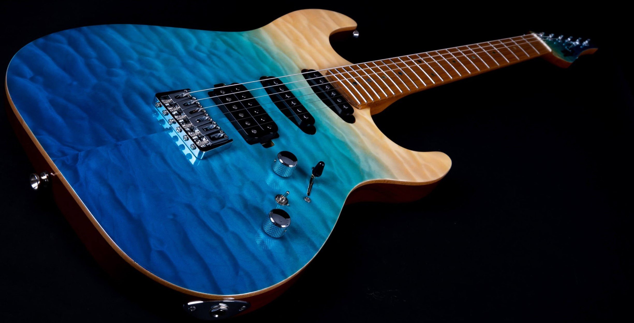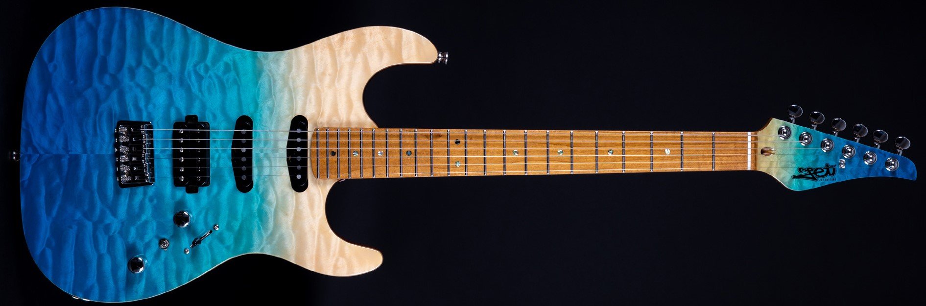 JET JS-1000Q TBL HSS QUILT TOP TRASP. BLUE est une guitare électrique solid body de la série JS-1000Q avec un corps en acajou, un top en érable Quilted, un manche en érable Roasted canadien au profil Modern C Shape, un doigté en érable Roasted à rayon 9,5" avec 22 frettes Medium Jumbo en acier inoxydable et des incrustations en points luminescents, un sillet en os, un matériel chromé, des mécaniques Locking et un pont Fixed. L'électronique à configuration HSS se compose de 1 pickup Humbucker Handwound J-87 Alnico V 8k Ohm au pont et de 2 pickups Single-Coil Alnico V au centre et au manche avec des contrôles de volume, de tonalité, un sélecteur de pickup à 5 voies et un sélecteur Split Coil.