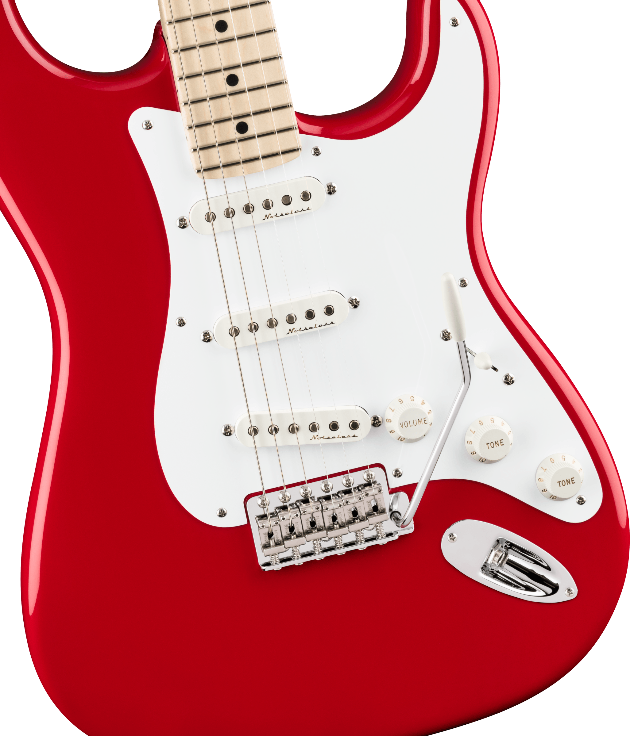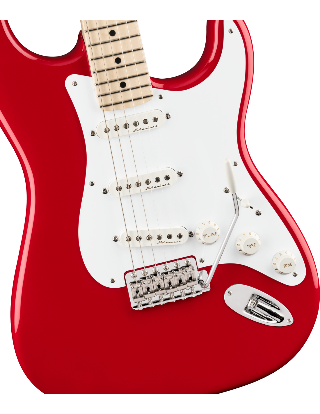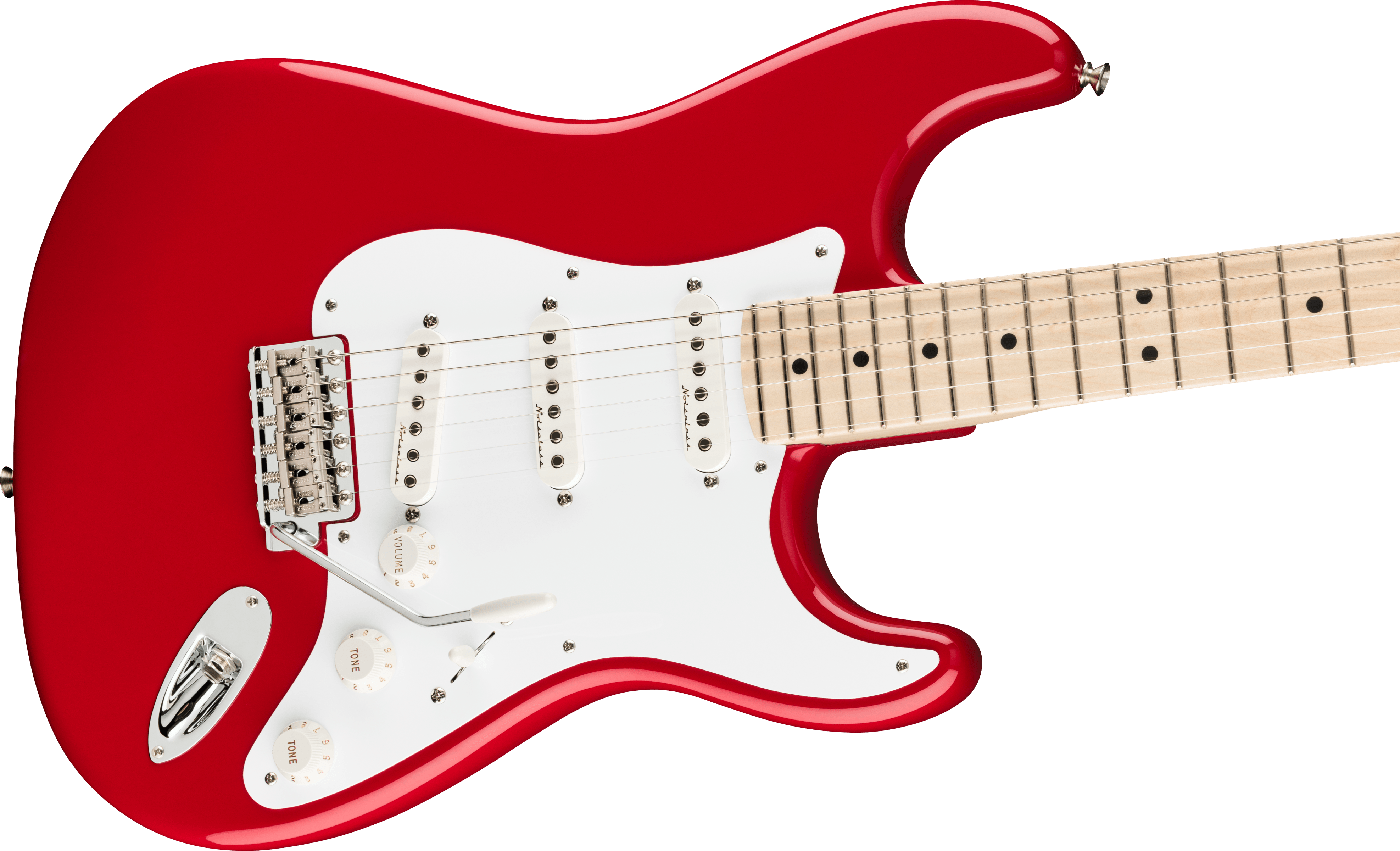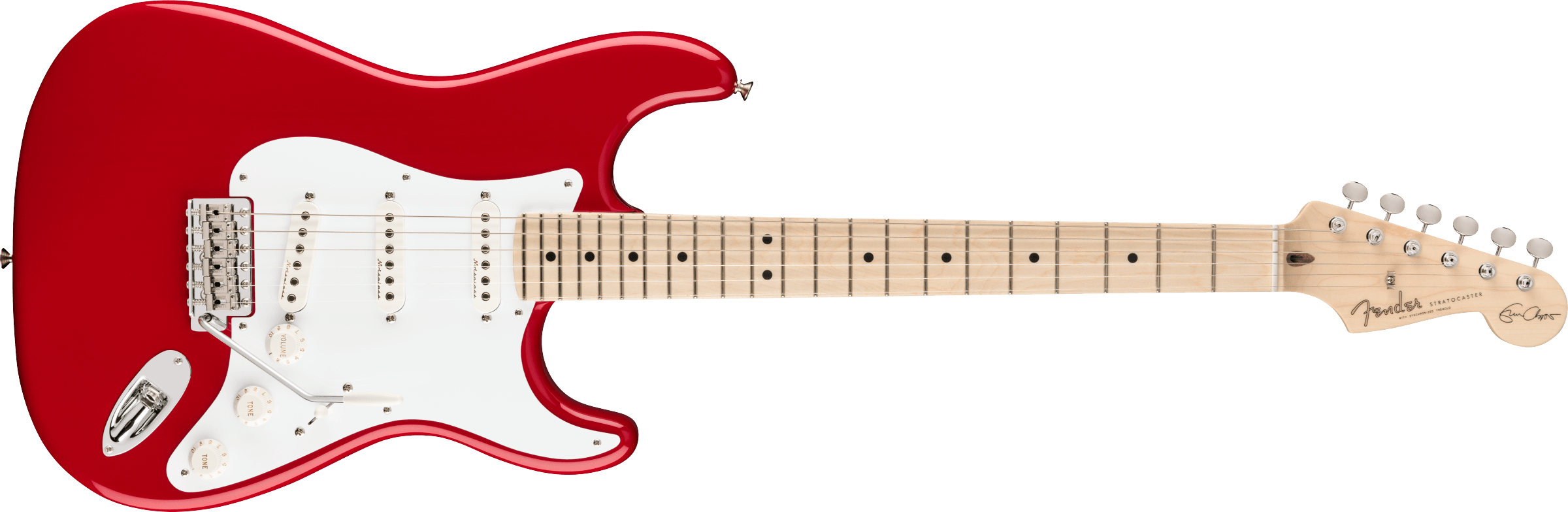 FENDER ERIC CLAPTON STRAT TORINO RED est une guitare électrique solid body Fender Stratocaster Eric Clapton Signature avec un corps en aulne, un manche en érable canadien profil Soft V Shape, un doigté en érable à rayon 9,5" avec 22 frettes Vintage Tall et des incrustations Black dots, un sillet en os synthétique, un matériel chromé, des mécaniques Vintage-Style et un pont Tremolo synchronisé 6-sellettes Vintage-Style. L'électronique active se compose de 3 micros Vintage Noiseless Single-Coil Strat avec des contrôles Master Volume, Master TBX Tone Control (Tone 1), Master Active Mid Boost 0-25dB (Tone 2), Mid Boost. Inclut un étui Fender Vintage Tweed.