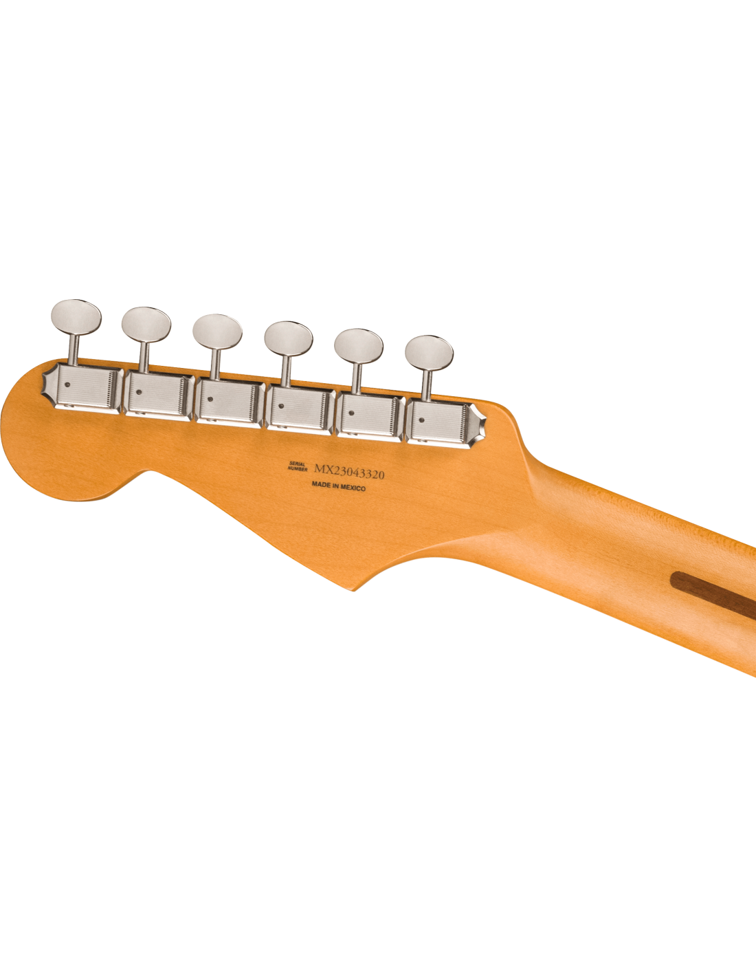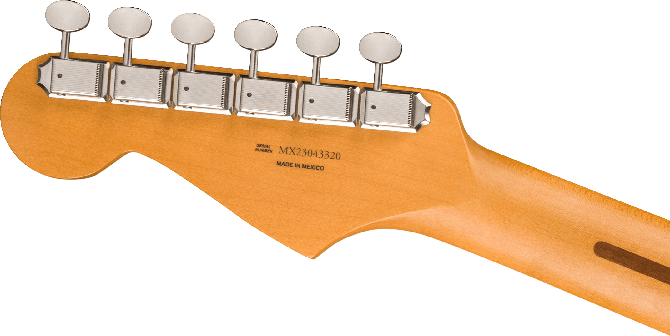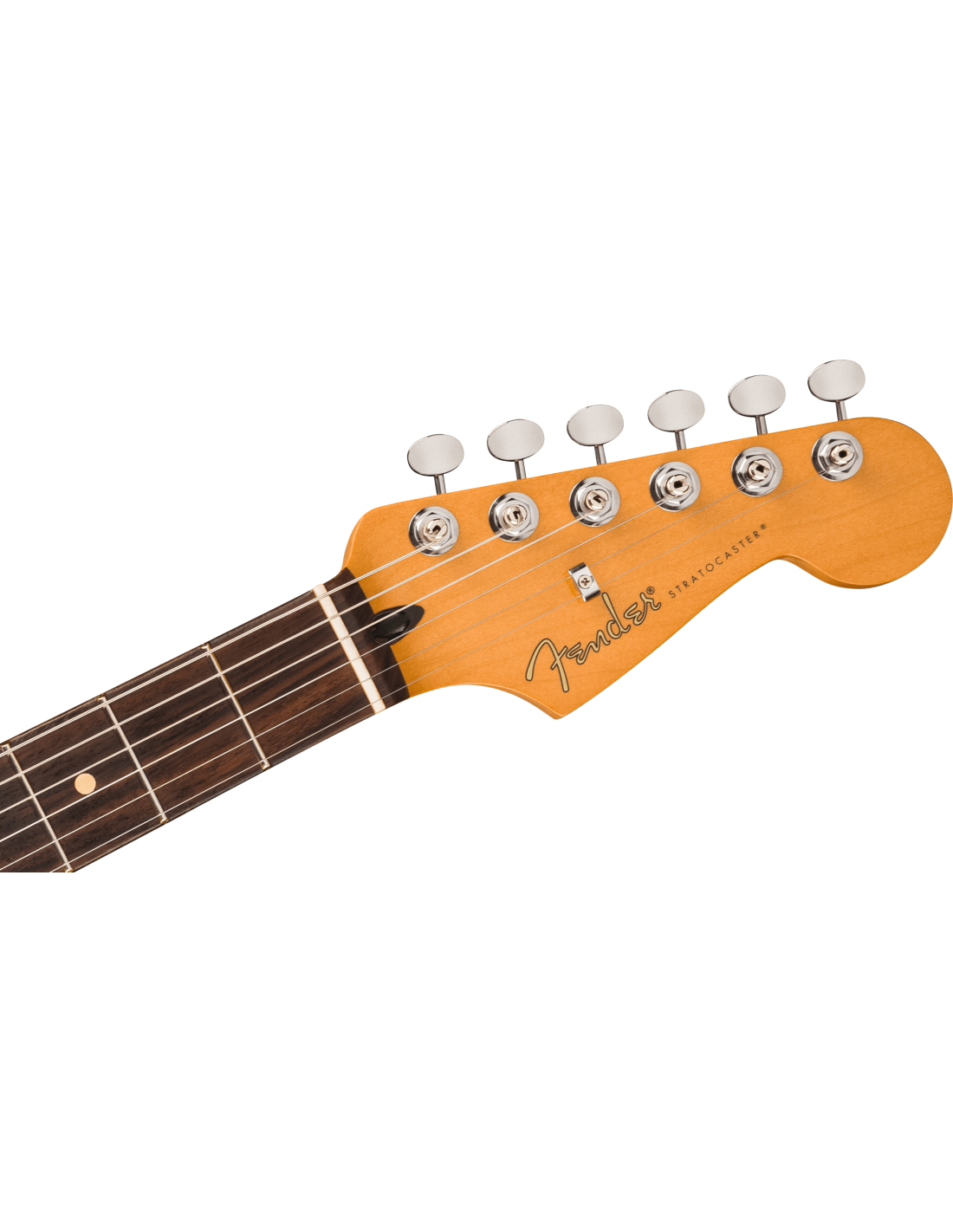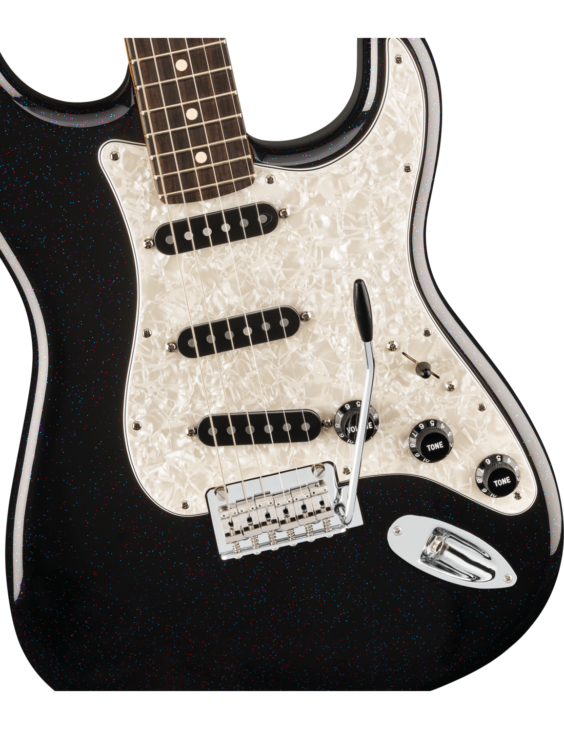 FENDER 70e ANNIVERSAIRE PLAYER STRAT NEBULA NOIR est une guitare électrique solid body, modèle 70e Anniversaire Player Stratocaster, avec un corps en Alder (aulne) et une finition Gloss Polyester, un manche en érable au profil Modern "C", un doigté en palissandre à rayon 9,5" avec 22 frettes Medium Jumbo et des repères White Dot, un sillet en os synthétique, un matériel nickelé, des mécaniques Fender ClassicGear avec un abaisse-cordes Single-Wing et un pont Tremolo Ancré en 2 Points avec des Sellettes en Acier Pliées. L'électronique à configuration SSS se compose de 3 micros Pure Vintage '59 Single-Coil Strat, avec un contrôle Master Volume, 2 contrôles de tonalité et un sélecteur de micros à 5 voies.