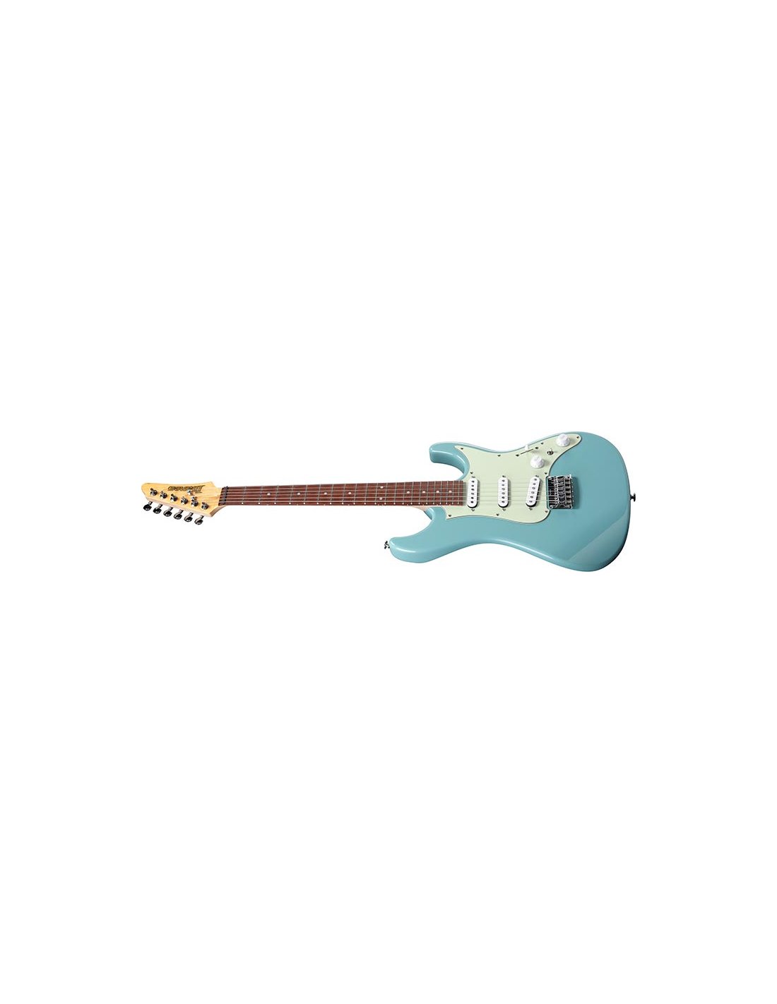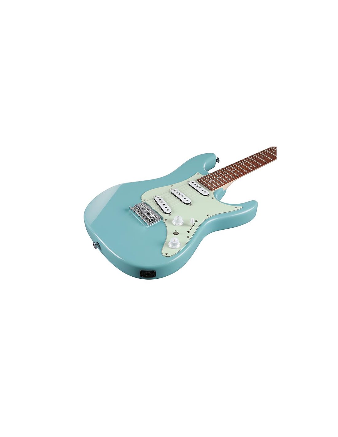 IBANEZ AZES31-PRB est une guitare électrique solid body, modèle Ibanez AZES31, avec un corps en peuplier, un manche en érable AZES, un doigté en Jatoba à rayon 9,8" avec 22 frettes Medium et des incrustations en point blanc, un sillet de 42 mm en PPS noir, un matériel chromé, des mécaniques coulées fermées chromées et un pont Ibanez F106B fixe avec des selles Confort rondes en acier. L'électronique en configuration SSS se compose de 3 micros Single-Coil Ibanez Essentials Passive/Céramique avec un contrôle de volume principal, un contrôle de tonalité principal, un interrupteur Alter pour activer le système de commutation dyna-MIX9 pour 9 variations sonores et un sélecteur de micros à 5 voies.