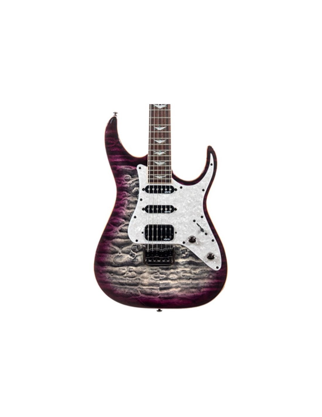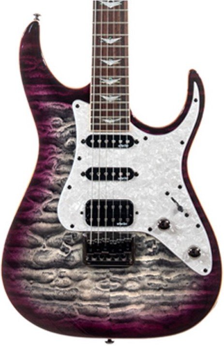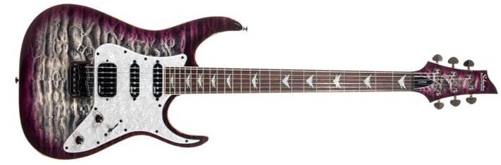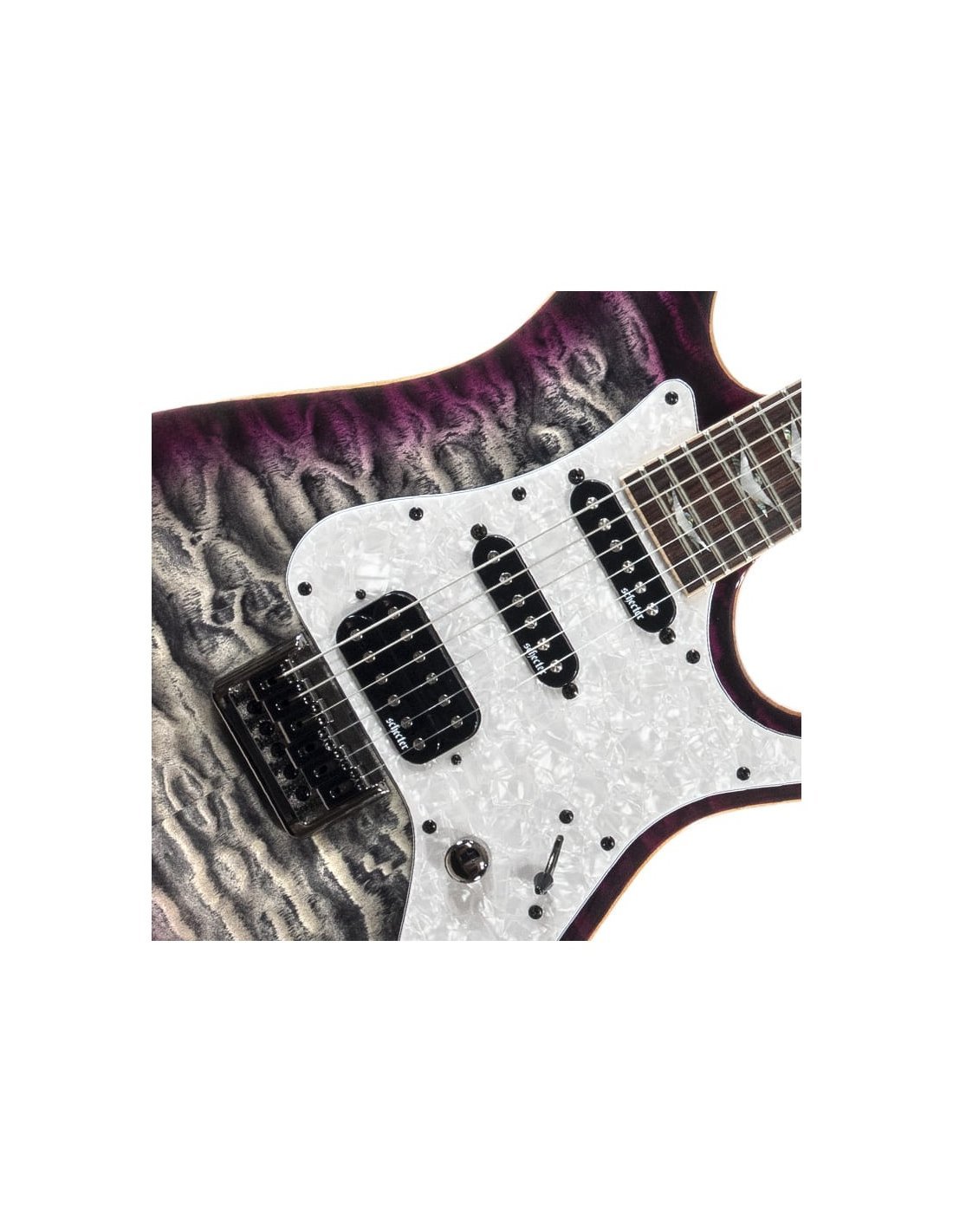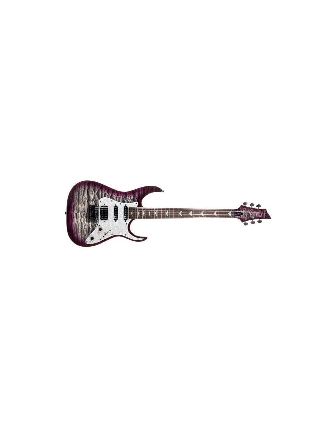 SCHECTER BANSHEE EXTREME 6 TR AURORA BURST RW est une guitare électrique solid body, modèle Schecter Banshee Extreme 6 TR, avec un corps en Acajou et un Top en Érable Quilté, un manche en Érable à profil Ultra Thin-C, un touche en Palissandre à rayon 16" avec 24 frettes X-Jumbo et des incrustations Pearloid & Abalone Vector, un sillet Graph Tech XL Black Tusq, un Truss Rod à double action, du matériel Black Chrome, des mécaniques Schecter et un pont fixe Schecter Custom Hardtail w/ String Thru Body. L'électronique à configuration HSS consiste en 1 micro Humbucker Schecter Diamond Plus au pont et 2 micros Schecter Diamond Single Coil au centre et au manche avec un contrôle Master Volume, Master Tone avec push/pull et un sélecteur de micro à 5 voies.