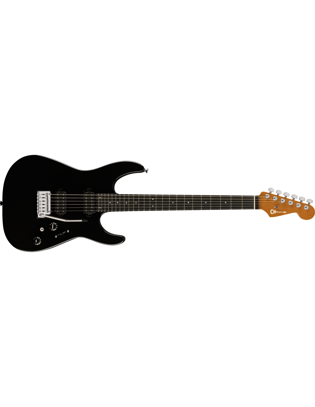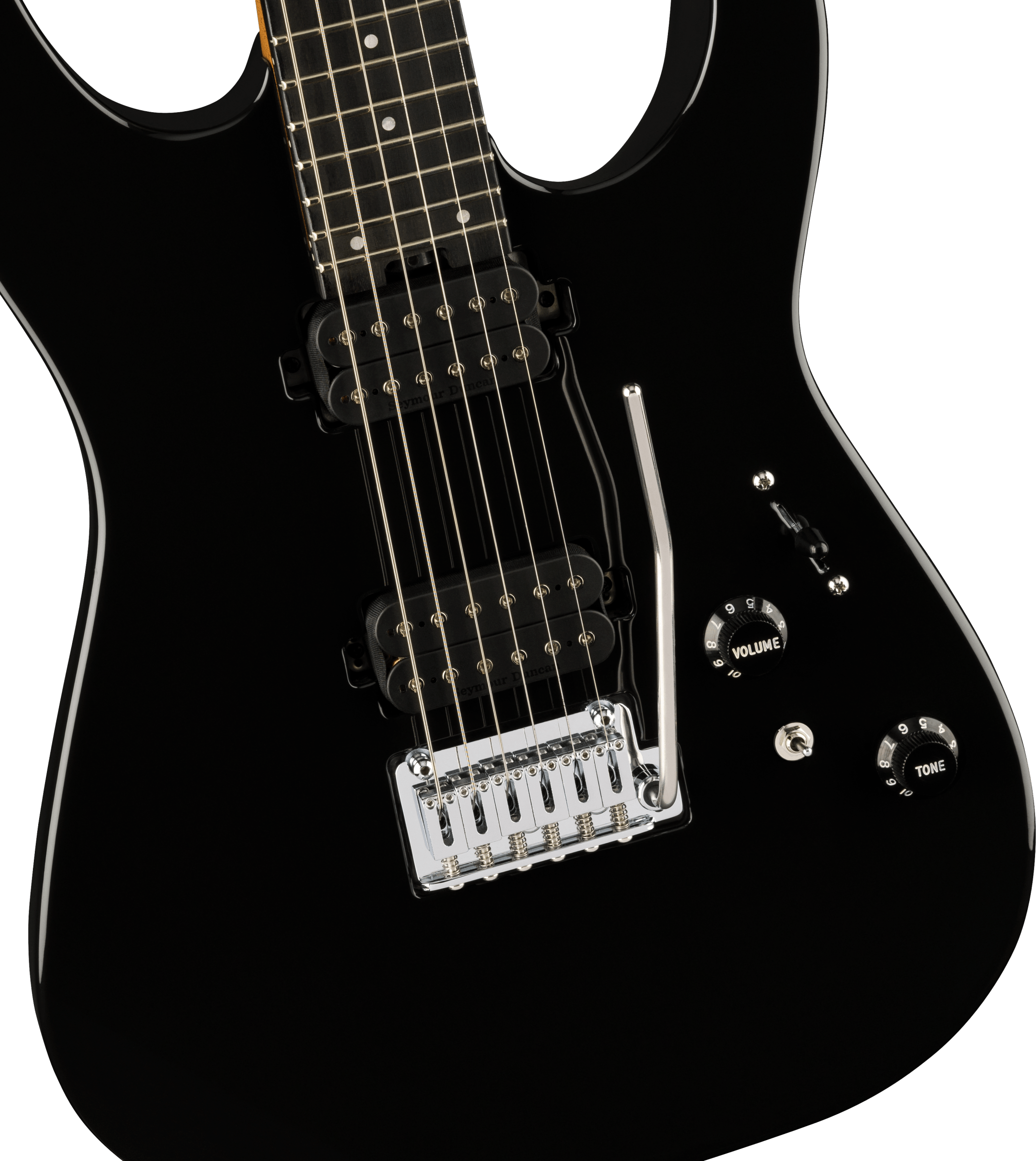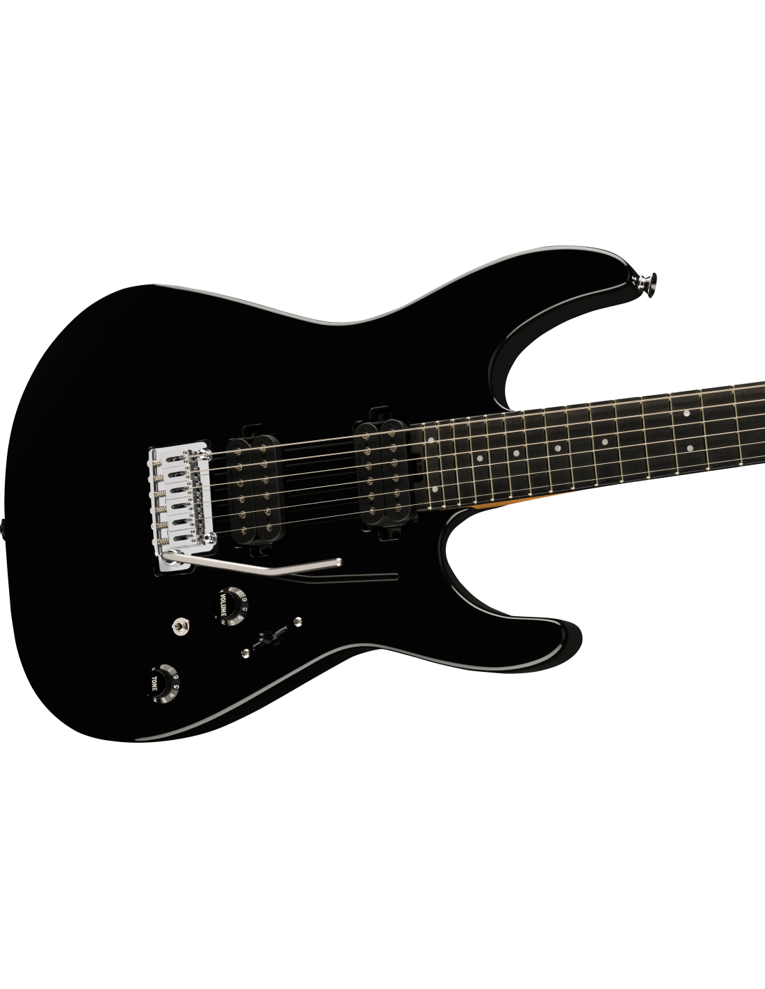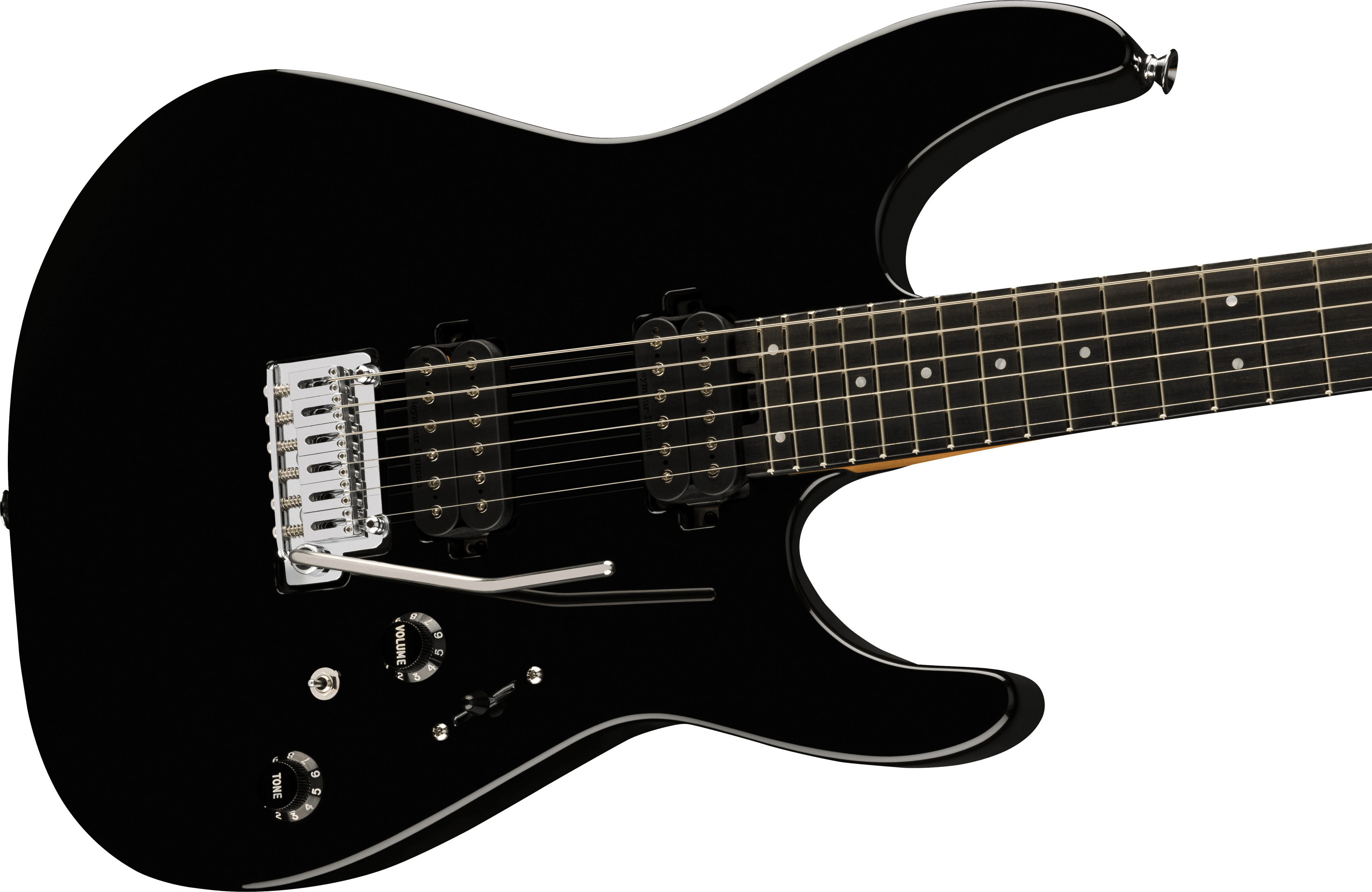 CHARVEL PRO MOD DK24 HH 2PT EBONY est une guitare électrique solid body au format Dinky, série Pro-Mod DK24 avec un corps en aulne (ontano) brillant, un manche en érable caramélisé au profil Speed Neck avec bords arrondis et renfort en graphite, un touche en ébène à rayon composite 12"-16" avec 24 frettes Jumbo et des incrustations Pearloid Dots avec points latéraux Luminlay, un sillet Graph Tech TUSQ XL, un matériel chromé, des mécaniques Charvel-Branded moulées sous pression Style Skirt Stratocaster, un guide de cordes Fender Standard String Guide et un pont Gotoh Custom 510 Tremolo. L'électronique à configuration HH, consiste en 1 micro humbucker Seymour Duncan Full Shred TB-10 au chevalet et 1 micro Seymour Duncan Alnico II Pro APH-1N au manche, des potentiomètres 500K EVH Bourns, contrôle du volume, du ton, un sélecteur de micro à 5 positions et un Mini Toggle à 2 positions de sélection de la configuration des micros en série/parallèle.