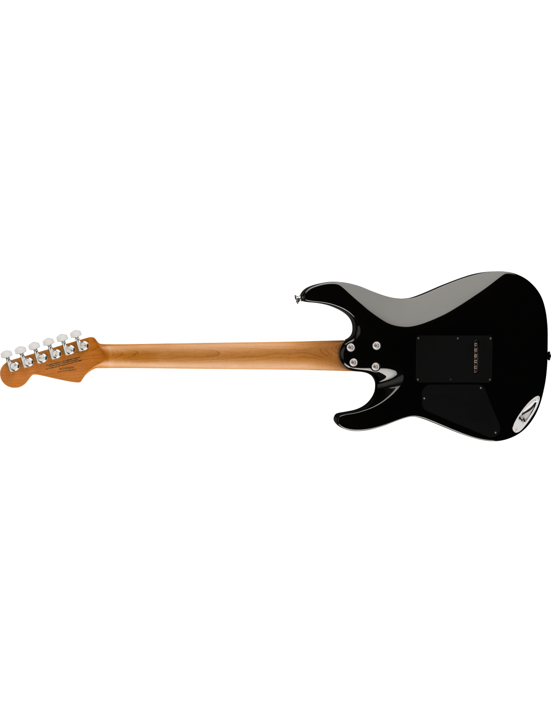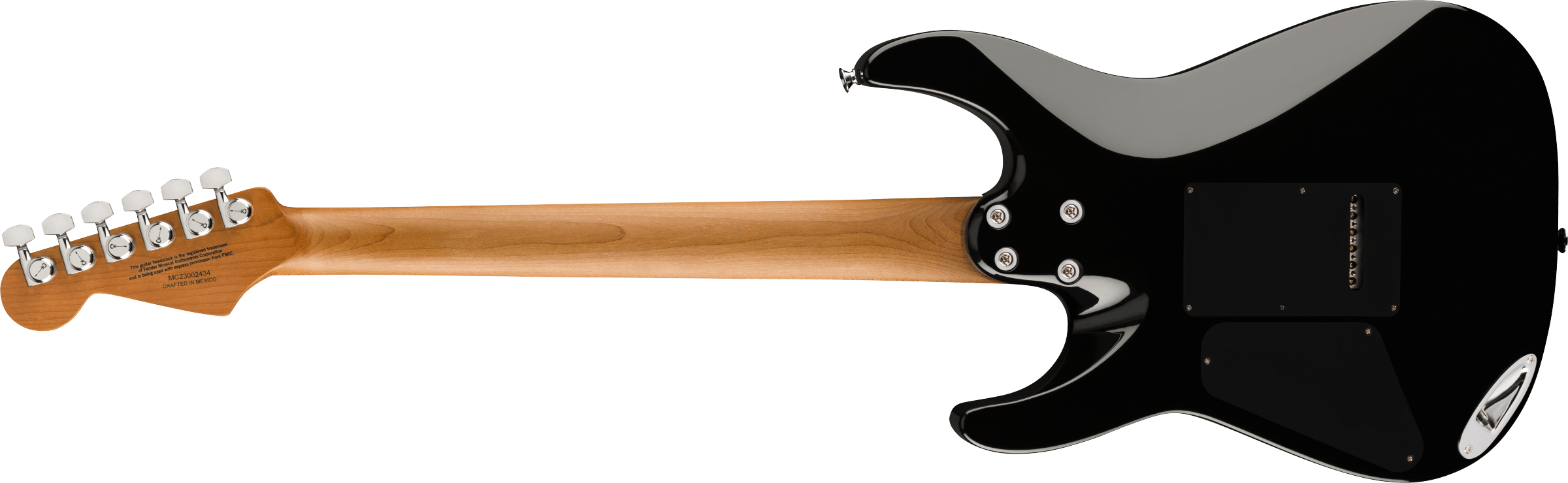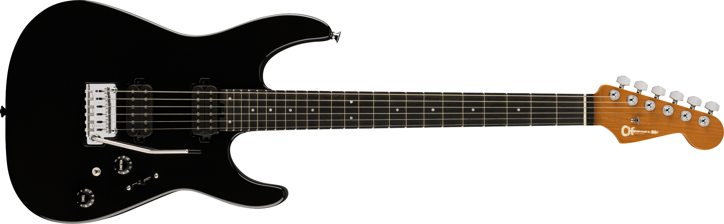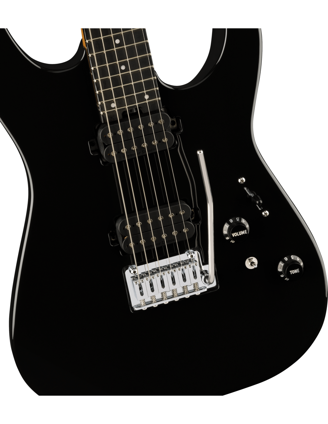 CHARVEL PRO MOD DK24 HH 2PT EBONY est une guitare électrique solid body au format Dinky, série Pro-Mod DK24 avec un corps en aulne (ontano) brillant, un manche en érable caramélisé au profil Speed Neck avec bords arrondis et renfort en graphite, un touche en ébène à rayon composite 12"-16" avec 24 frettes Jumbo et des incrustations Pearloid Dots avec points latéraux Luminlay, un sillet Graph Tech TUSQ XL, un matériel chromé, des mécaniques Charvel-Branded moulées sous pression Style Skirt Stratocaster, un guide de cordes Fender Standard String Guide et un pont Gotoh Custom 510 Tremolo. L'électronique à configuration HH, consiste en 1 micro humbucker Seymour Duncan Full Shred TB-10 au chevalet et 1 micro Seymour Duncan Alnico II Pro APH-1N au manche, des potentiomètres 500K EVH Bourns, contrôle du volume, du ton, un sélecteur de micro à 5 positions et un Mini Toggle à 2 positions de sélection de la configuration des micros en série/parallèle.