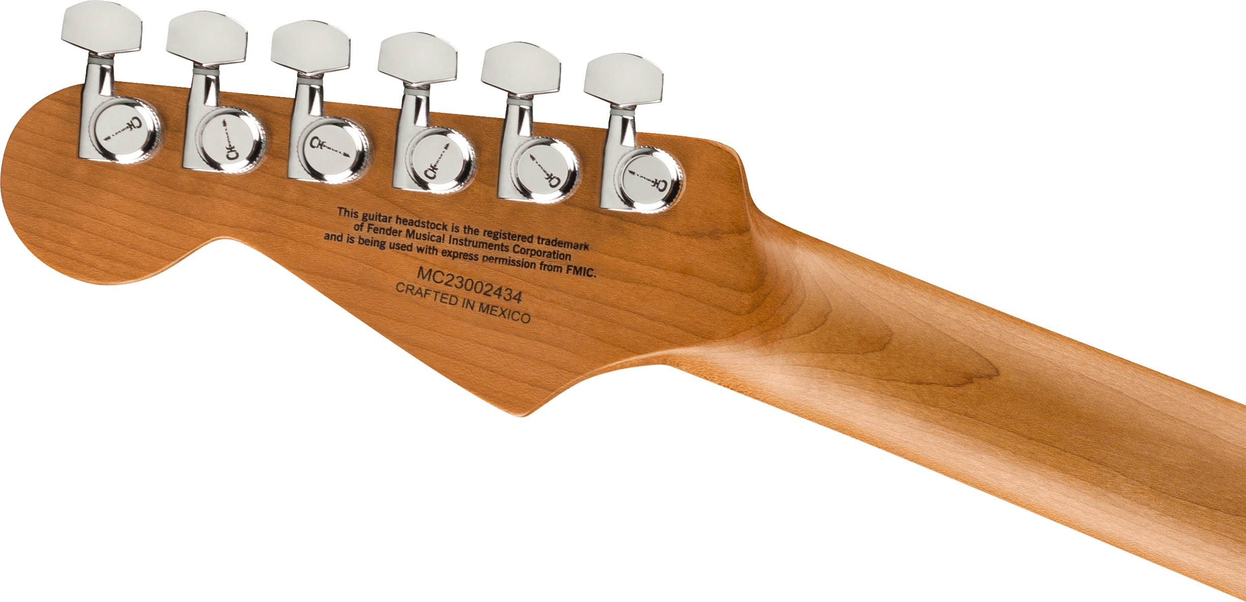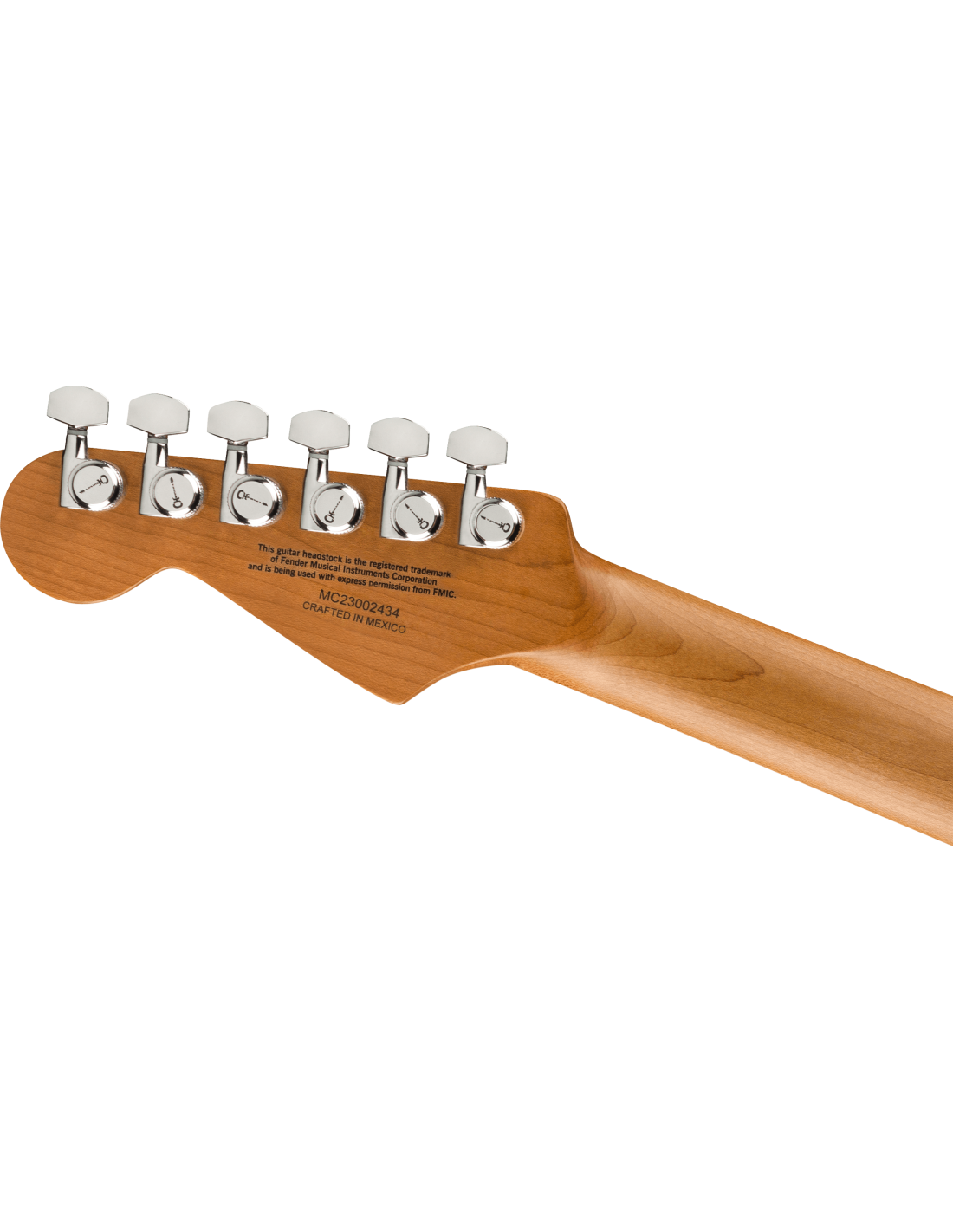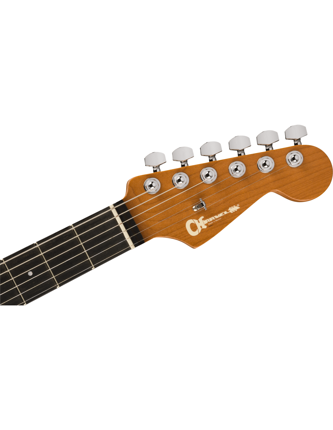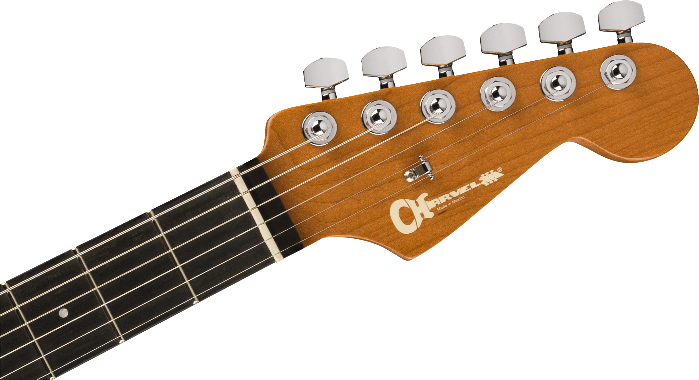 CHARVEL PRO MOD DK24 HH 2PT EBONY est une guitare électrique solid body au format Dinky, série Pro-Mod DK24 avec un corps en aulne (ontano) brillant, un manche en érable caramélisé au profil Speed Neck avec bords arrondis et renfort en graphite, un touche en ébène à rayon composite 12"-16" avec 24 frettes Jumbo et des incrustations Pearloid Dots avec points latéraux Luminlay, un sillet Graph Tech TUSQ XL, un matériel chromé, des mécaniques Charvel-Branded moulées sous pression Style Skirt Stratocaster, un guide de cordes Fender Standard String Guide et un pont Gotoh Custom 510 Tremolo. L'électronique à configuration HH, consiste en 1 micro humbucker Seymour Duncan Full Shred TB-10 au chevalet et 1 micro Seymour Duncan Alnico II Pro APH-1N au manche, des potentiomètres 500K EVH Bourns, contrôle du volume, du ton, un sélecteur de micro à 5 positions et un Mini Toggle à 2 positions de sélection de la configuration des micros en série/parallèle.