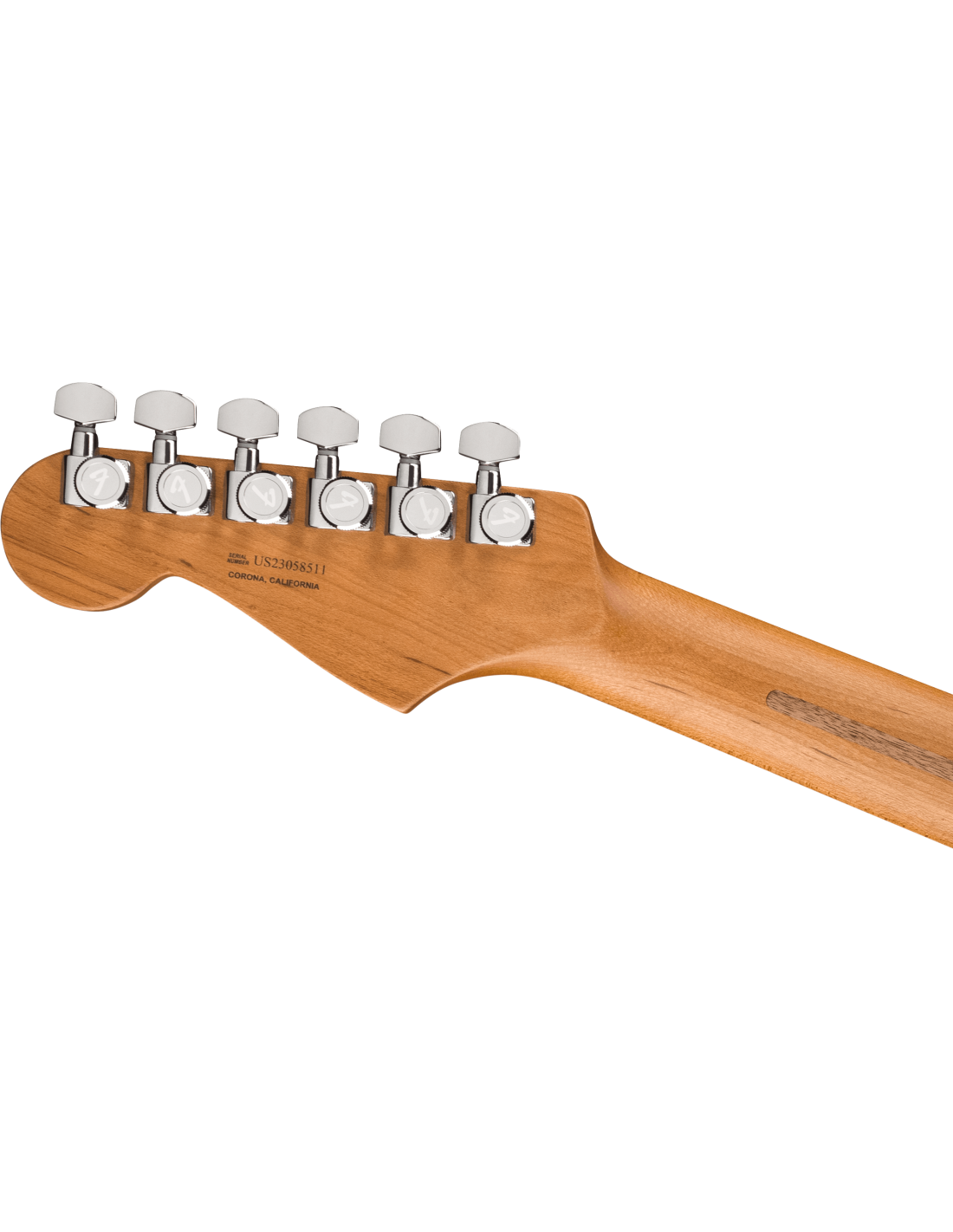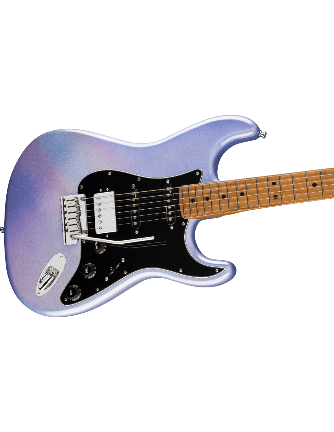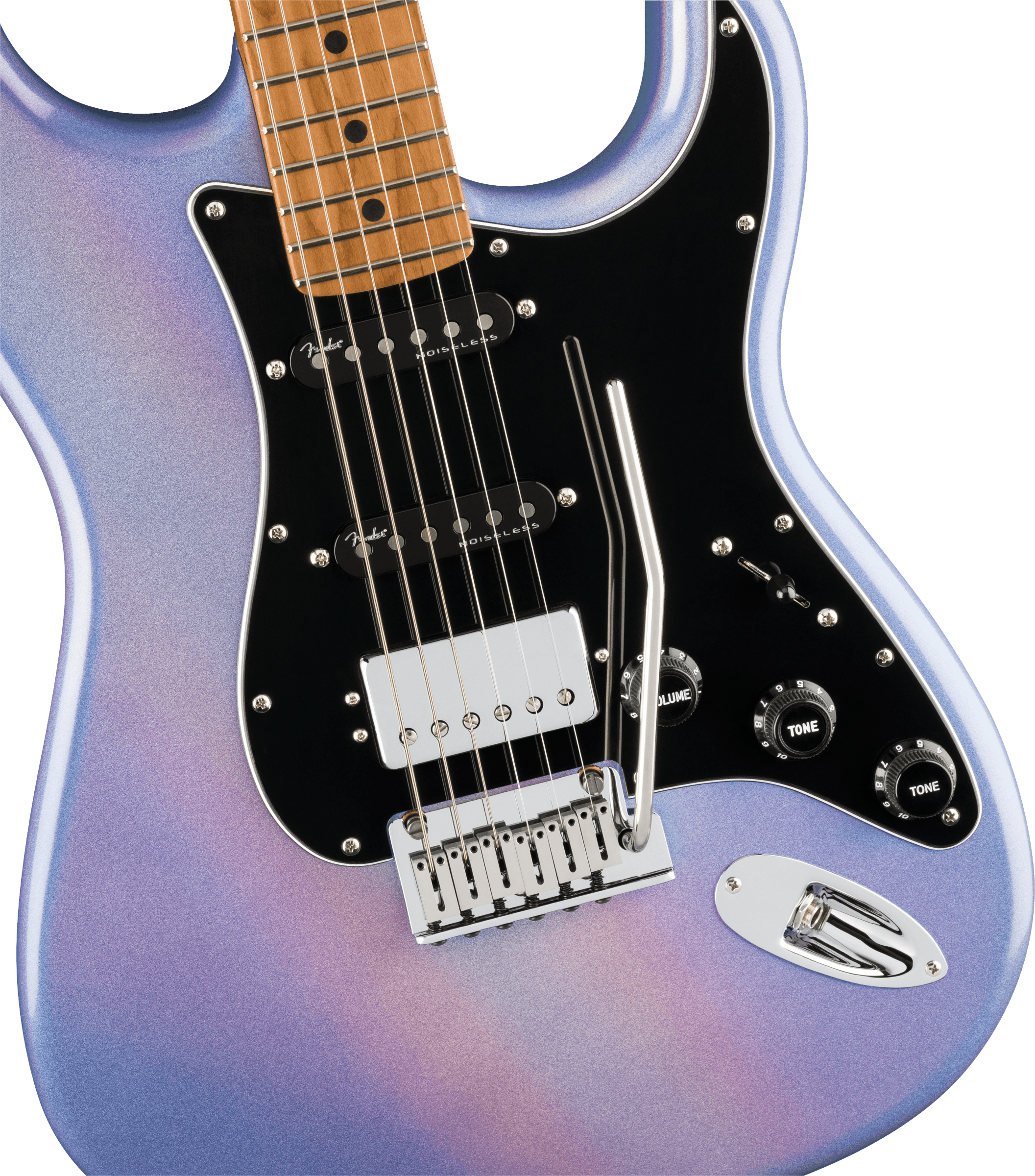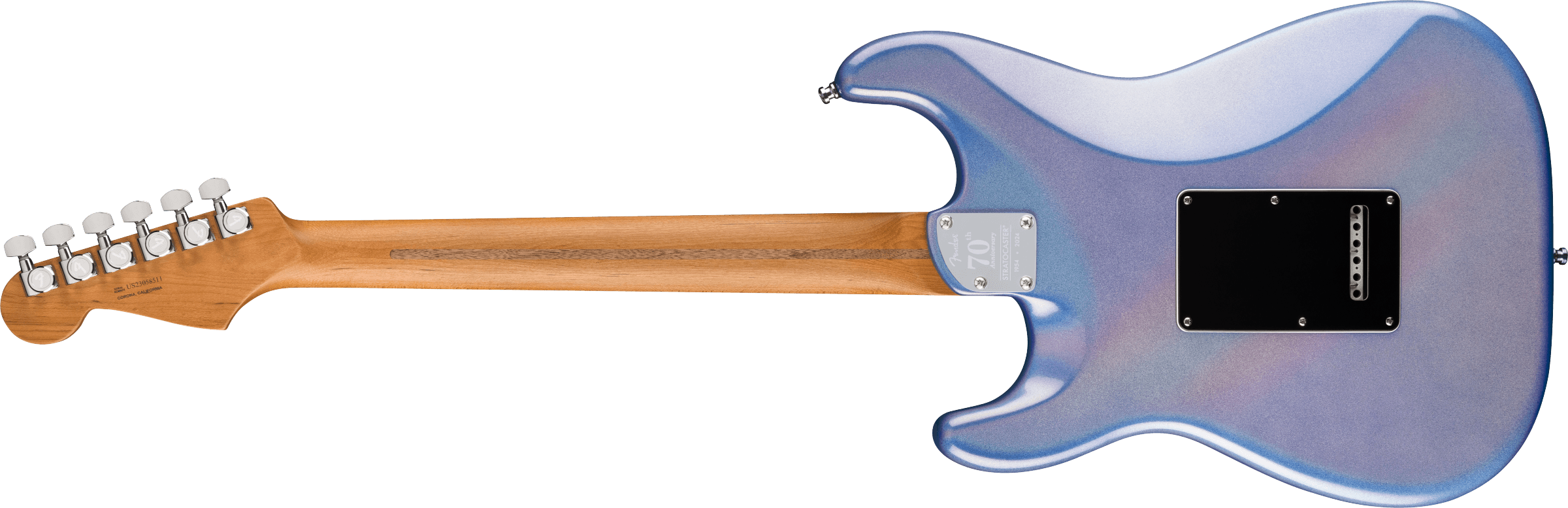 FENDER 70TH ANNIVERSARY ULTRA MN AMETHYST est une guitare électrique solid body, modèle 70th Anniversary Ultra Stratocaster HSS, avec un corps en Alder (aulne) et une finition Gloss Uretane, un manche en érable Roasted à profil Modern "D", un doigté en érable à rayon composite 10"-14" avec 22 frettes Medium Jumbo et des incrustations Black Pearloid Dots, Truss Rod Bi-Flex, un sillet en os synthétique, un matériel nickelé, des mécaniques Fender Deluxe Cast/Sealed Locking avec un abaisse-cordes Single-Wing et un pont Tremolo Ancré en 2 Points avec bras Pop-in. L'électronique à configuration HSS consiste en 1 micro humbucker 70th Anniversary Ultra Quadra Tap au pont et 2 micros 70th Anniversary Ultra Noiseless Strat au centre et au manche, avec un contrôle Master Volume avec S-1 Switch pour le Coil Split du micro humbucker, 2 contrôles de tonalité avec S-1 Switch sur la tonalité 1 pour l'activation de Hot Voicing et un sélecteur de micro à 5 voies. Inclut une Deluxe Black Tweed Hardshell avec logo 70th Anniversary brodé.