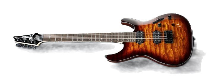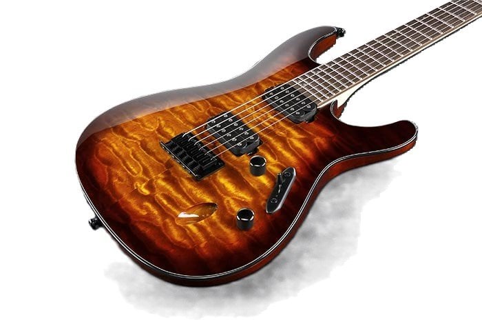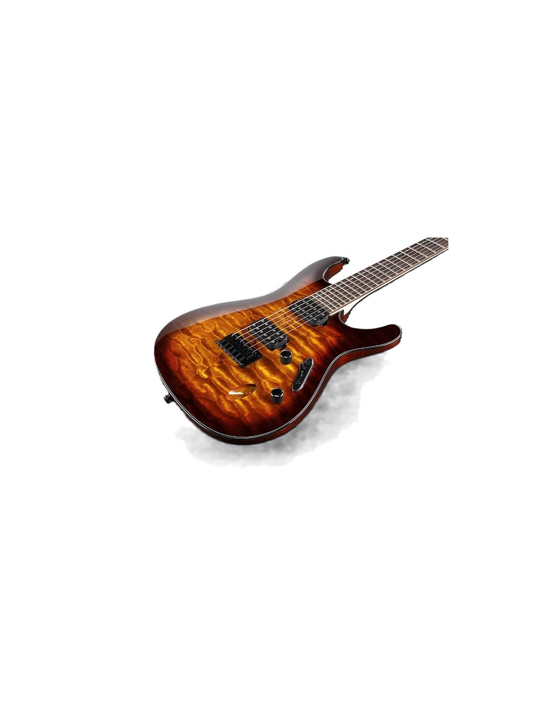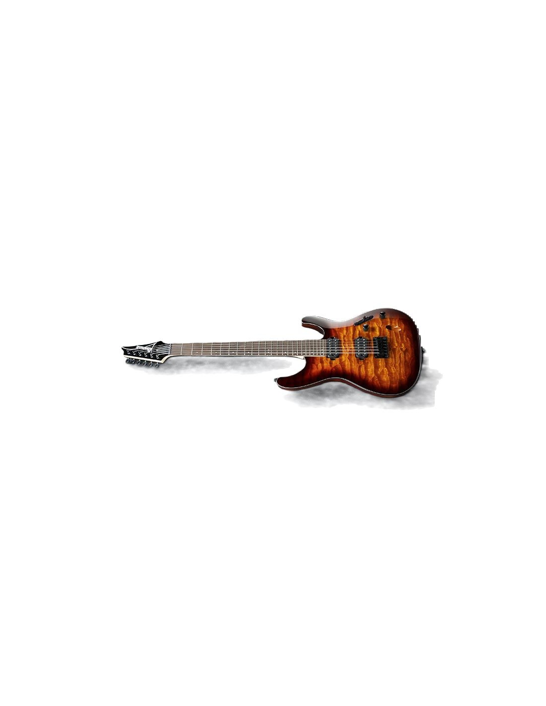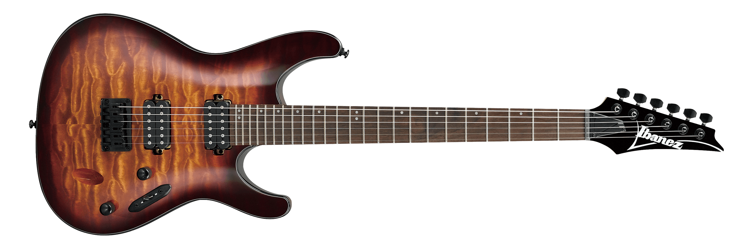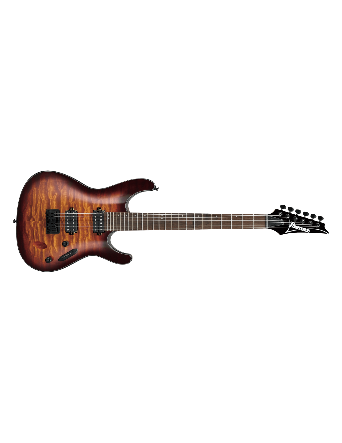 IBANEZ S621QM-DEB est une guitare électrique solid body, modèle Ibanez S Standard S621QM, avec un corps en Meranti et un top en Érable Quilté, un manche en Érable au profil Wizard III, un touche en Palissandre à rayon 16" avec 24 frettes Jumbo et des incrustations White dot inlay Off-set, un sillet en PPS R400 de 43mm, un matériel Black, des mécaniques Ibanez sous pression à clés petites Black et un pont fixe Ibanez F106. L'électronique à configuration HH, consiste en 2 micros Humbucker Quantum Passive/Céramique au pont et au manche avec des contrôles Master Volume, contrôle Master Tone, et un sélecteur de micros à 5 voies.