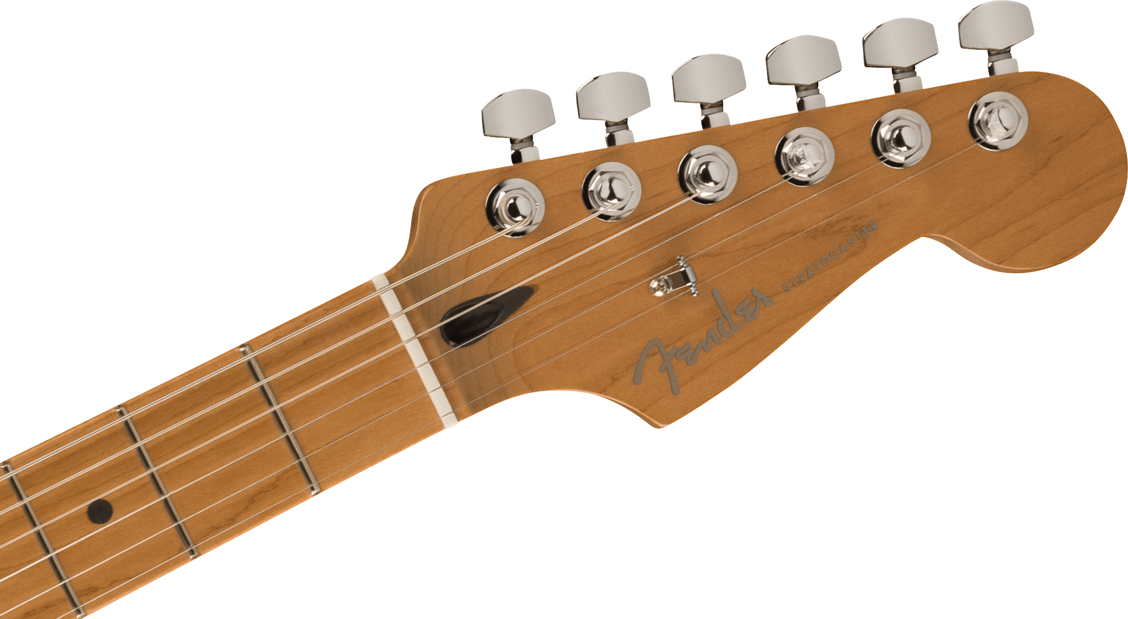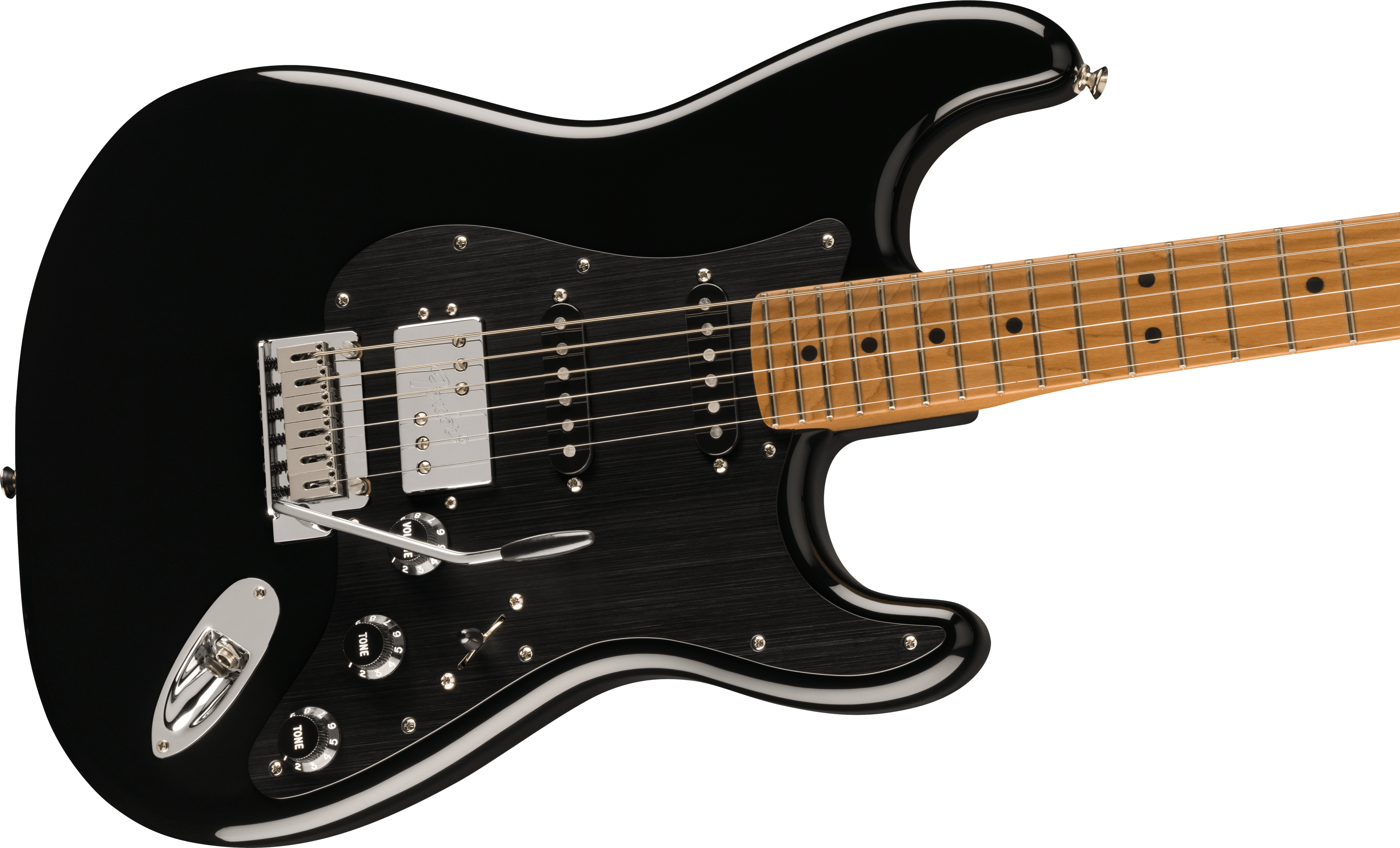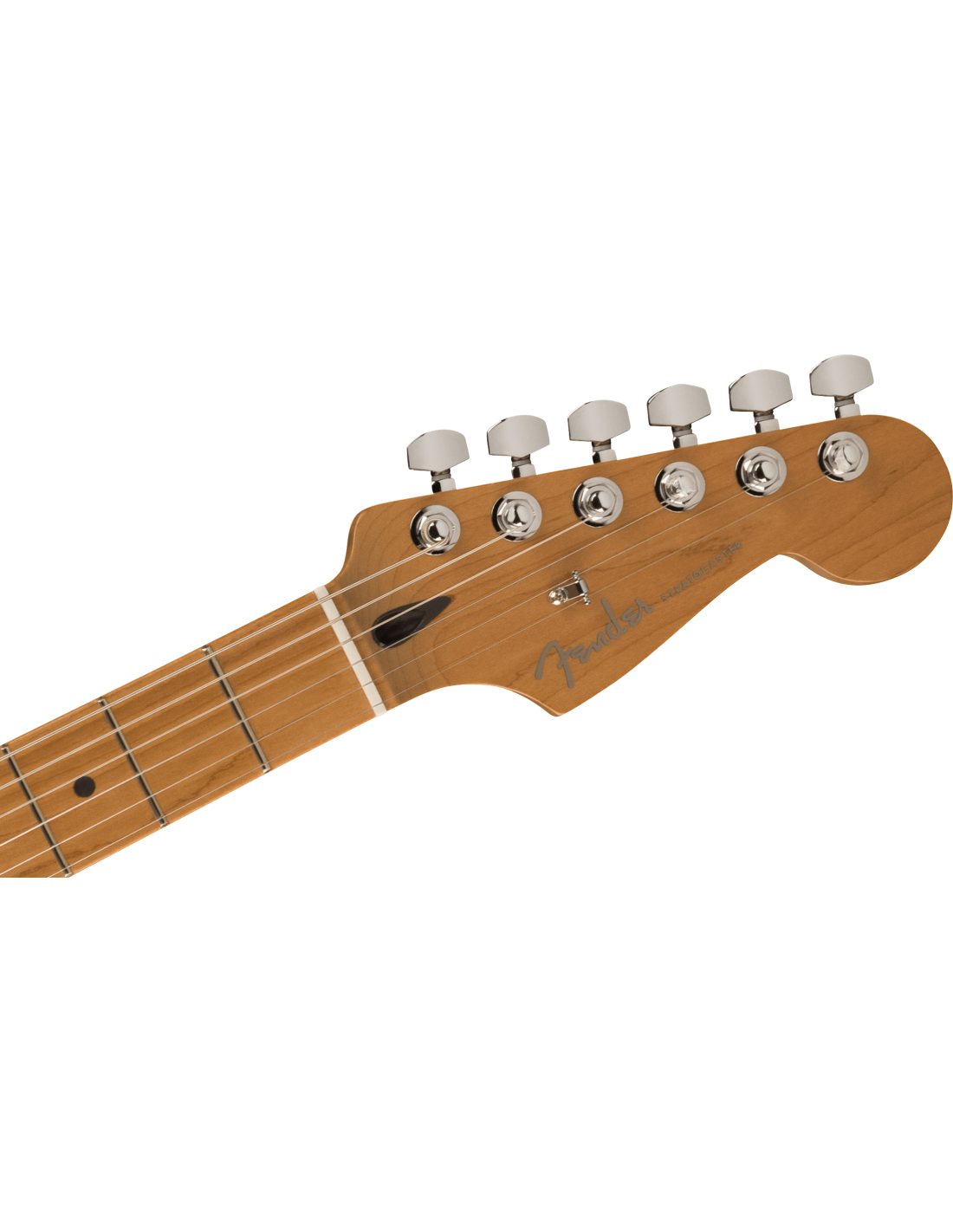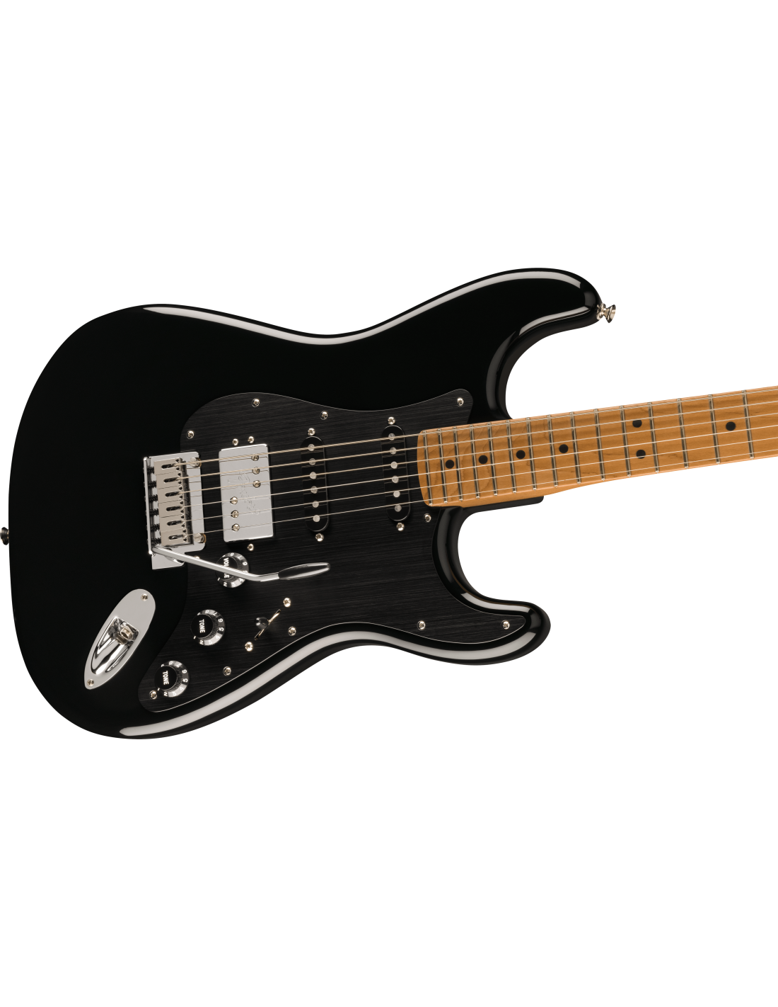 FENDER DE PLAYER PLUS HSS ROASTED MN BLACK est une guitare électrique solid body, modèle Limited Edition Player Plus Stratocaster HSS, avec un corps en Alder (ontan) et une finition Gloss Polyester, un manche en érable Roasted à profil Modern "C", une touche en érable Roasted à rayon 12" avec 22 frettes Medium Jumbo et des incrustations Black Dots avec points latéraux Black, Truss Standard, sillet en os synthétique, matériel nickelé, mécaniques Fender Deluxe Cast/Sealed Locking et un pont Tremolo synchronisé en 2 points avec des sellets Block. L'électronique en configuration HSS, consiste en 1 micro Humbucker Player Plus Shawbucker 1 au pont et 2 micros Single Coil Player Plus Pure Vintage '65 Gray-Bottom au centre et au manche, avec contrôle Master Volume, 2 contrôles de tonalité avec Push/Pull sur la tonalité 1 pour le splitting de la bobine du micro humbucker et sélecteur de micro à 5 voies. Inclut Deluxe Bag