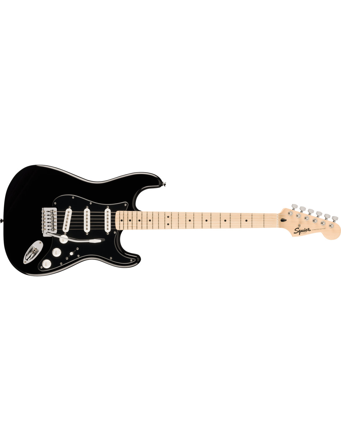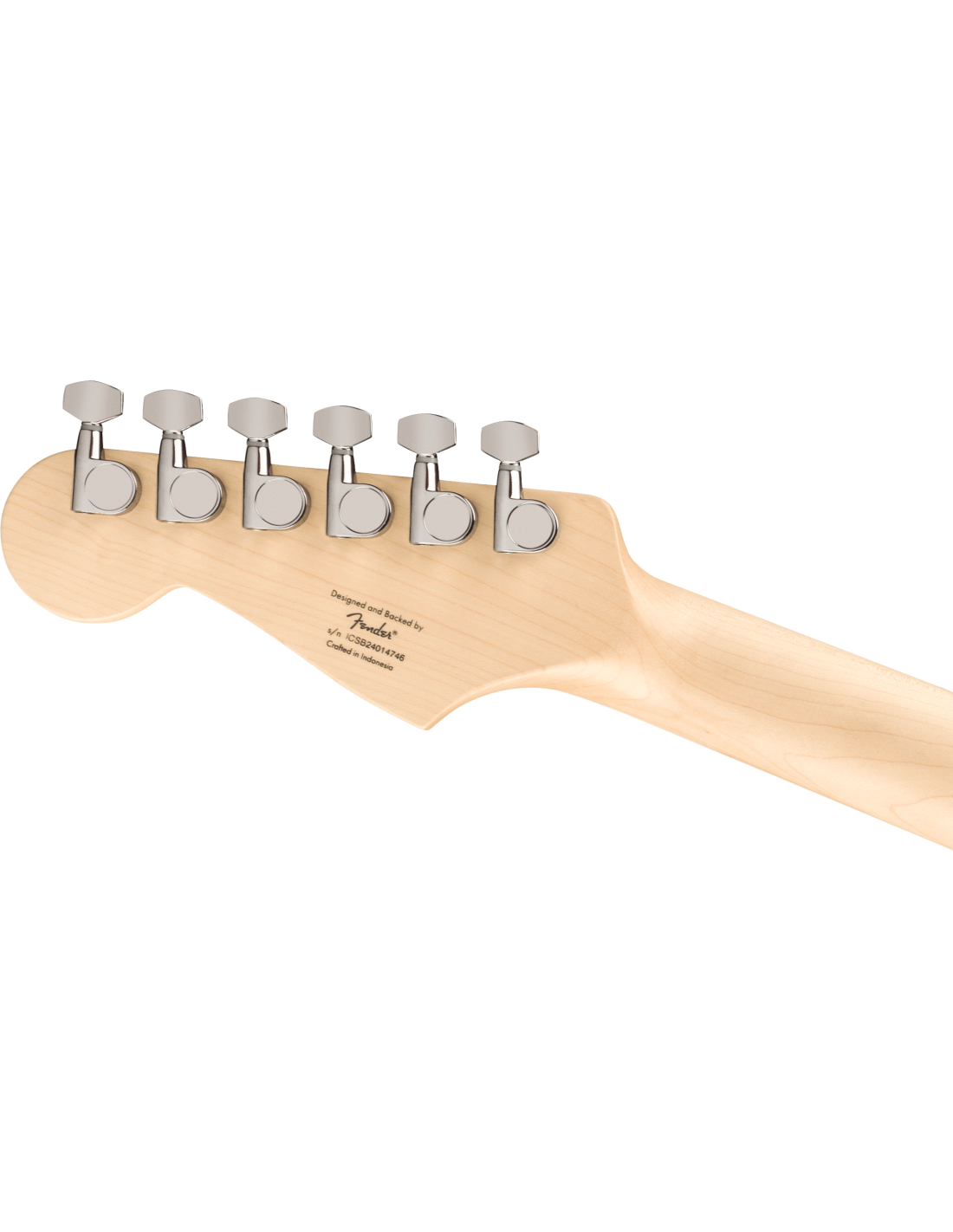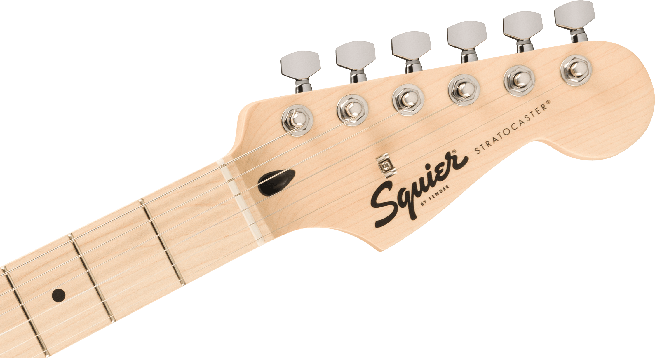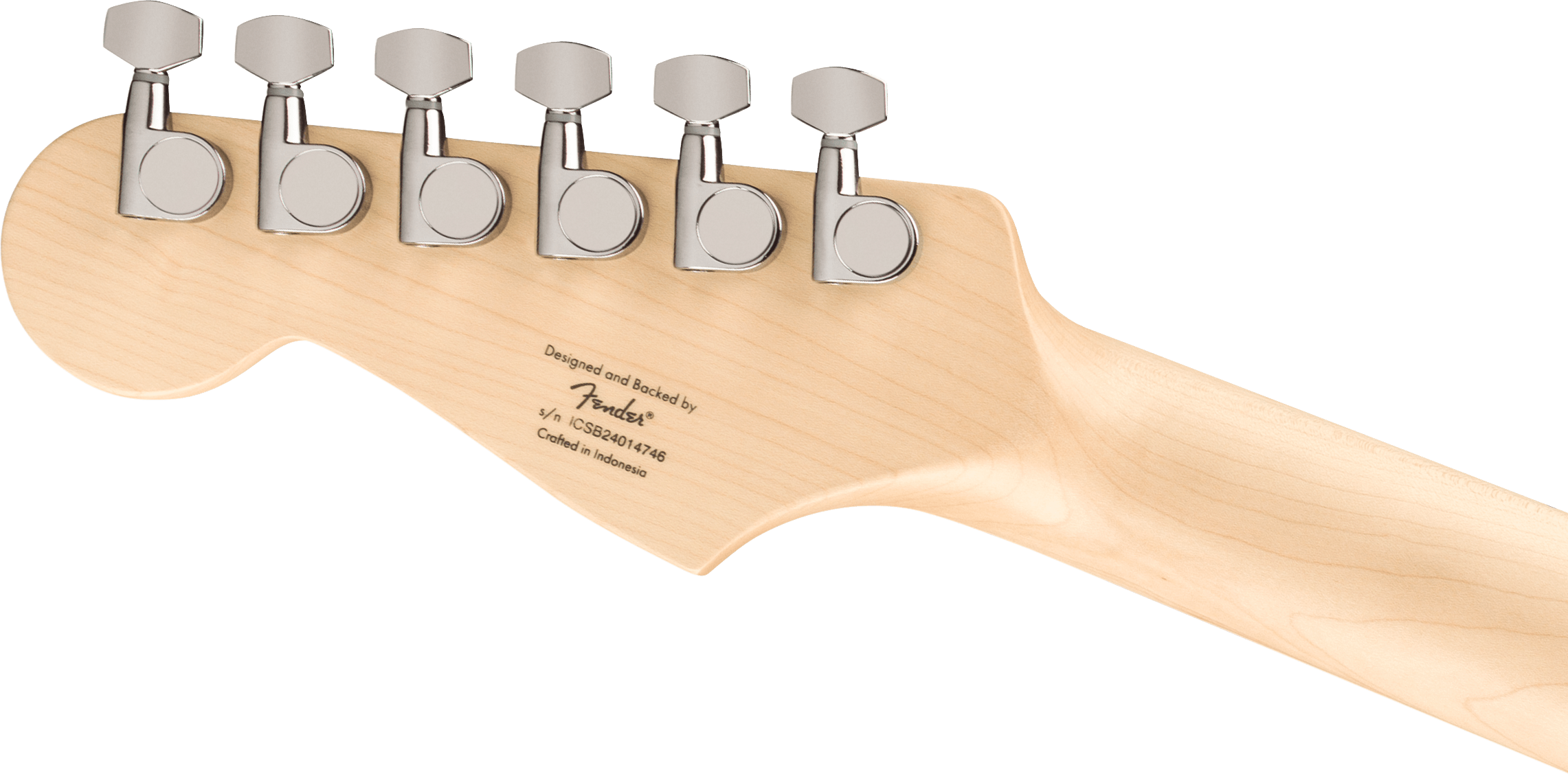 SQUIER FSR SONIC STRAT MN BLACK est une guitare électrique solid body à échelle courte, modèle FSR Squier Sonic Stratocaster, avec un corps en peuplier et une finition en polyuréthane brillant, un manche en érable en forme de "C", un doigté en érable avec un rayon de 9,5" et 21 frettes Narrow Tall et des incrustations Black Dot avec des points latéraux noirs, un pickguard 1-Ply Black, un Truss Rod Standard Head Adjust, un sillet en os synthétique, un matériel nickelé, des mécaniques fermées sous pression et un pont Vintage Style Synchronized Tremolo avec des selles Block. L'électronique en configuration SSS consiste en 3 micros Ceramic Single-Coil avec des contrôles Master Volume, 2 Master Tone et un sélecteur de micros à 5 voies.