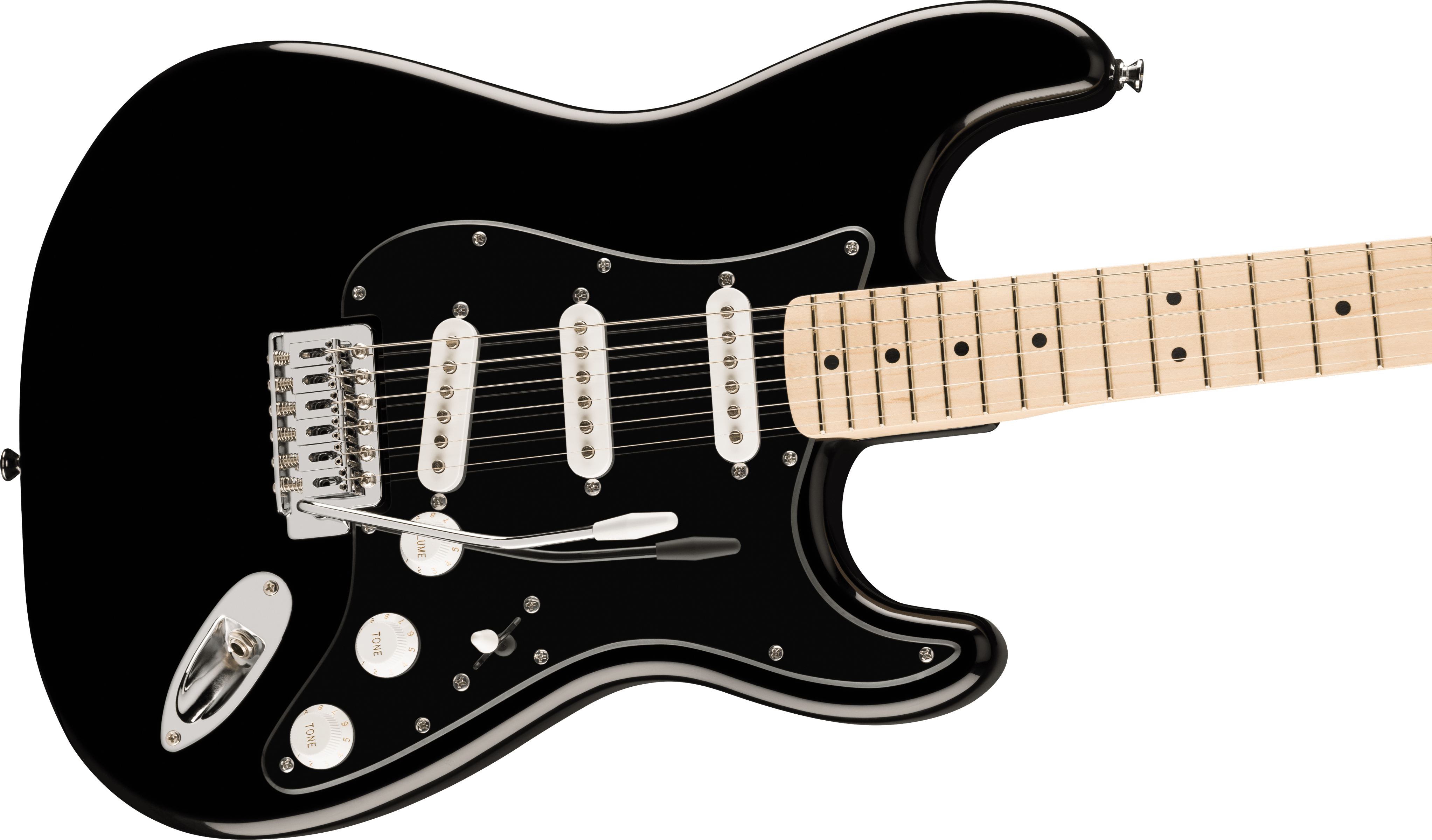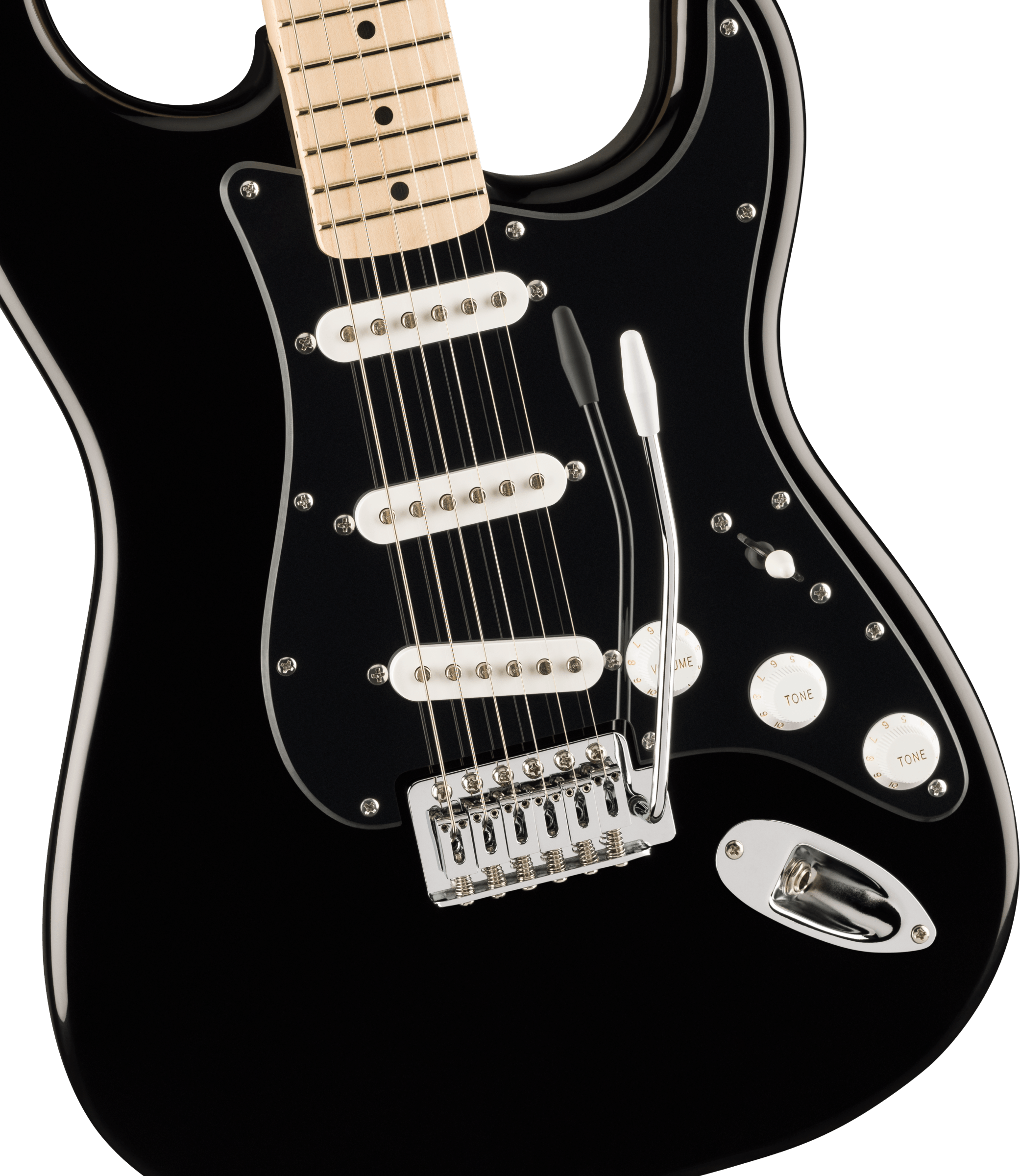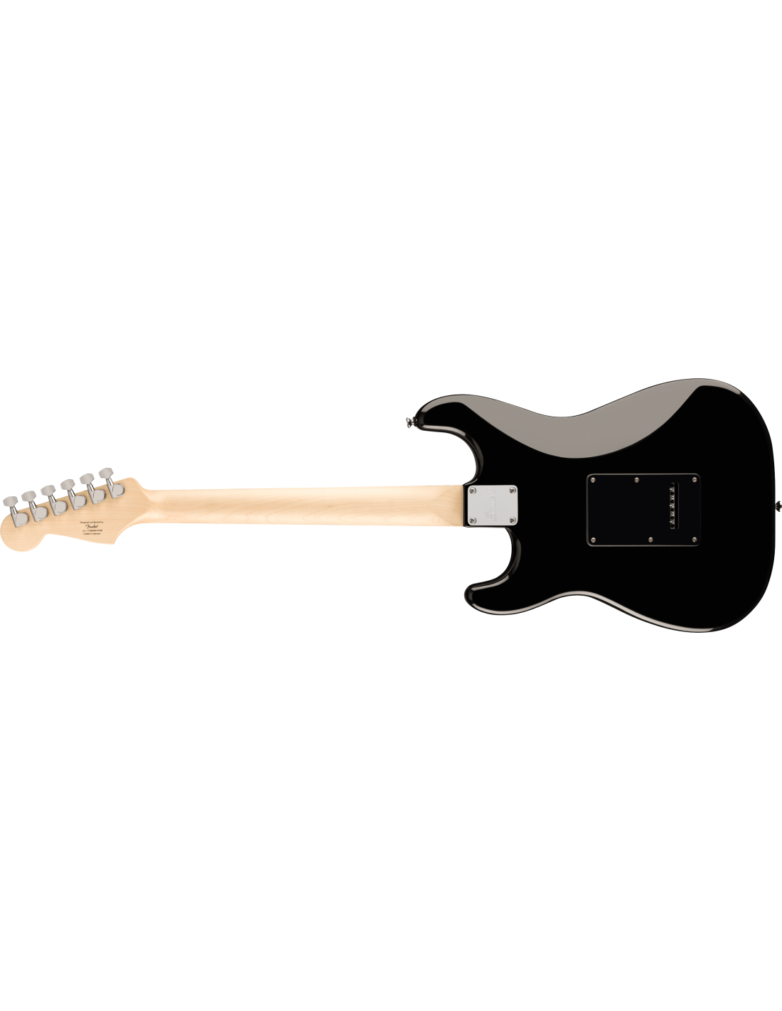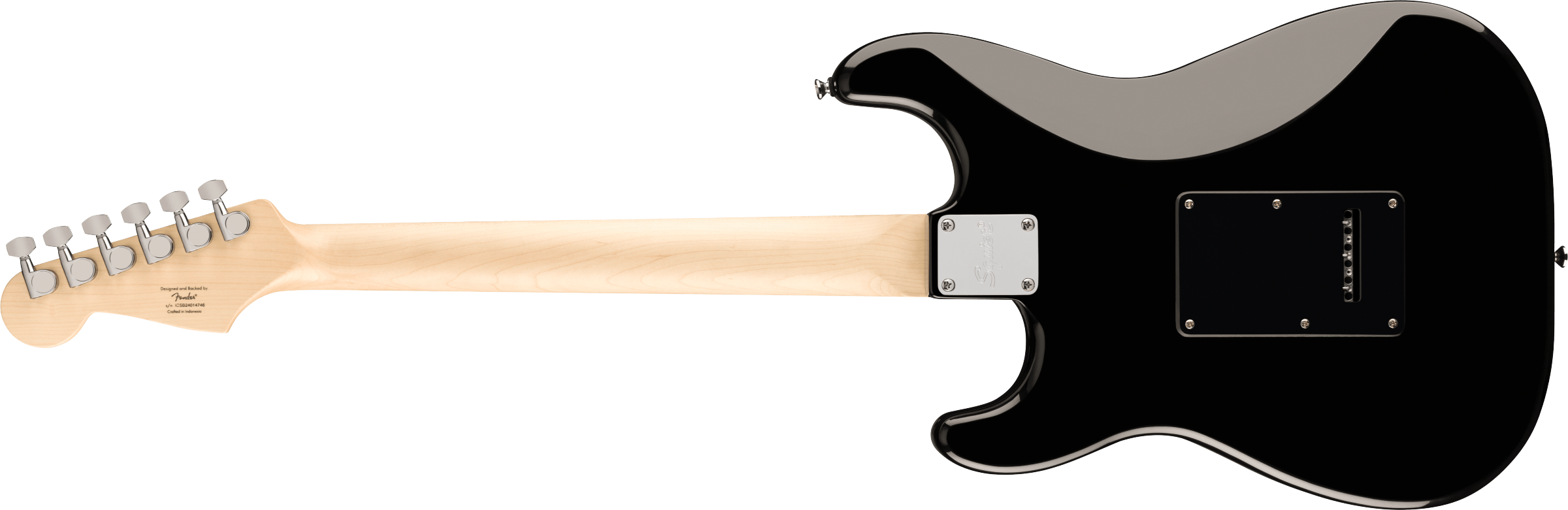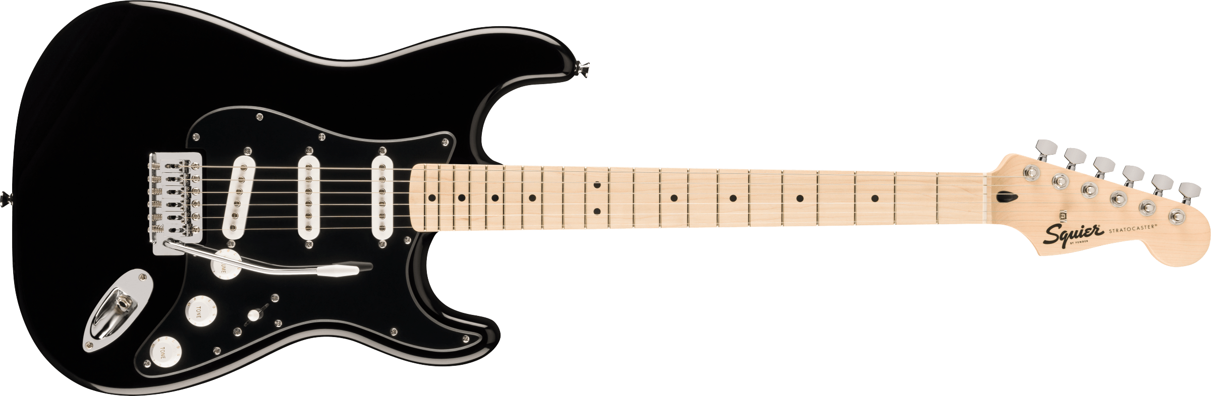 SQUIER FSR SONIC STRAT MN BLACK est une guitare électrique solid body à échelle courte, modèle FSR Squier Sonic Stratocaster, avec un corps en peuplier et une finition en polyuréthane brillant, un manche en érable en forme de "C", un doigté en érable avec un rayon de 9,5" et 21 frettes Narrow Tall et des incrustations Black Dot avec des points latéraux noirs, un pickguard 1-Ply Black, un Truss Rod Standard Head Adjust, un sillet en os synthétique, un matériel nickelé, des mécaniques fermées sous pression et un pont Vintage Style Synchronized Tremolo avec des selles Block. L'électronique en configuration SSS consiste en 3 micros Ceramic Single-Coil avec des contrôles Master Volume, 2 Master Tone et un sélecteur de micros à 5 voies.