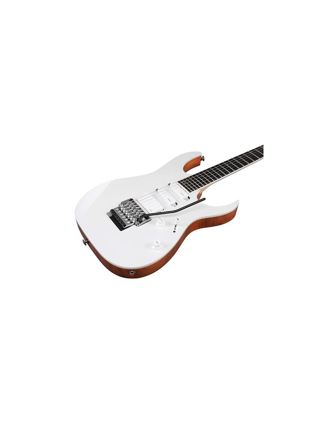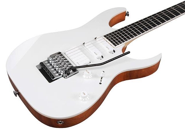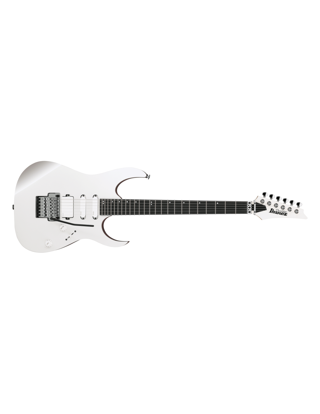 IBANEZ RG5440C-PW est une guitare électrique solid body, modèle Ibanez RG5440C Prestige, avec un corps en Acajou Africain, un manche en 5 pièces Érable/Wengé à profil Super Wizard HP, un touche en Ébène Macassar laminé à rayon 16,9" avec 24 frettes Jumbo en Acier Inoxydable avec Prestige Fret Edge Treatment et des incrustations en nacre dot en décalé avec des points latéraux Luminlay, un sillet de tête Locking R430, du matériel Chrome, des mécaniques Locking Gotoh SG381 Chrome et un pont Tremolo Lo-Pro Edge. L'électronique active en configuration HSS, consiste en 1 micro Humbucker EMG 81 Active/Céramique au pont et 2 micros Single-Coil EMG SA Active/Alnico au centre et au manche avec des contrôles de Volume Master, contrôle de Tonalité Master, et un sélecteur de micro à 5 voies. Inclut un Hardshell Case