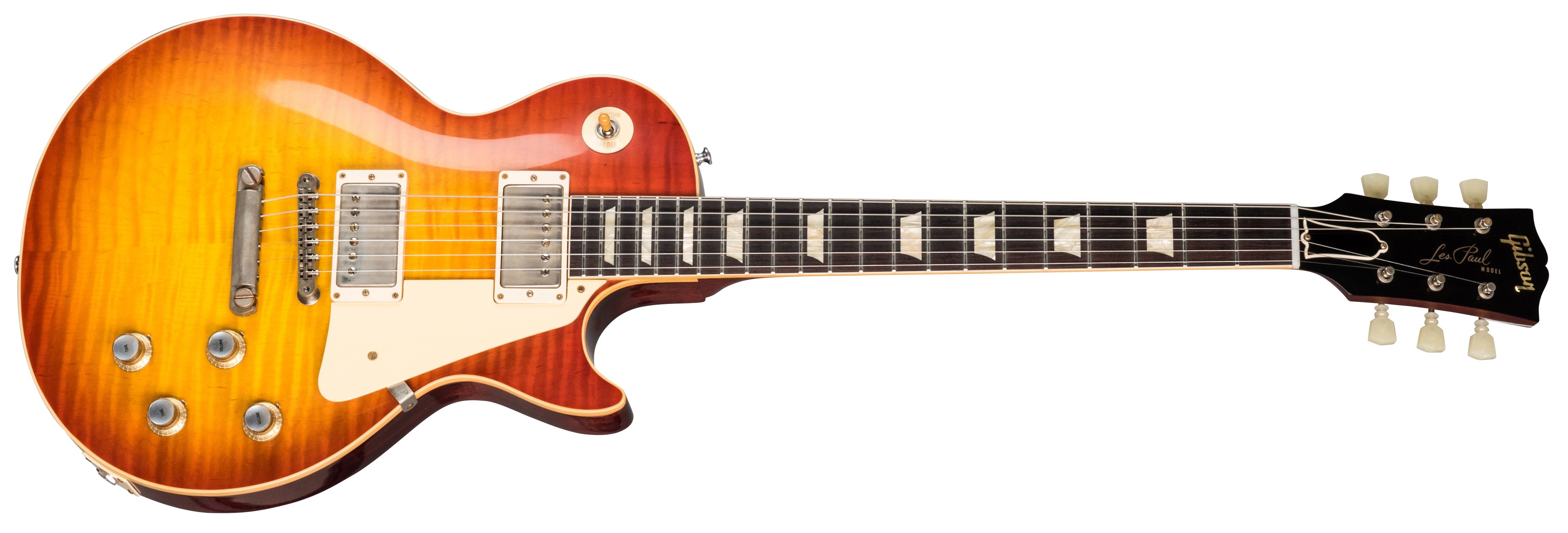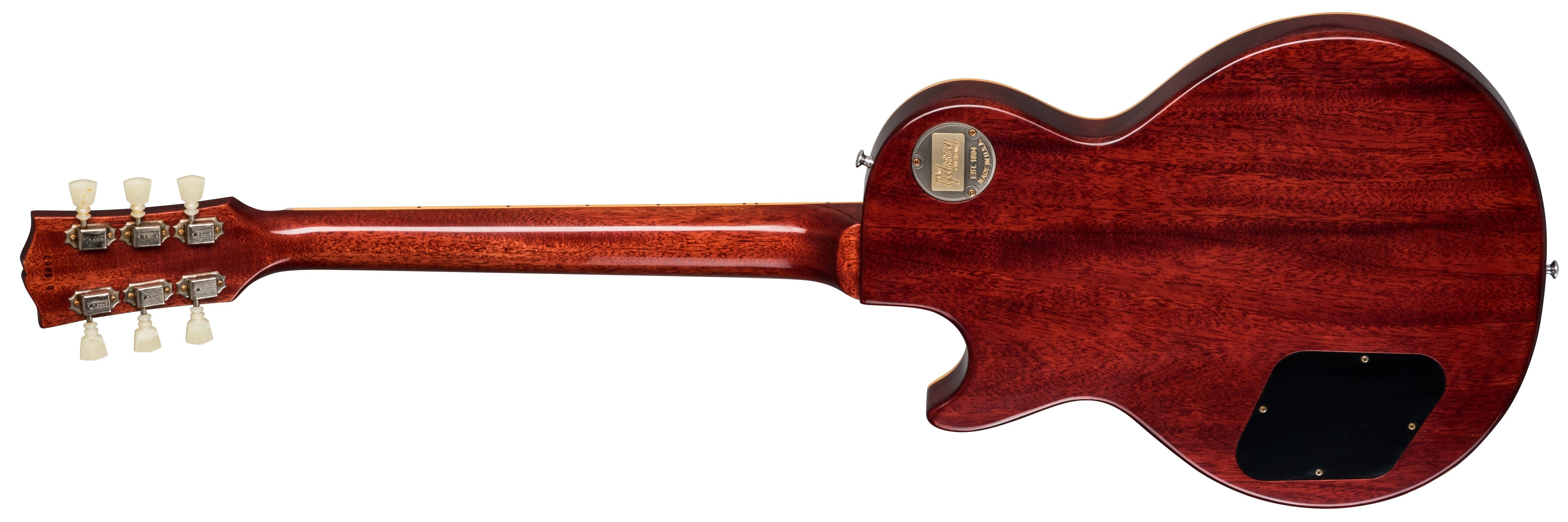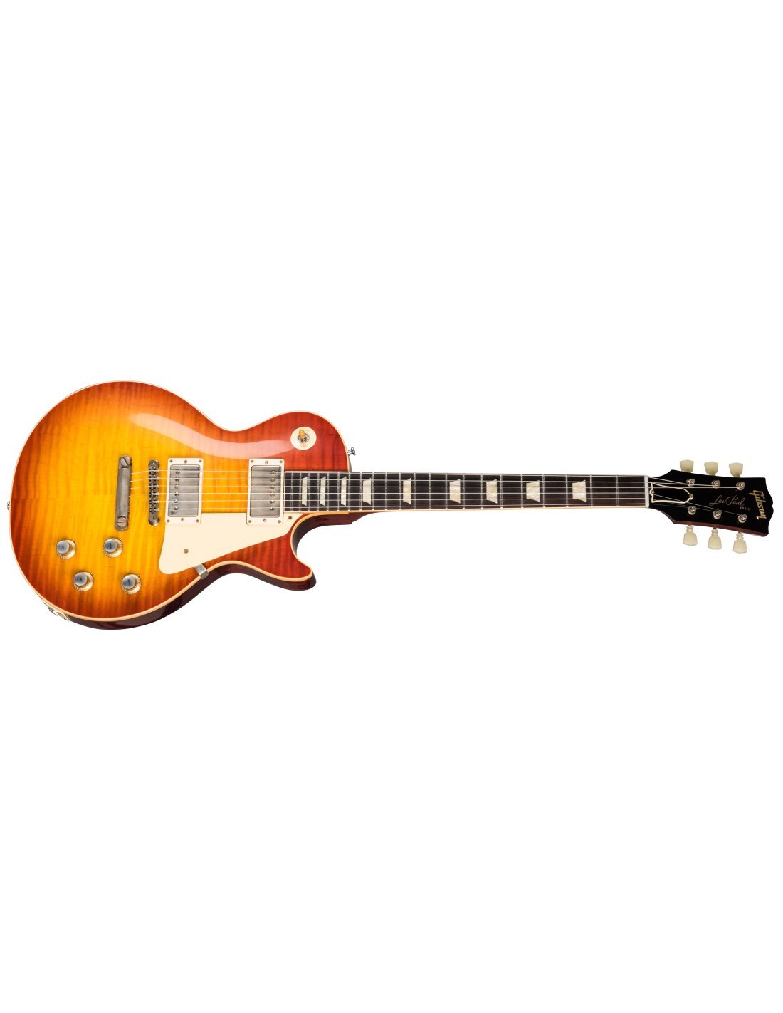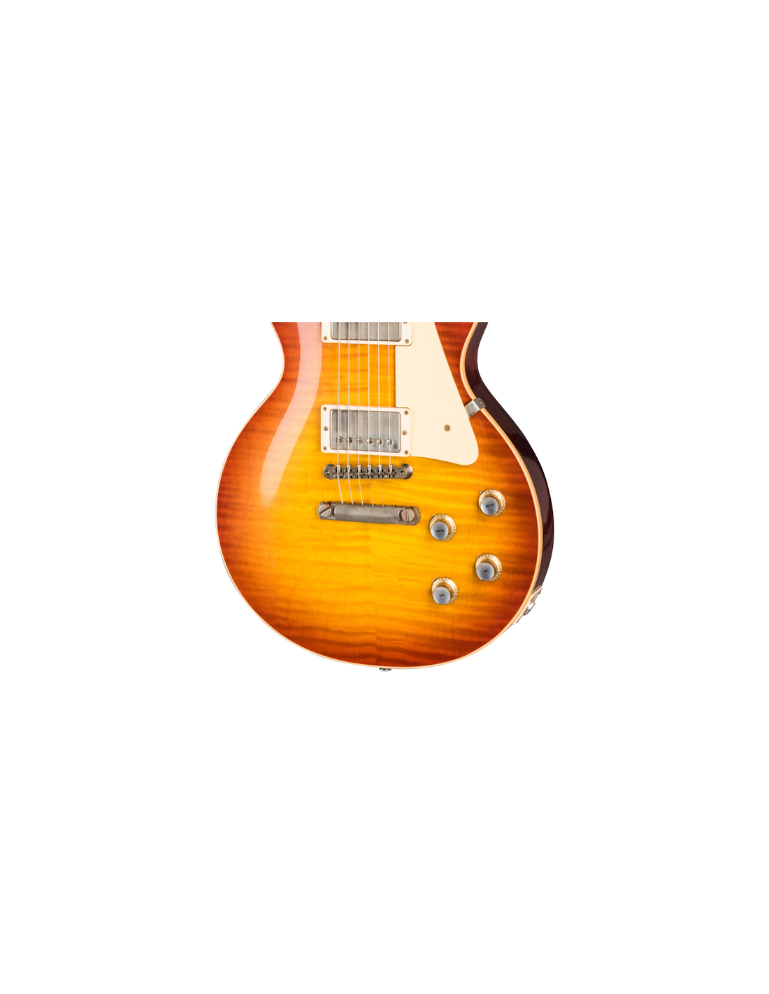 GIBSON LES PAUL '60 STANDARD REISSUE VOS WASHED CHERRY è una chitarra elettrica solid body, modello Gibson Custom 1960 Les Paul Standard Reissue, con corpo in Mogano alleggerito e Top in Acero Figurato 2 pezzi a finitura Nitrocellulose VOS (Vintage Patina), manico in Mogano a profilo 60s SlimTaper, tastiera in Palissandro Indiano a raggio 12" con 22 tasti Authentic Medium-Jumbo e intarsi Aged Cellulose Nitrate Trapezoid, capotasto in Nylon, hardware nichelato, meccaniche Kluson Single Line-Double Ring e ponte Gibson ABR-1 No-Wire con cordiera Lightweight Aluminum Stop Bar. L'elettronica a configurazione HH, consiste in 2 pickup Gibson CustomBucker Alnico III con potenziometri CTS 500K Audio Taper, condensatori carta-olio, 2 controlli Master Volume, 2 controlli Master Tone e selettore pickup a 3 vie. Include la custodia Gibson Brown Lifton 5-Latch Case e certificato di autenticità Gibson.