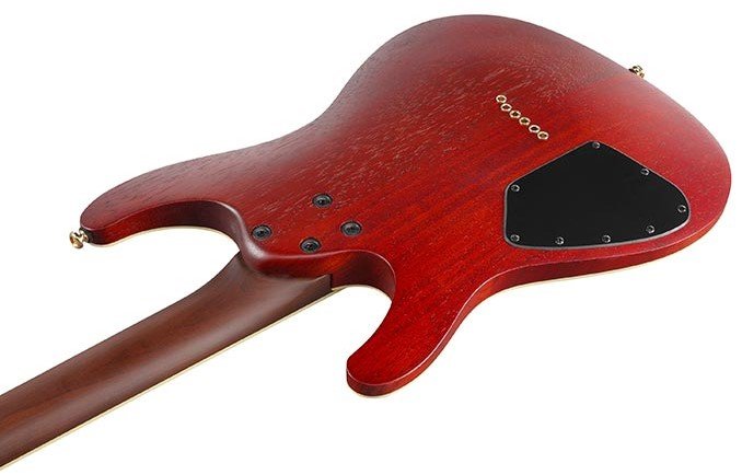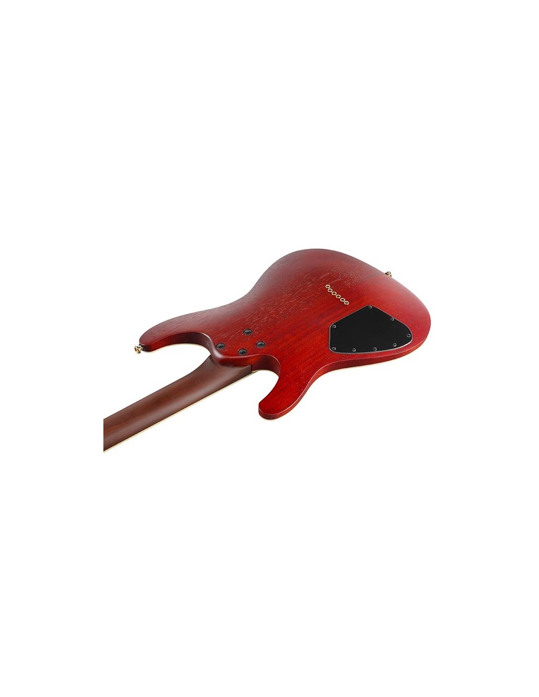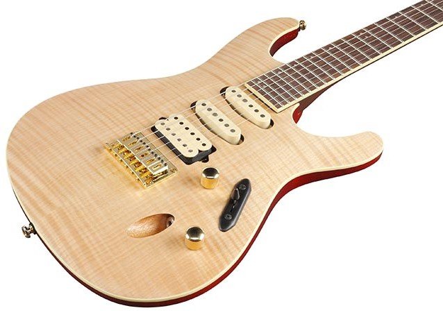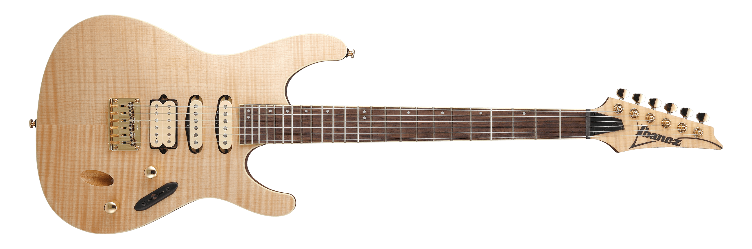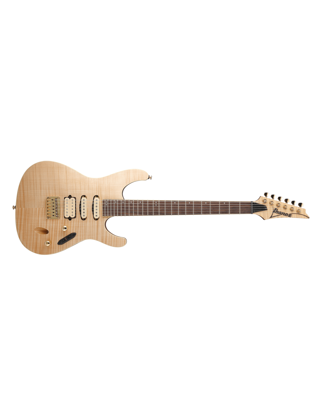 IBANEZ SEW761FM-NTF est une guitare électrique solid body, modèle Ibanez S Standard SEW761FM, avec un corps en Meranti et un top en Acajou flammé, un manche en Acajou rôti au profil Wizard III, une touche en Palissandre à rayon 16" avec 24 frettes Jumbo et des incrustations White dot en décalé, un sillet en PPS R400 de 43mm, un matériel doré, des mécaniques Ibanez moulées sous pression à petites clés dorées et un pont fixe Ibanez F106. L'électronique en configuration HSS se compose de 1 pickup Humbucker DiMarzio The Tone Zone Passive/Alnico au pont et de 2 pickups Single-Coil DiMarzio True Velvet Passive/Alnico au centre et au manche avec des contrôles de Volume Master, de Tonalité Master, et un sélecteur de pickups à 5 voies.