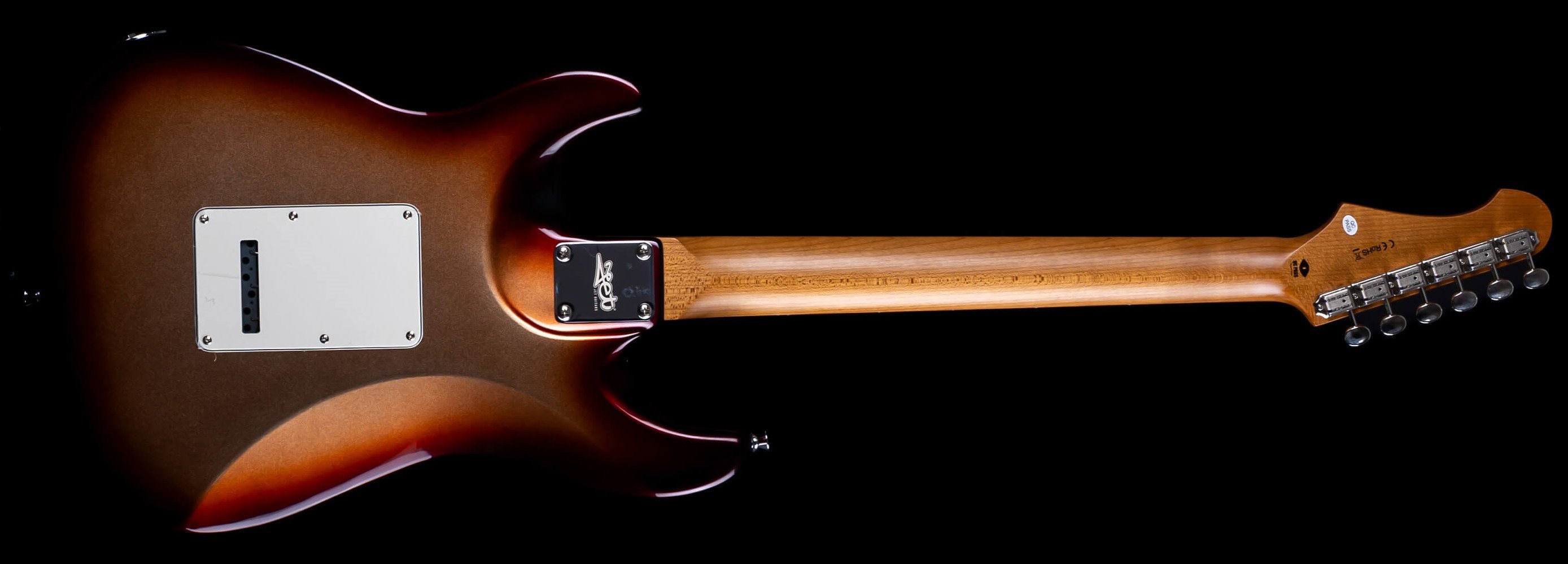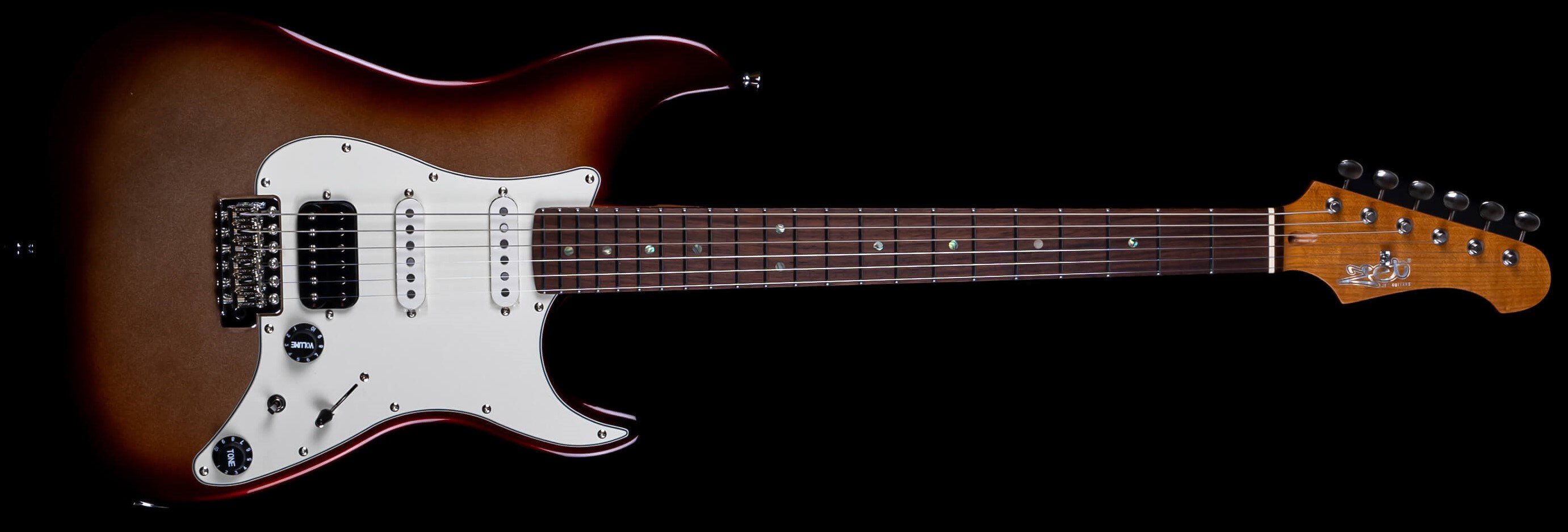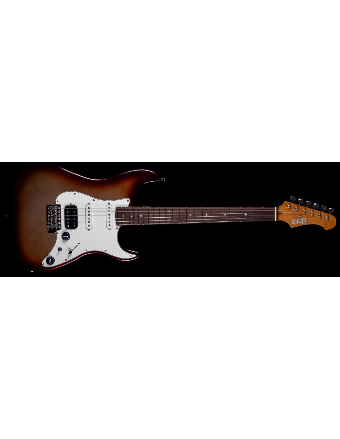 JET JS-40 ELITE HSS METALLIC BURST est une guitare électrique solid body de style Strat, modèle JS-40 Elite, avec un corps en Alder (aulne) 3 pièces, un manche en érable Light Roasted Quartersawn en profil "C" shape, un touche en palissandre indien avec un rayon de 9,5" et 22 frettes Medium Jumbo, Truss Rod Double Action, un sillet Hi-End PPS, du matériel chromé, des mécaniques Wilkinson WJ-55 Vintage et un pont Wilkinson WV6SB. L'électronique en configuration HSS consiste en un ensemble de micros Humbucker et Single-Coil HSS Alnico V Custom avec contrôle Master Volume, contrôle Master Tone, interrupteur pour le split de la bobine humbucker et sélecteur de micros à 5 voies. Inclut un Deluxe Gig Bag