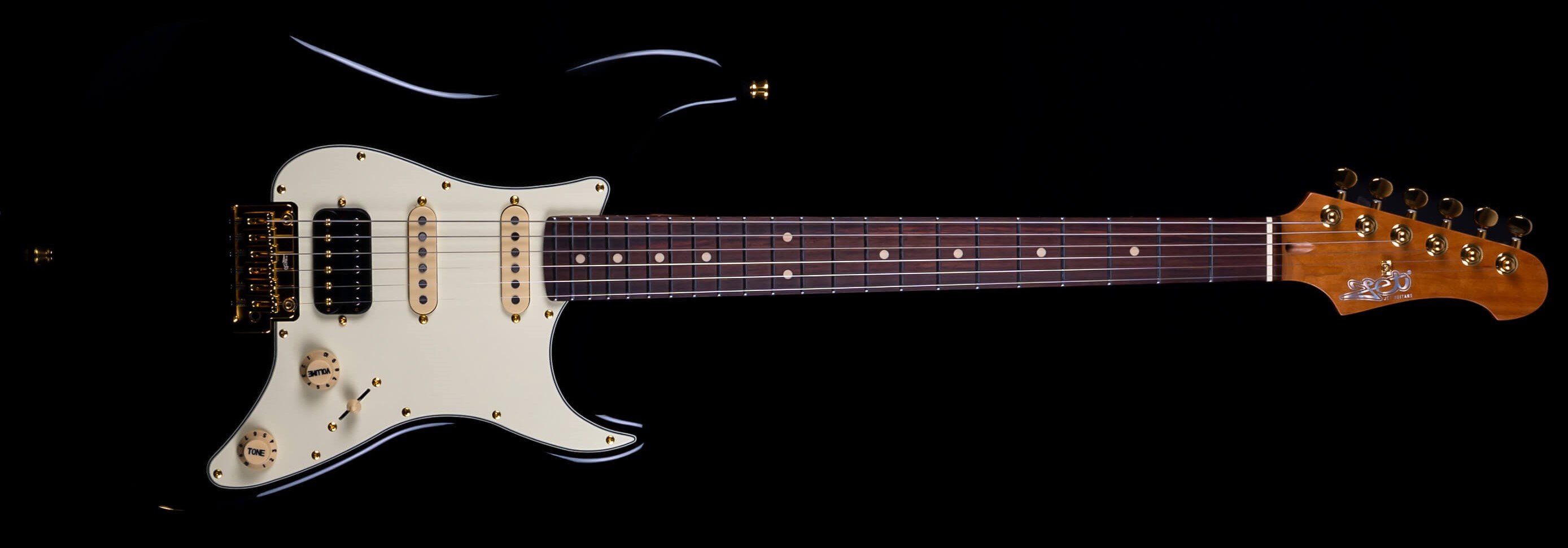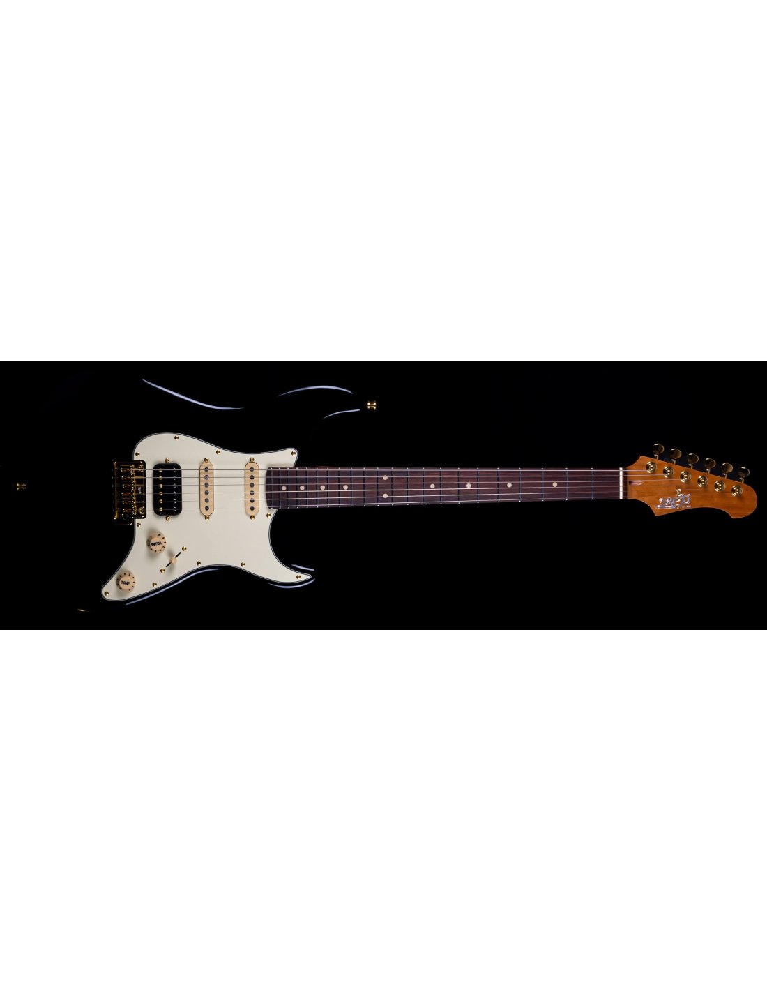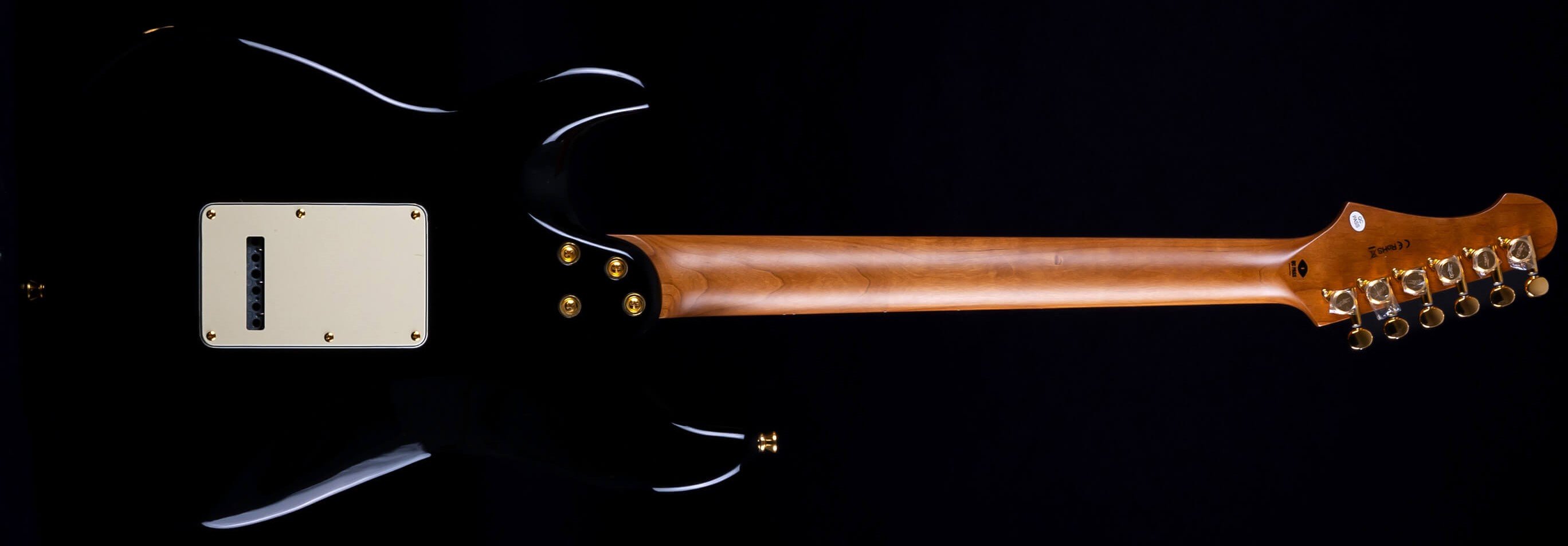 JET JS-480 BK G HSS BLACK ROASTED GOLD HARDWARE est une guitare électrique solid body de style Strat, modèle JS-480 HSS, avec un corps en peuplier rôti, un manche en érable rôti canadien de profil Modern "C" shape, une touche en palissandre avec un rayon de 9,5" et 22 frettes Medium Jumbo, Truss Rod à double action, un sillet en os, du matériel doré, des mécaniques fermées en métal doré verrouillables et un pont tremolo à 6 sellette dorées. L'électronique en configuration HSS consiste en un ensemble de micros Humbucker et Single-Coil HSS Alnico V Custom Model, avec un contrôle de volume master, un contrôle de tonalité master et un sélecteur de micros à 5 voies.