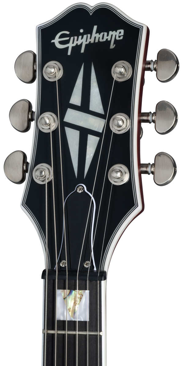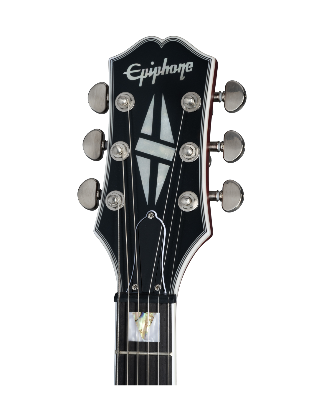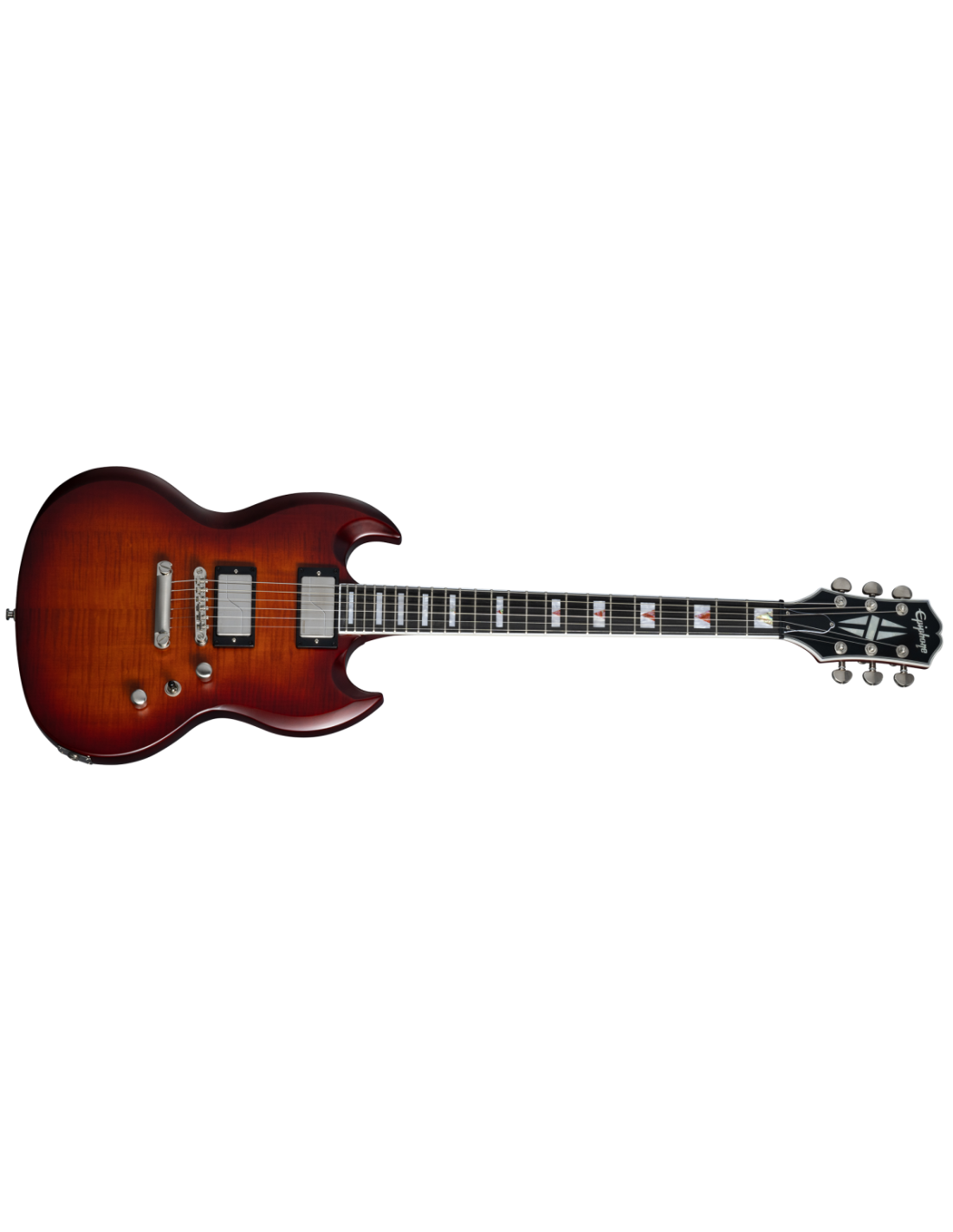 EPIPHONE SG PROPHECY AGED BENGAL TIGER BURST est une guitare électrique solid body, modèle SG série Modern Prophecy, avec un corps en acajou et une finition Aged Gloss, un top en érable flammé AAA plaqué, un manche en acajou à profil Asymmetrical Slim Taper, une touche en ébène à rayon de 12" avec 24 frettes Jumbo et des incrustations rectangulaires en nacre avec un triangle en abalone, un sillet en GraphTech NuBone noir, un matériel en nickel brossé, un Truss Rod à double action, des mécaniques Grover Locking Rotomatic et un pont LockTone Tune-o-Matic avec une cordière LockTone Stop Bar. L'électronique se compose de 2 micros Fishman Fluence avec des voicings personnalisables parmi : 1 son humbucker vintage chaud "Patent Applied For", 1 son humbucker moderne et 1 son single-coil scintillant et optimisé, sélectionnables via push/pull sur les contrôles de volume et de tonalité, et un sélecteur de micros à 3 positions.
