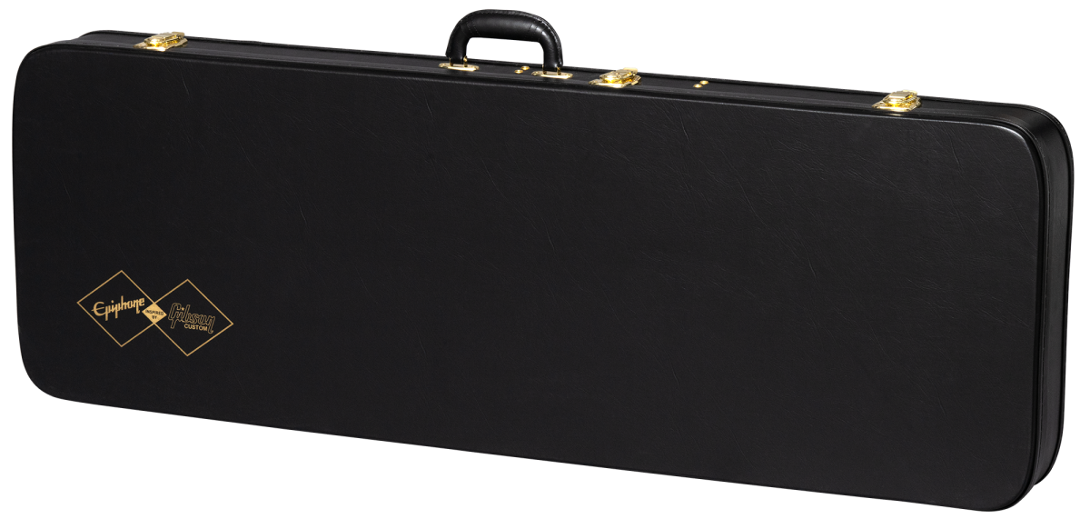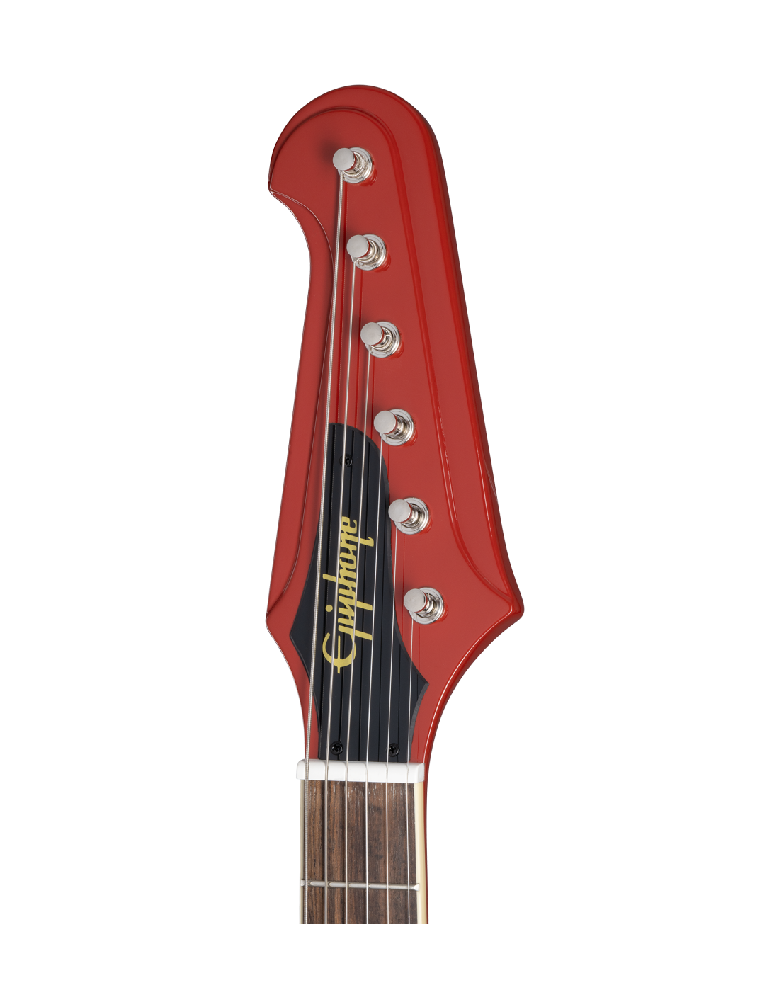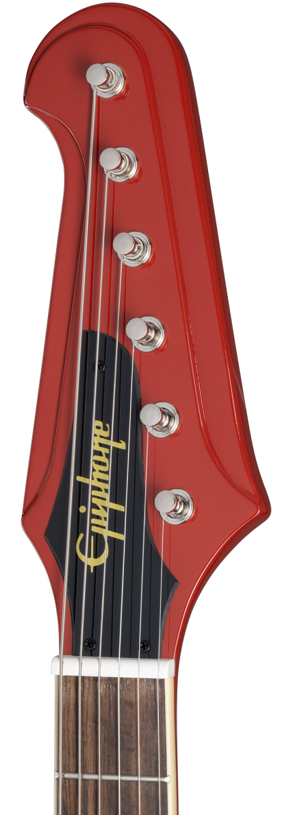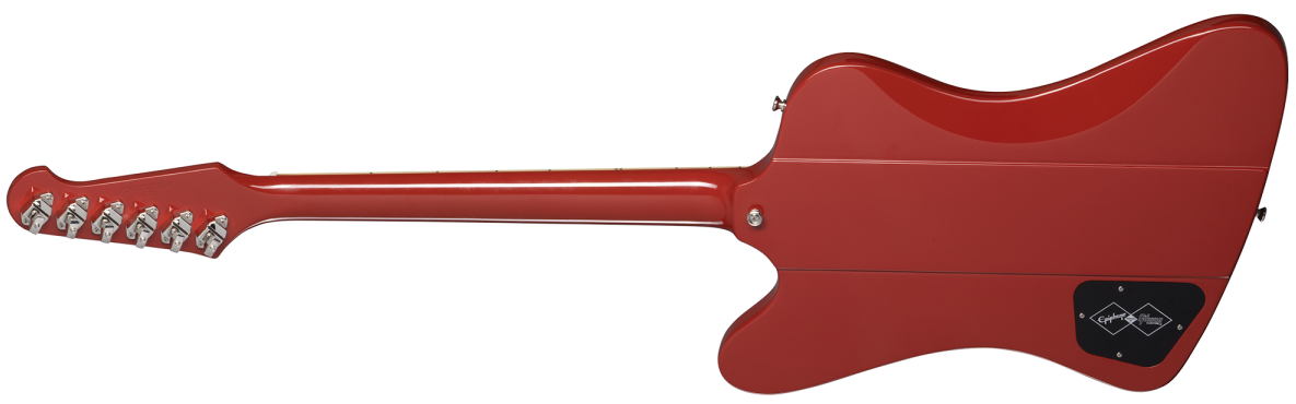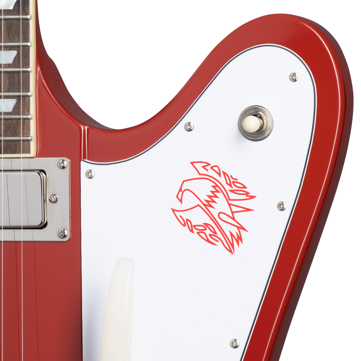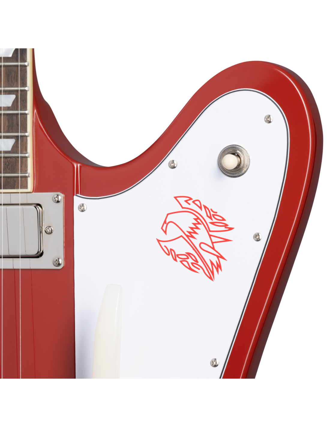 EPIPHONE 1963 FIREBIRD V MAESTRO VIBROLA + CASE est une guitare électrique solid body, modèle 1963 Firebird V Maestro Vibrola avec corps neck-through à 9 couches en acajou/noyer avec épaules en acajou massif et finition brillante, manche 9 couches en acajou/noyer au profil 1963 Firebird, touche en laurier indien à rayon 12" avec 22 frettes Medium Jumbo et incrustations trapézoïdales en nacre, sillet en Graph Tech, matériel nickelé, Truss Rod à double action, mécaniques Kluson “style Banjo” avec engrenage planétaire et pont Epiphone ABR-1 avec cordier Maestro Vibrola et logo Epiphone gravé. L'électronique se compose de 2 micros mini-humbucker Gibson USA Firebird avec aimant Alnico 5, 2 contrôles de volume, 2 contrôles de tonalité câblés à la main avec potentiomètres CTS et condensateurs Mallory et sélecteur de micros Switchcraft à 3 positions. Comprend une housse rigide avec le logo Inspired by Gibson Custom.