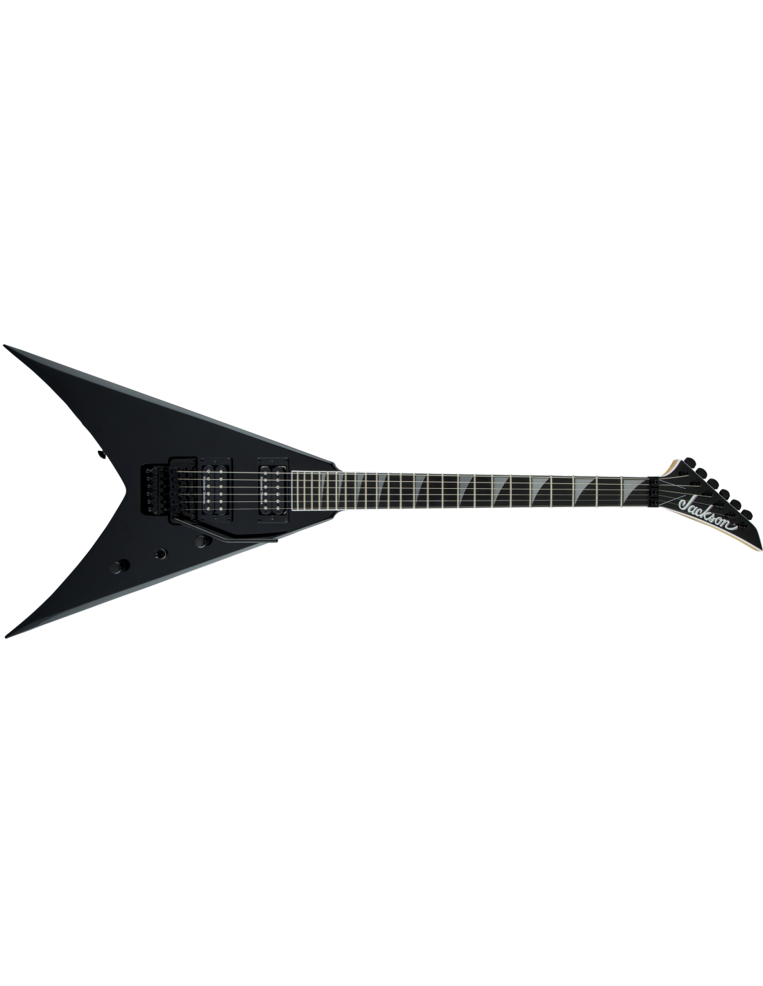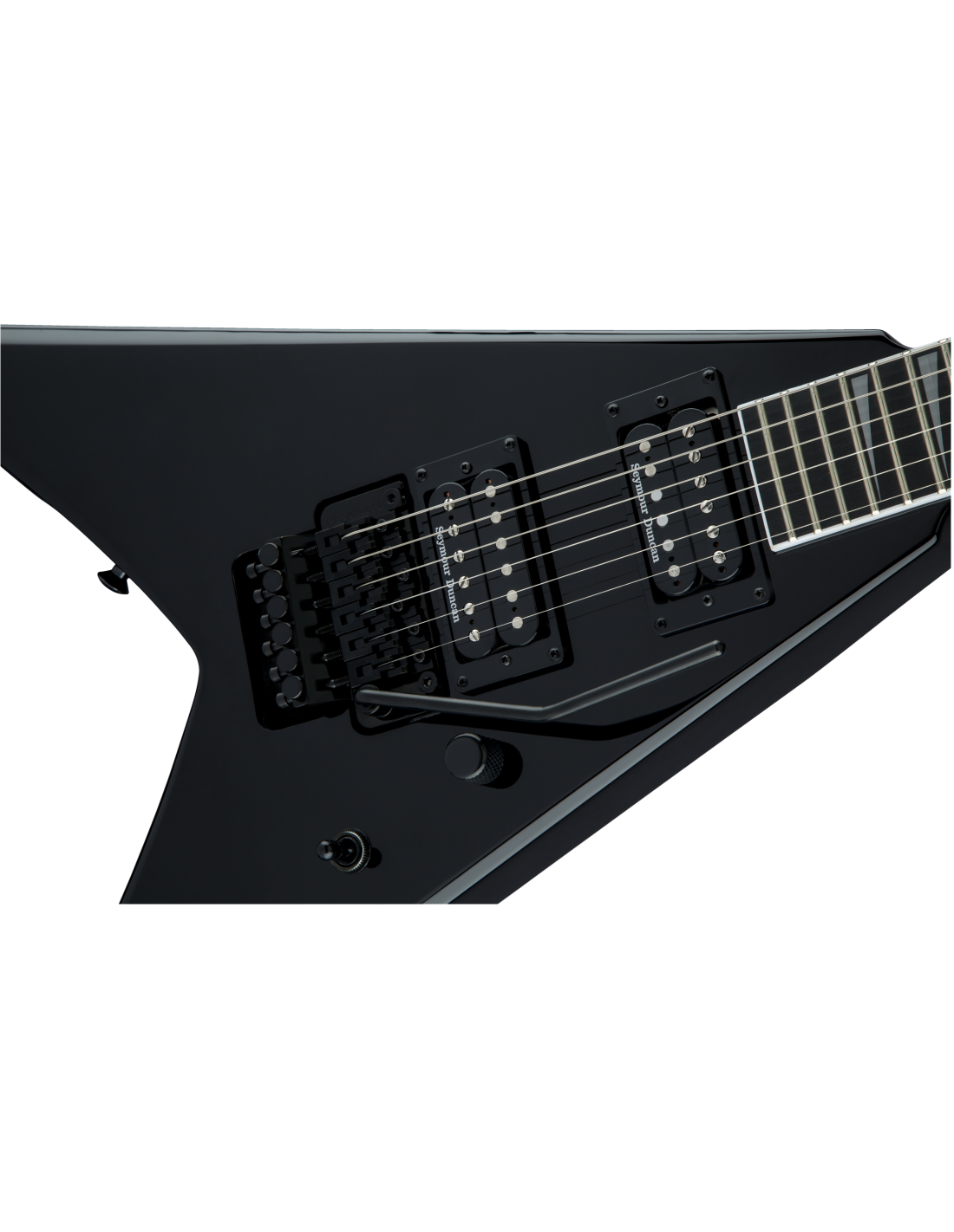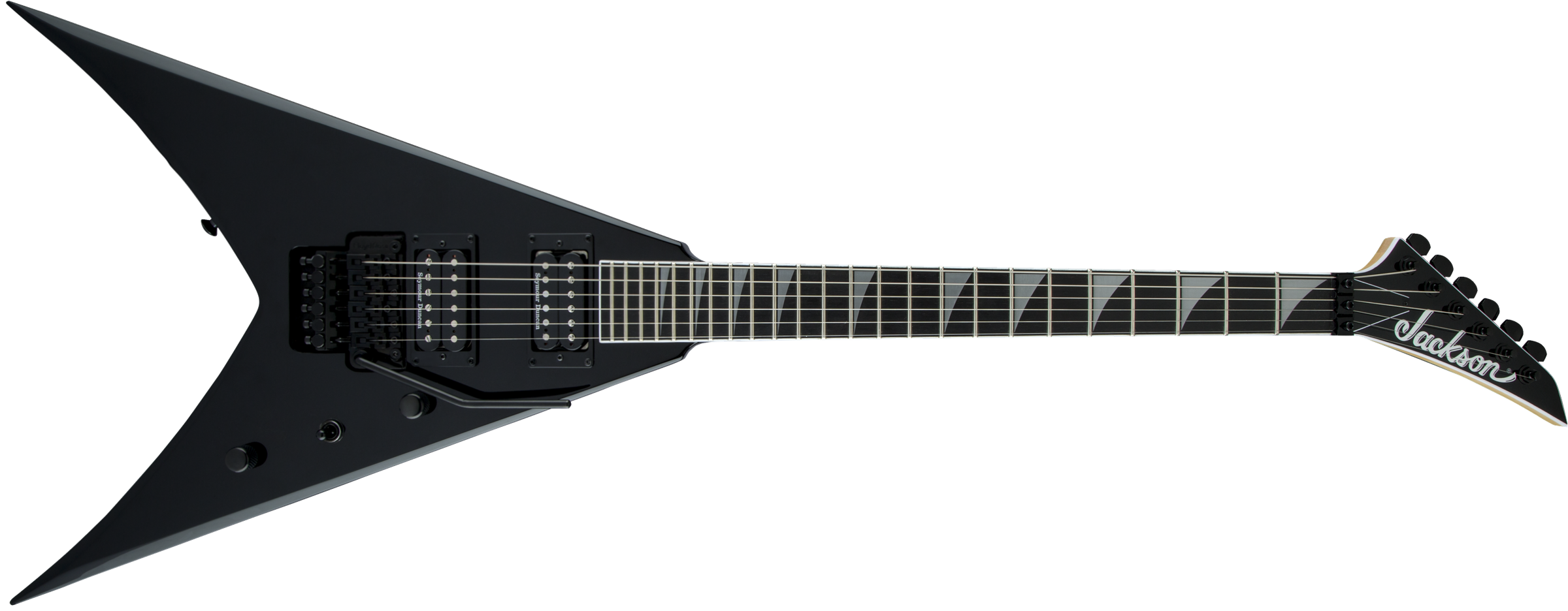 JACKSON PRO KING V GLOSS BLACK est une guitare électrique solid body, série Pro KV, modèle King V avec un corps en acajou et une finition Gloss, un manche Through-Body en érable avec des renforts en graphite, une touche en ébène à rayon composite 12"-16" avec 24 frettes Jumbo et des incrustations Alumiloid Sharkfin, un sillet Floyd Rose 1000 Series Locking, matériel noir, Truss Rod à double action, mécaniques Jackson scellées en fonte et un pont Floyd Rose 1000 Series Double-Locking Tremolo (encastré). L'électronique à configuration HH consiste en 2 micros Humbucker Seymour Duncan Distortion TB-6 au pont et Seymour Duncan Distortion SH-6N au manche avec contrôle Master Volume, contrôle Master Tone et sélecteur de micros à 3 voies.