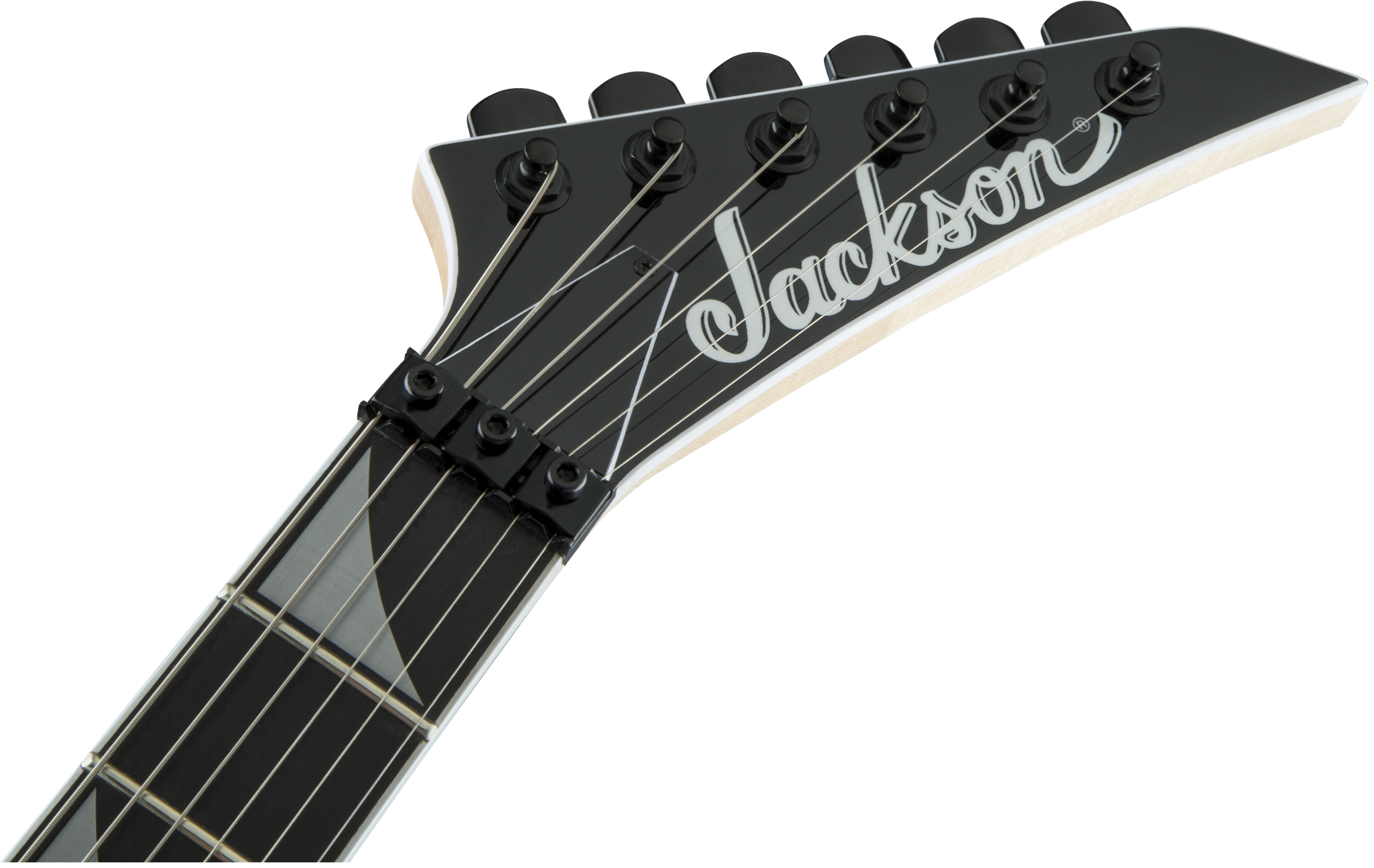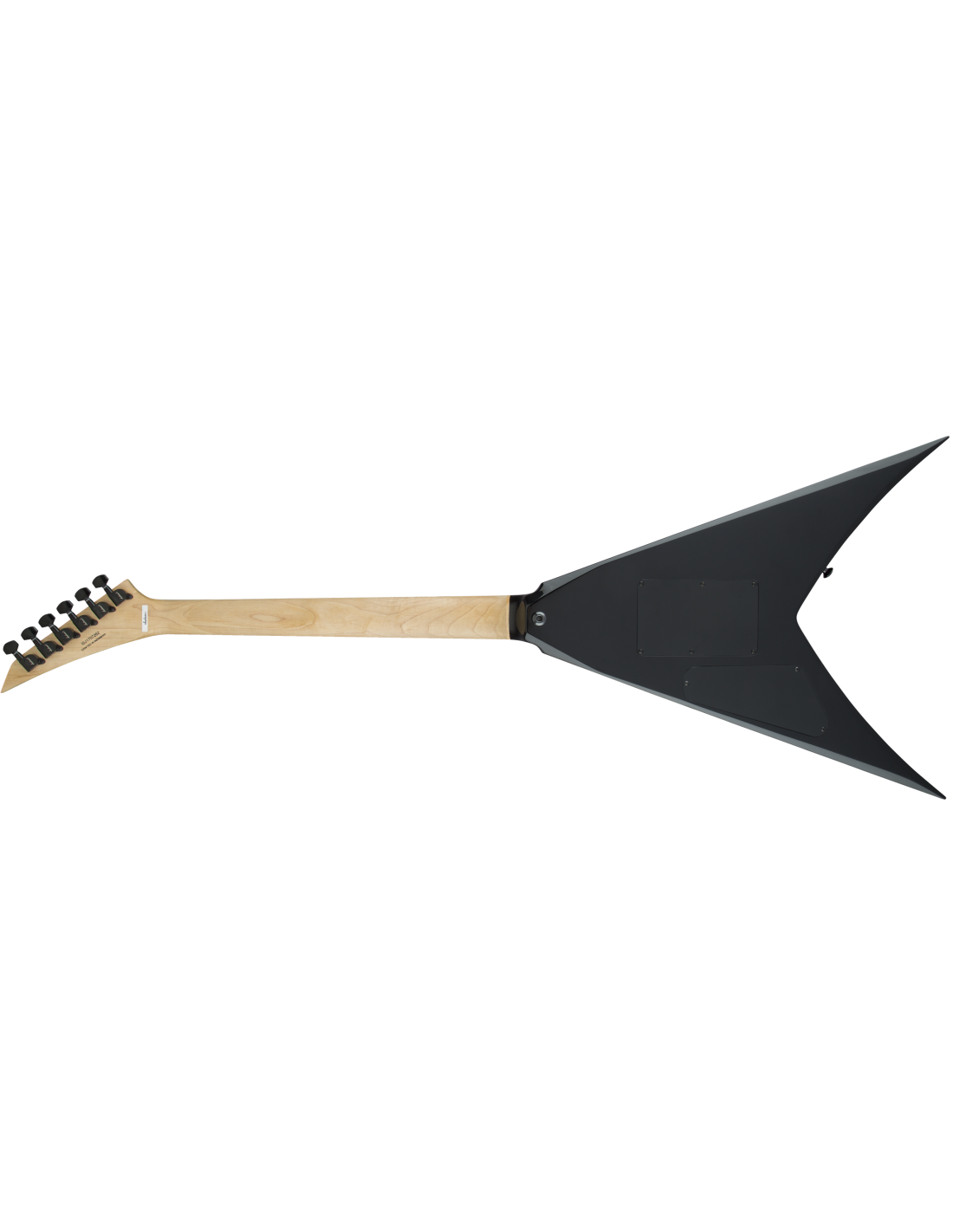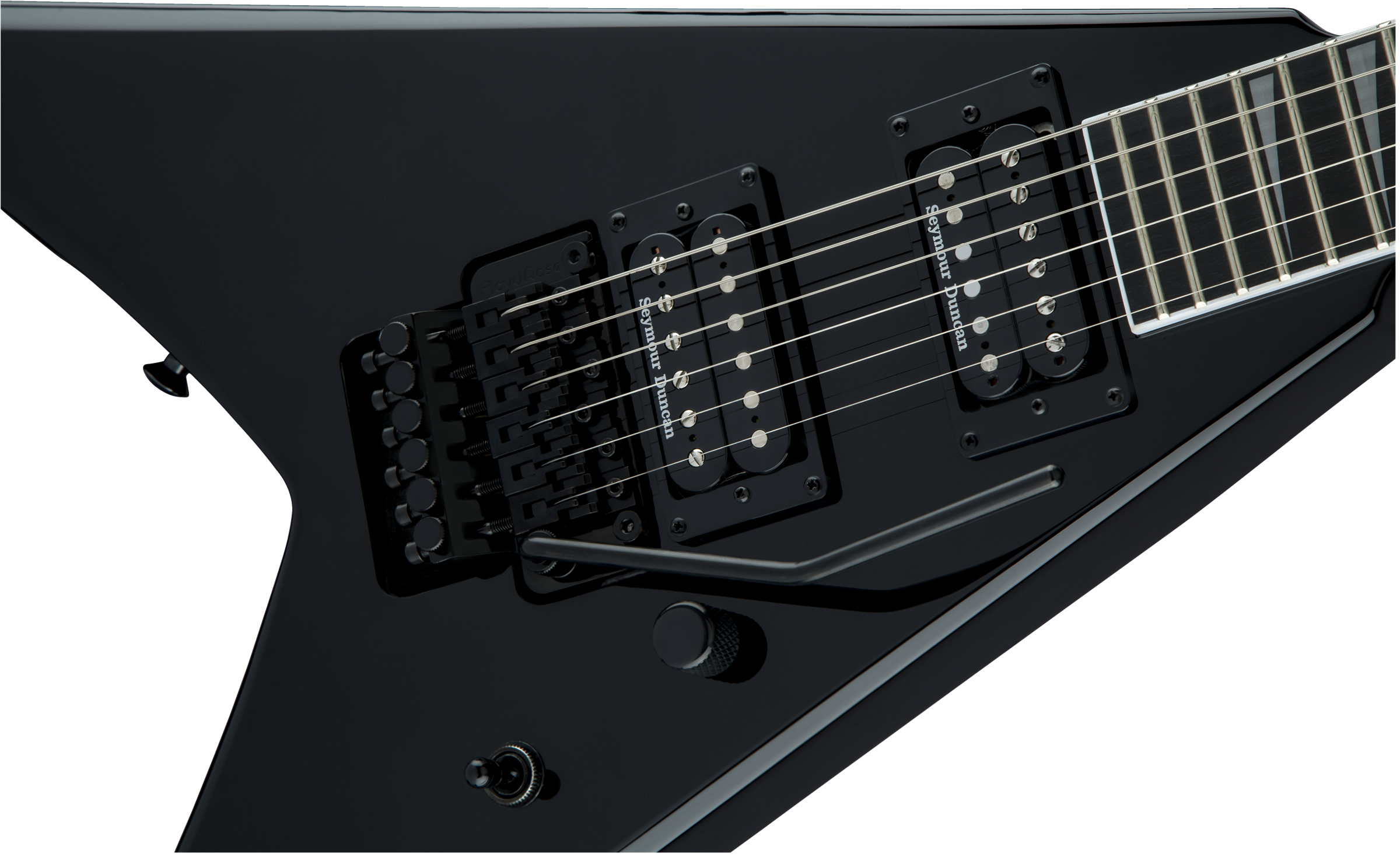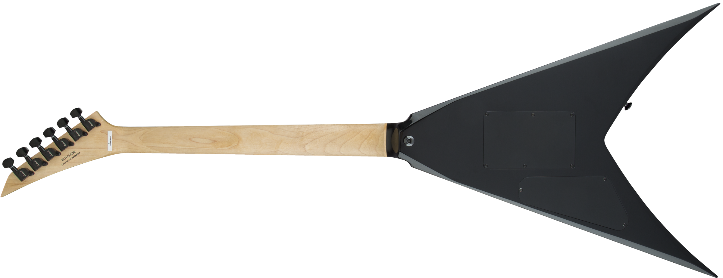 JACKSON PRO KING V GLOSS BLACK est une guitare électrique solid body, série Pro KV, modèle King V avec un corps en acajou et une finition Gloss, un manche Through-Body en érable avec des renforts en graphite, une touche en ébène à rayon composite 12"-16" avec 24 frettes Jumbo et des incrustations Alumiloid Sharkfin, un sillet Floyd Rose 1000 Series Locking, matériel noir, Truss Rod à double action, mécaniques Jackson scellées en fonte et un pont Floyd Rose 1000 Series Double-Locking Tremolo (encastré). L'électronique à configuration HH consiste en 2 micros Humbucker Seymour Duncan Distortion TB-6 au pont et Seymour Duncan Distortion SH-6N au manche avec contrôle Master Volume, contrôle Master Tone et sélecteur de micros à 3 voies.