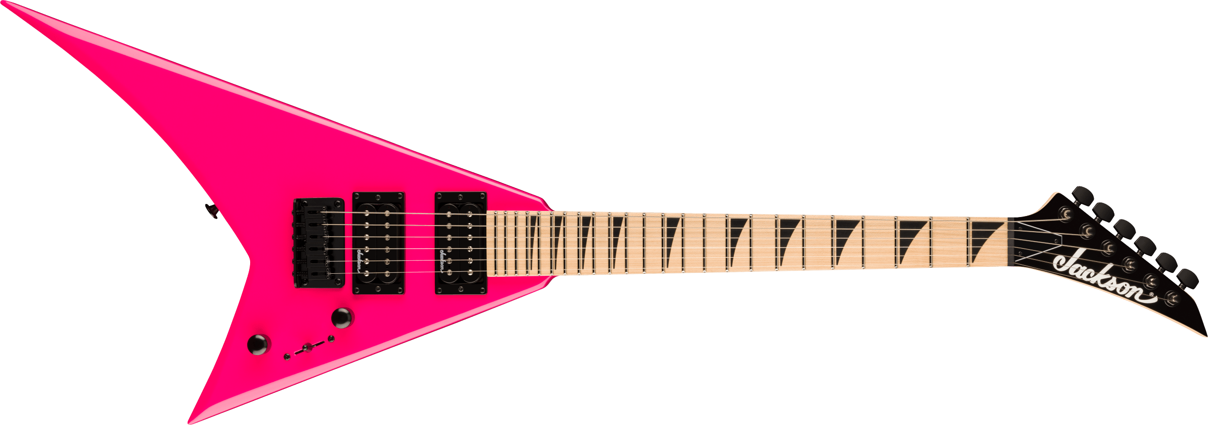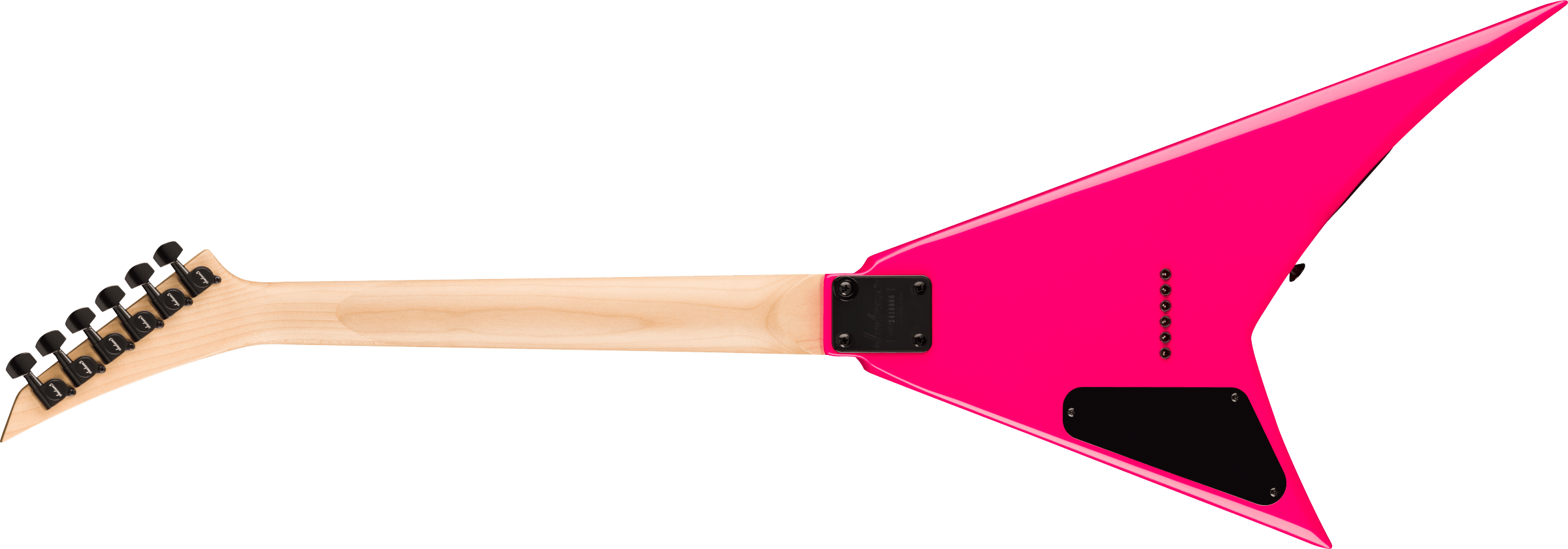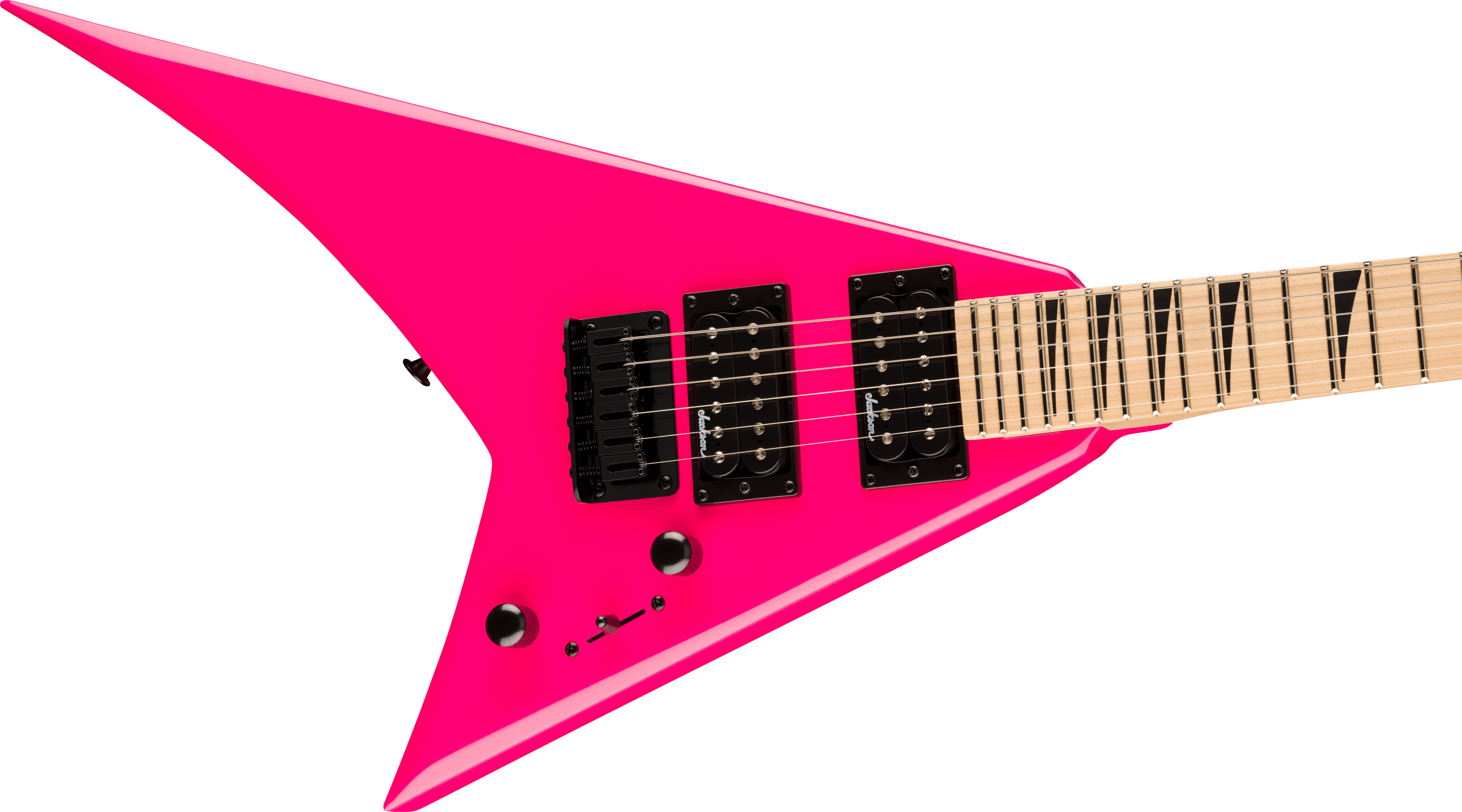 JACKSON JS1X RR MINION NEON PINK est une guitare électrique solid body, série JS, modèle Rhoads Minion JS1X avec un corps en peuplier et une finition brillante, un manche en érable bolt-on avec des renforts en graphite, un doigté en érable à rayon de 12" avec 24 frettes Jumbo et des incrustations Black Sharkfin, un sillet en plastique noir, un matériel noir, des mécaniques Jackson scellées die-cast et un pont String-Through-Body Hardtail à 6 selles Block. L'électronique à configuration HH consiste en 2 micros Jackson High-Output Humbucking, avec un contrôle de volume principal, un contrôle de tonalité principal et un sélecteur de micros à 3 voies.