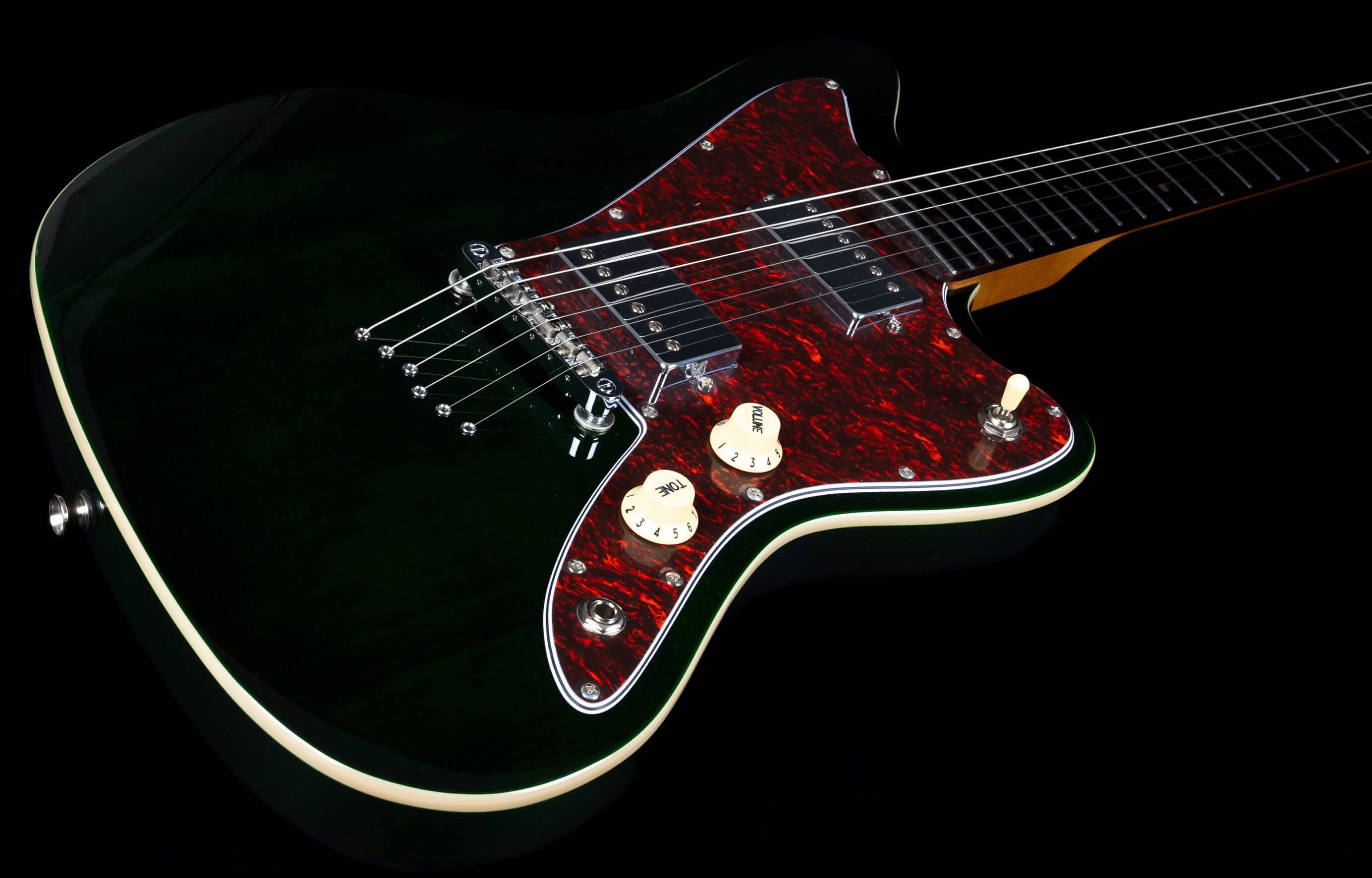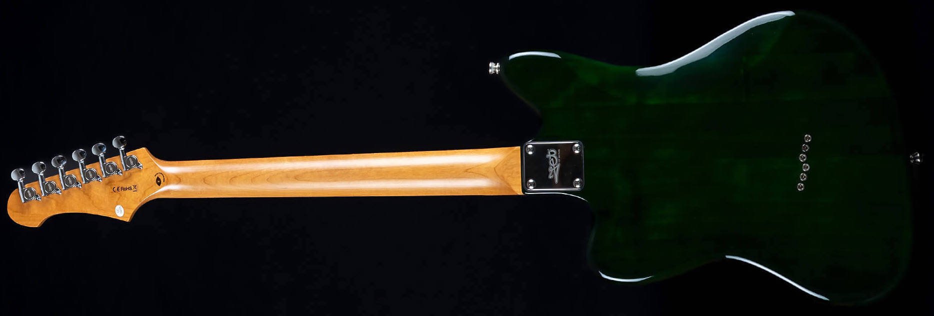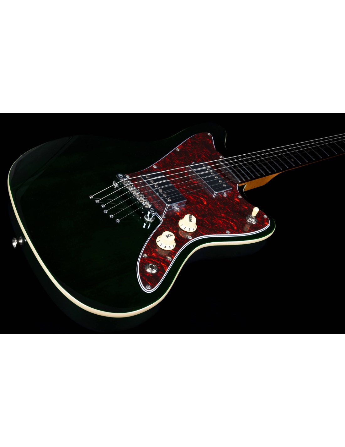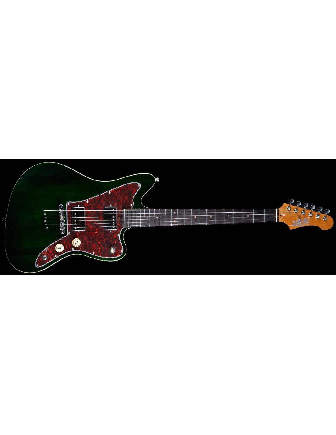 JET JJ-350 GR R VERT ÉMERAUDE ÉRABLE RÔTI est une guitare électrique solid body, série JJ-350 GR R avec un corps en Basswood (tilleul), un manche en érable rôti canadien de 3 pièces à profil Modern C, un doigté en Palissandre avec un rayon de 9,5" comportant 22 frettes et des incrustations en points blancs, Truss Rod Double Action, sillet en os, matériel Chrome, mécaniques en ligne moulées et un pont fixe String Through Body. L'électronique à configuration HH se compose de 2 micros Humbucker JET Own Spec Ceramic au chevalet et au manche avec contrôle Master Volume, contrôle Master Tone et sélecteur de micros à 3 voies.