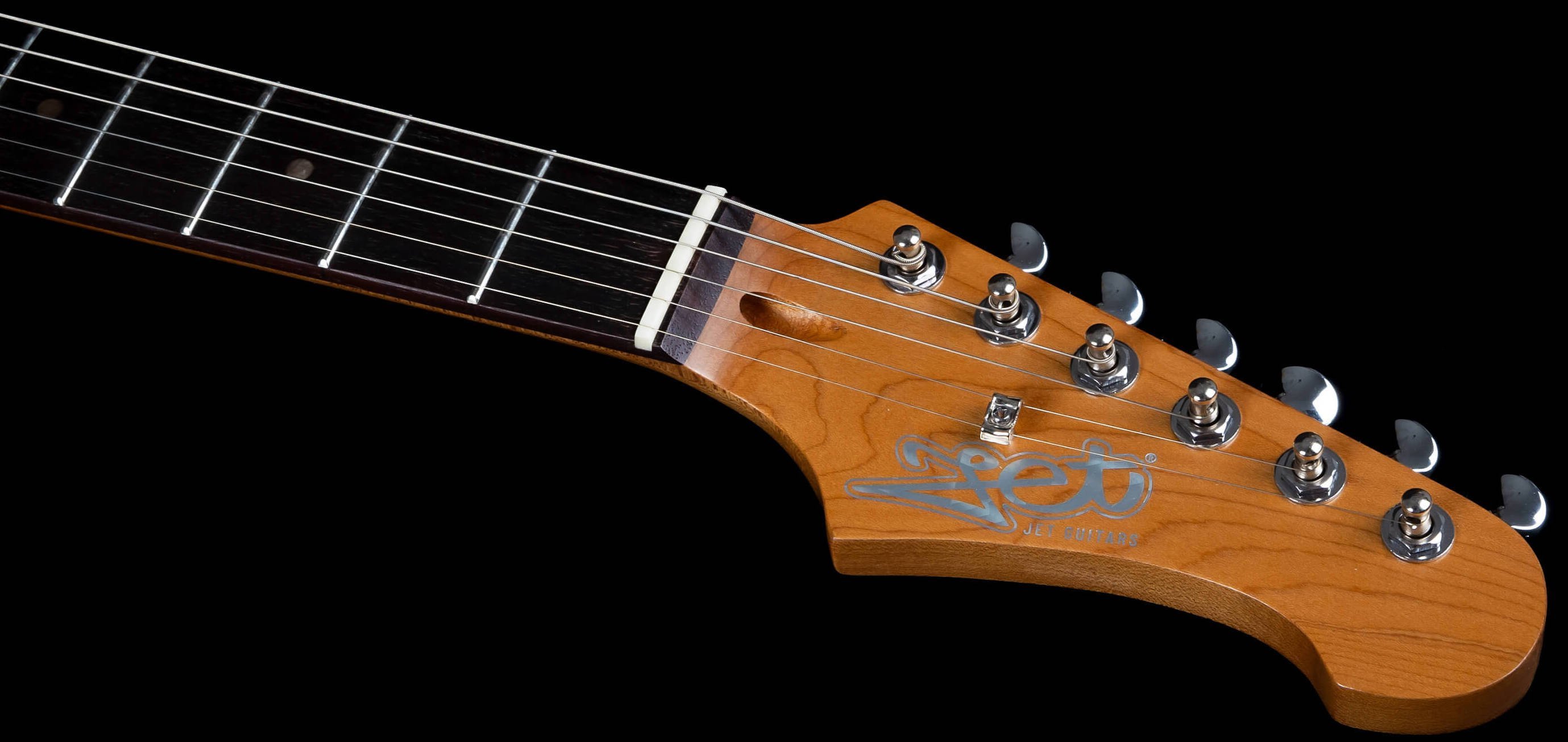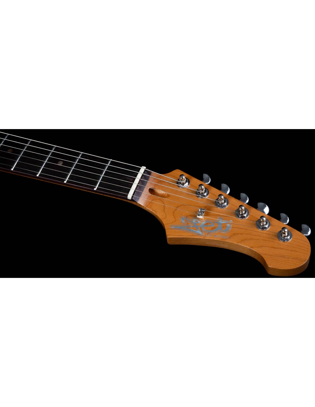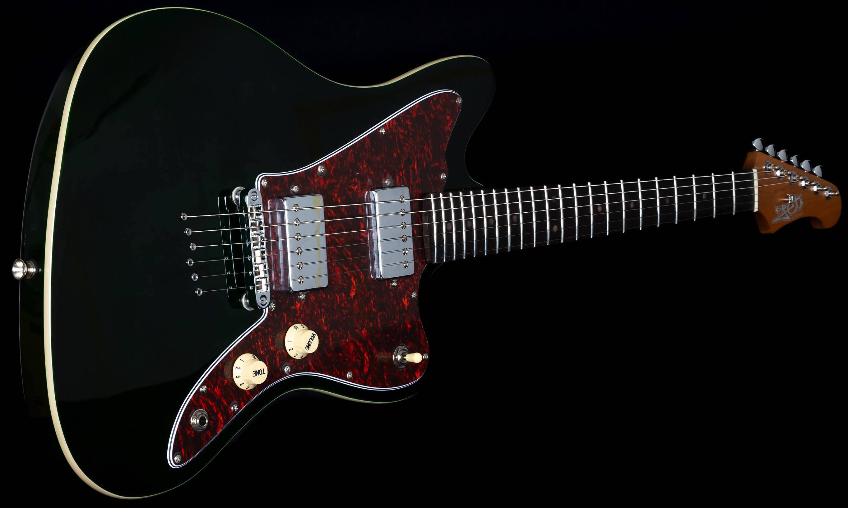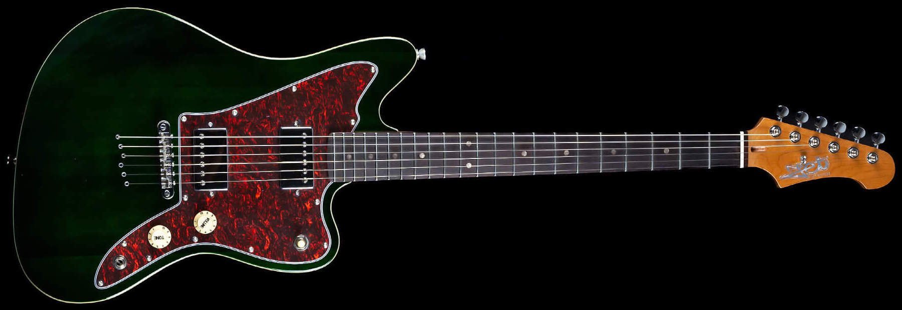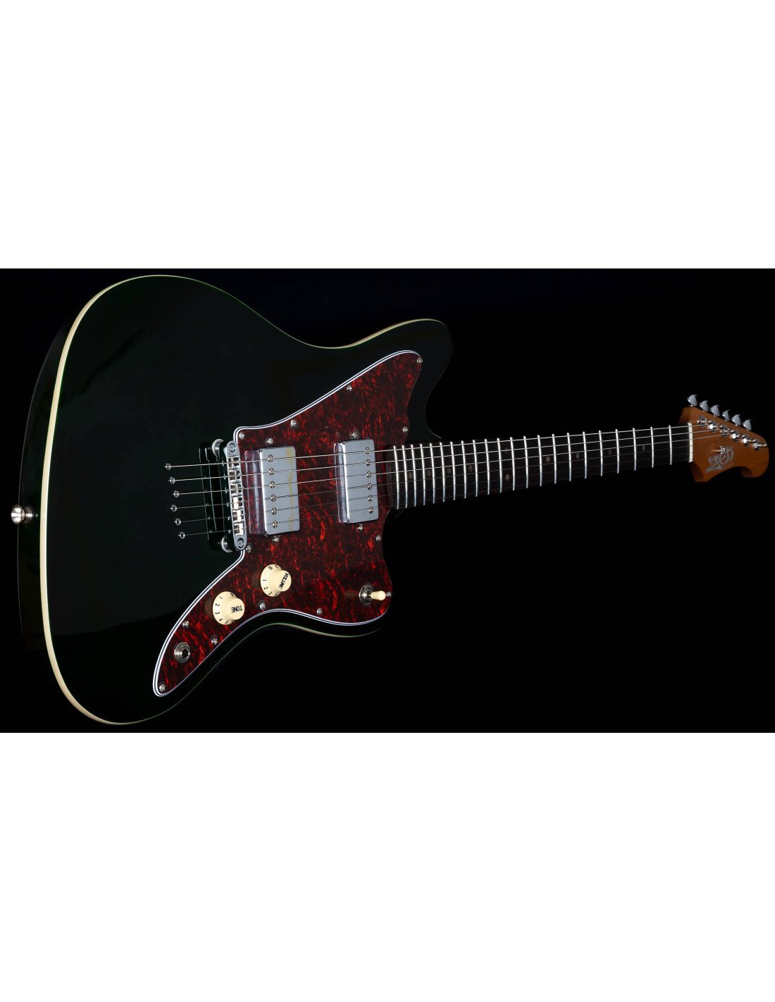 JET JJ-350 GR R VERT ÉMERAUDE ÉRABLE RÔTI est une guitare électrique solid body, série JJ-350 GR R avec un corps en Basswood (tilleul), un manche en érable rôti canadien de 3 pièces à profil Modern C, un doigté en Palissandre avec un rayon de 9,5" comportant 22 frettes et des incrustations en points blancs, Truss Rod Double Action, sillet en os, matériel Chrome, mécaniques en ligne moulées et un pont fixe String Through Body. L'électronique à configuration HH se compose de 2 micros Humbucker JET Own Spec Ceramic au chevalet et au manche avec contrôle Master Volume, contrôle Master Tone et sélecteur de micros à 3 voies.