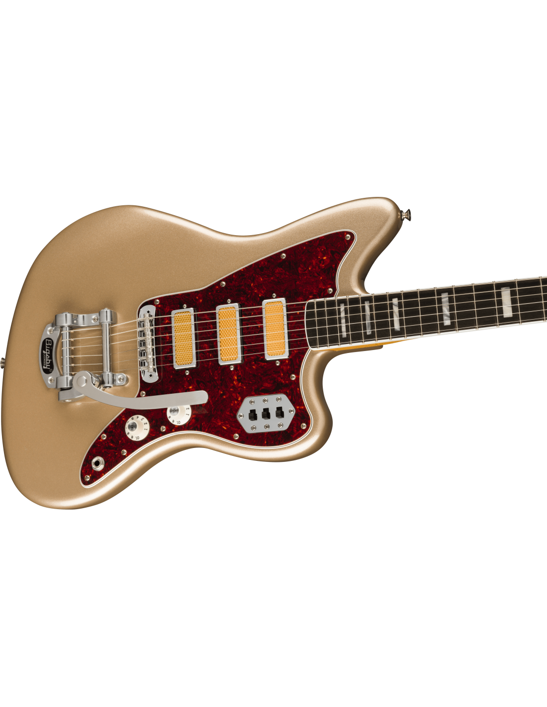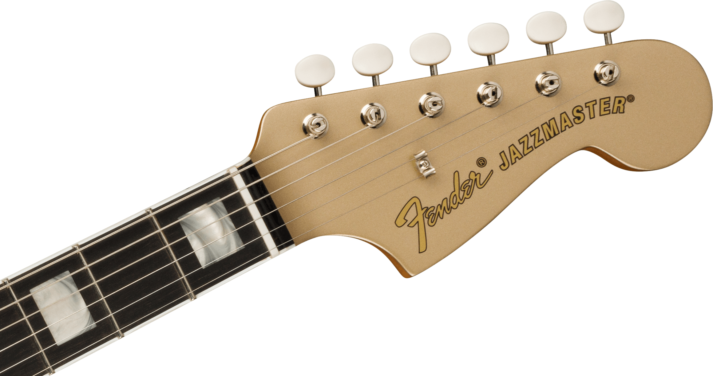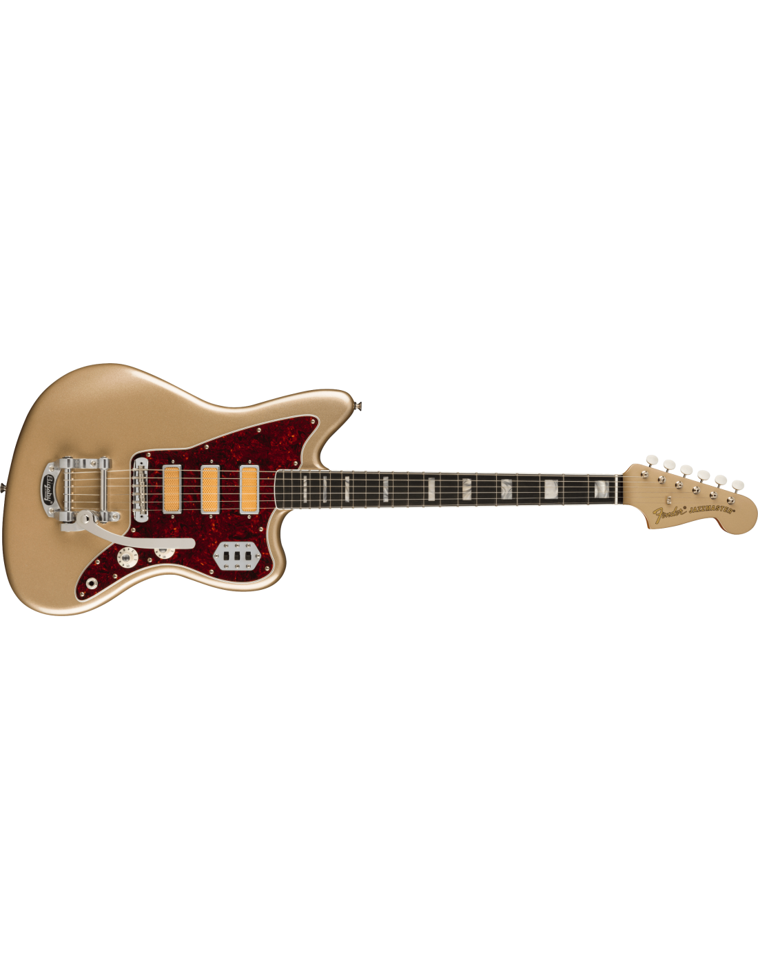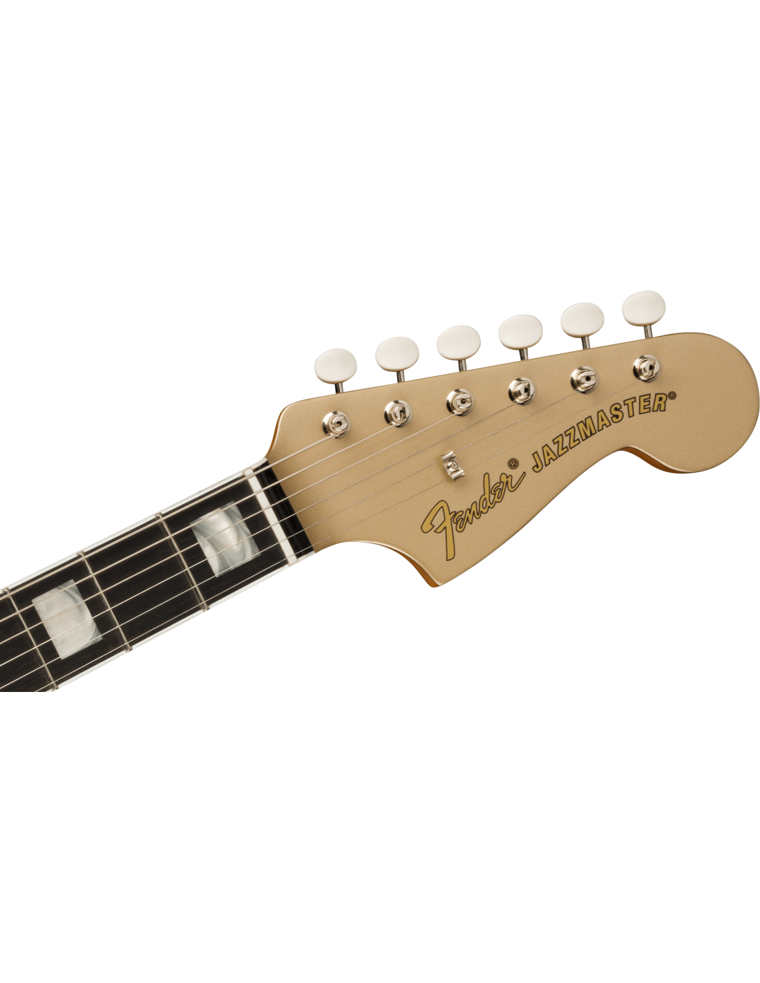FENDER GOLD FOIL JAZZMASTER EB SHORELINE GOLD est une guitare électrique solid body, modèle Gold Foil Jazzmaster Ebony Fingerboard, avec un corps en acajou et une finition Gloss Polyester, un manche en érable au profil '60s "C", une touche en ébène à rayon 9,5" avec 21 frettes Narrow Tall et des incrustations White Pearloid Block, un sillet en os synthétique, un matériel nickelé, une tête de manche assortie, des mécaniques Vintage-Style avec le logo Fender et des boutons blancs avec un abaississeur de cordes Butterfly et un pont Jazzmaster Bridge avec des selles Mustang et un vibrato Bigsby-Licensed B50. L'électronique à configuration HHH consiste en 3 micros Gold Foil Mini-Humbucker, avec un contrôle Master Volume, un contrôle Master Tone et 3 interrupteurs à glissière On/Off (un pour chaque micro). Inclut un étui Fender Deluxe Gig Bag.