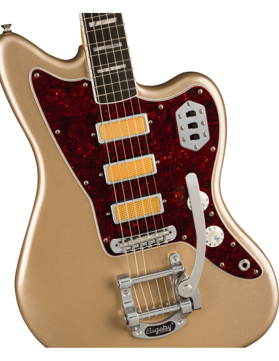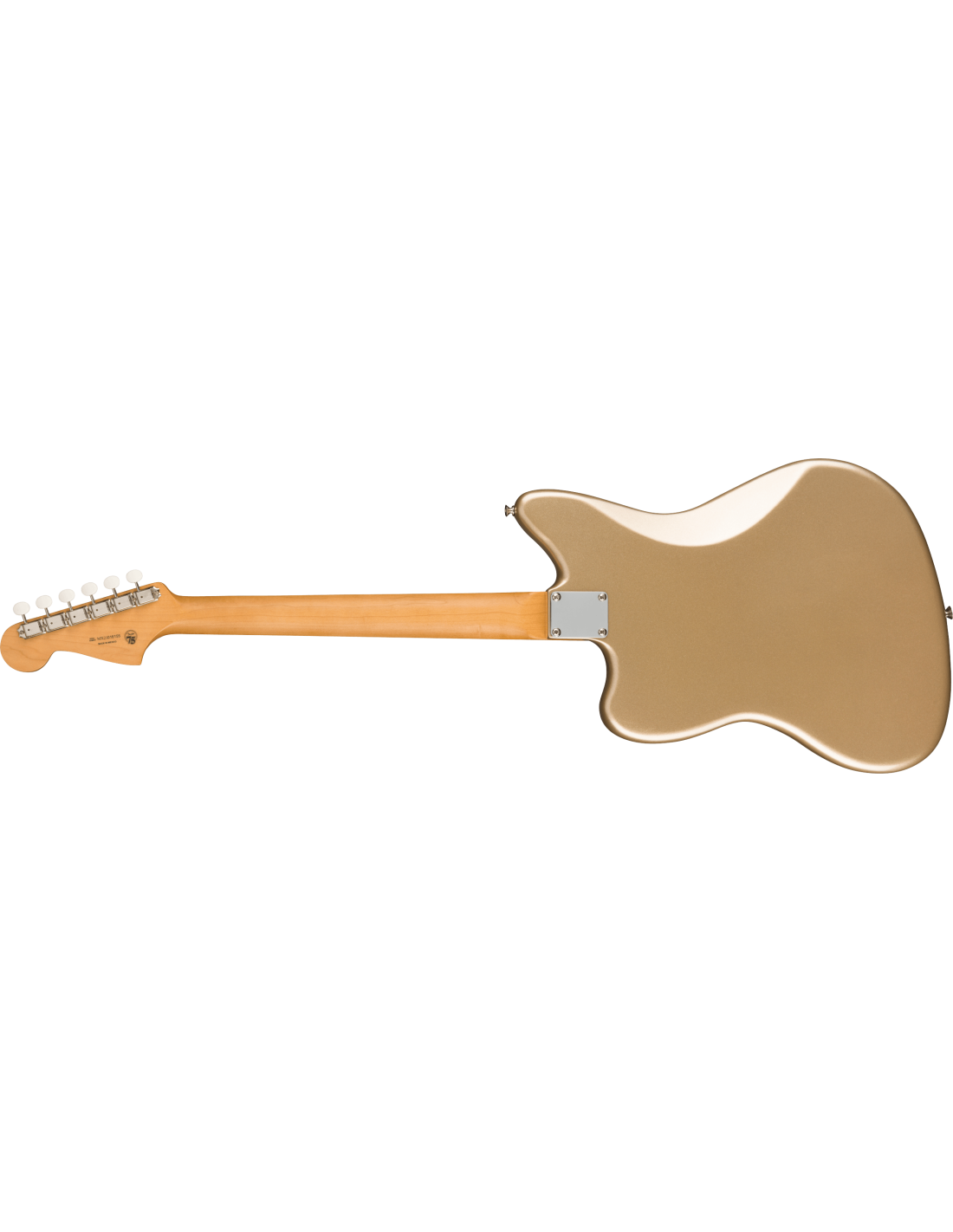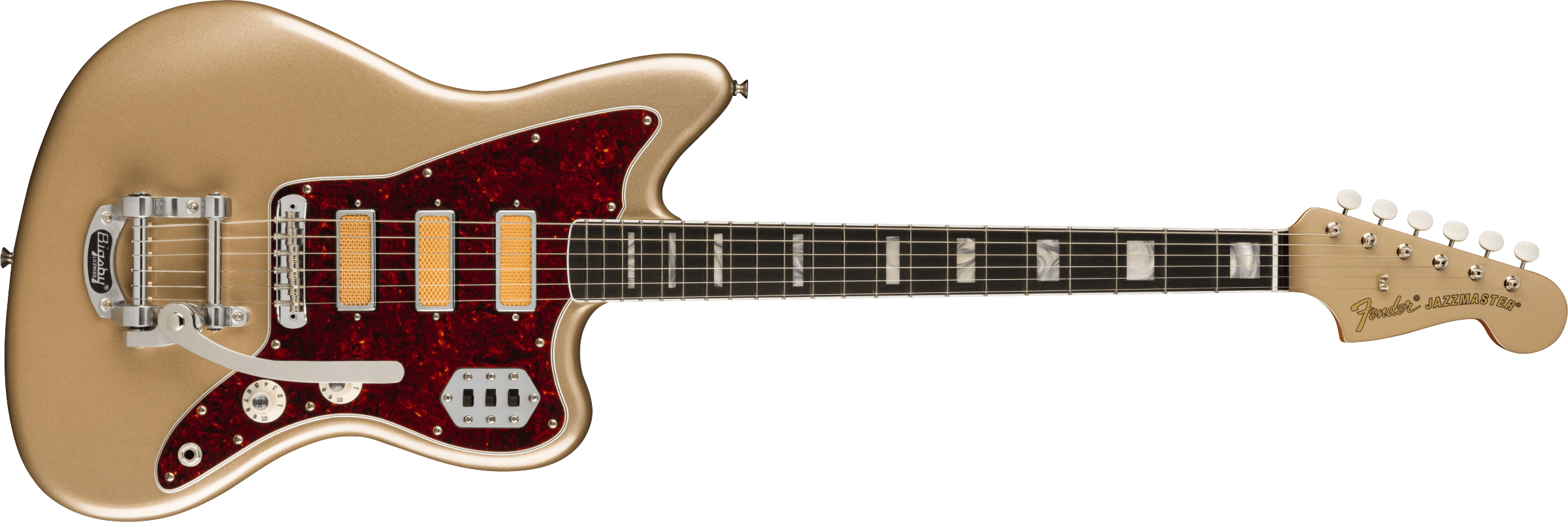 FENDER GOLD FOIL JAZZMASTER EB SHORELINE GOLD est une guitare électrique solid body, modèle Gold Foil Jazzmaster Ebony Fingerboard, avec un corps en acajou et une finition Gloss Polyester, un manche en érable au profil '60s "C", une touche en ébène à rayon 9,5" avec 21 frettes Narrow Tall et des incrustations White Pearloid Block, un sillet en os synthétique, un matériel nickelé, une tête de manche assortie, des mécaniques Vintage-Style avec le logo Fender et des boutons blancs avec un abaississeur de cordes Butterfly et un pont Jazzmaster Bridge avec des selles Mustang et un vibrato Bigsby-Licensed B50. L'électronique à configuration HHH consiste en 3 micros Gold Foil Mini-Humbucker, avec un contrôle Master Volume, un contrôle Master Tone et 3 interrupteurs à glissière On/Off (un pour chaque micro). Inclut un étui Fender Deluxe Gig Bag.
