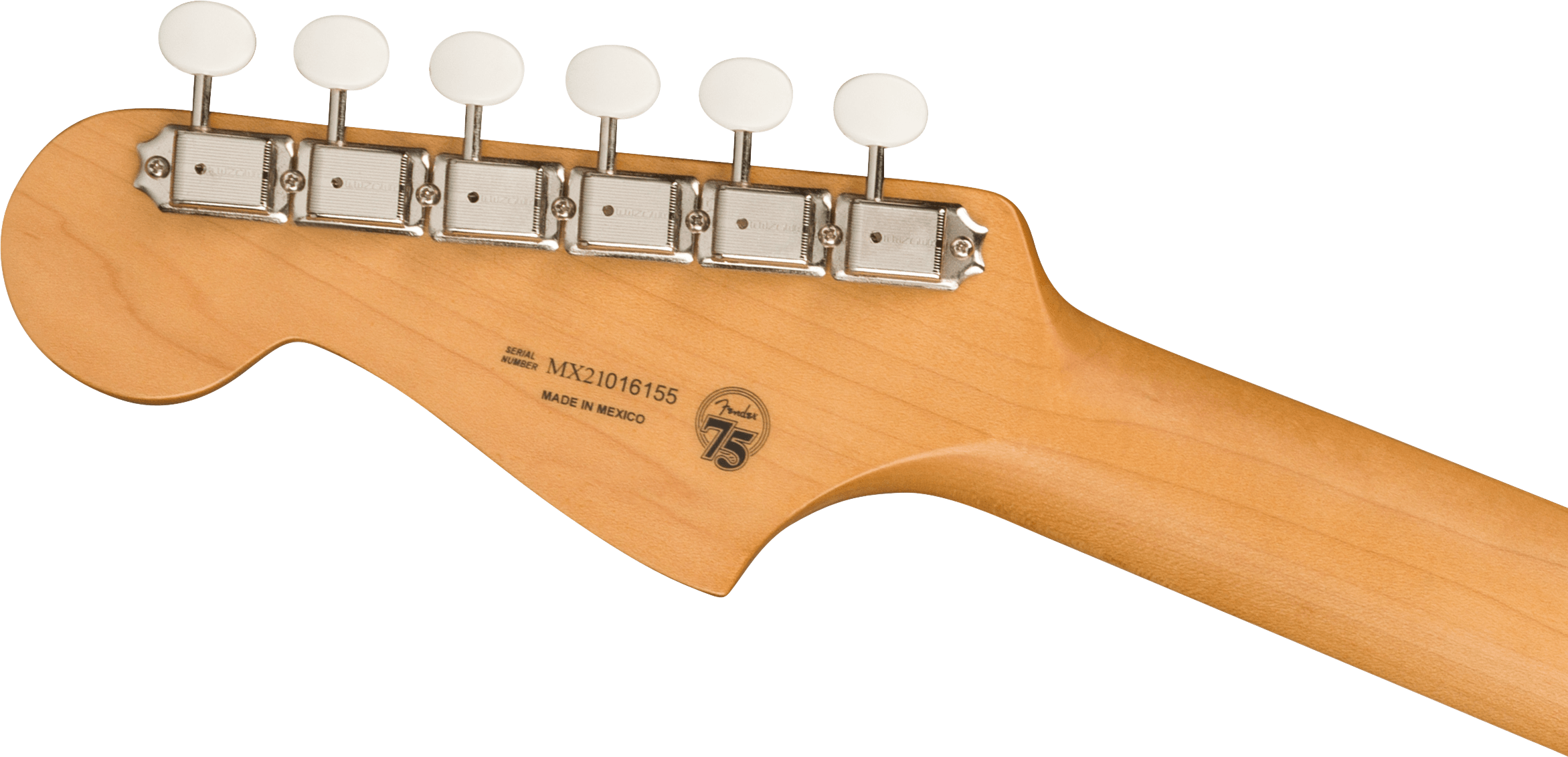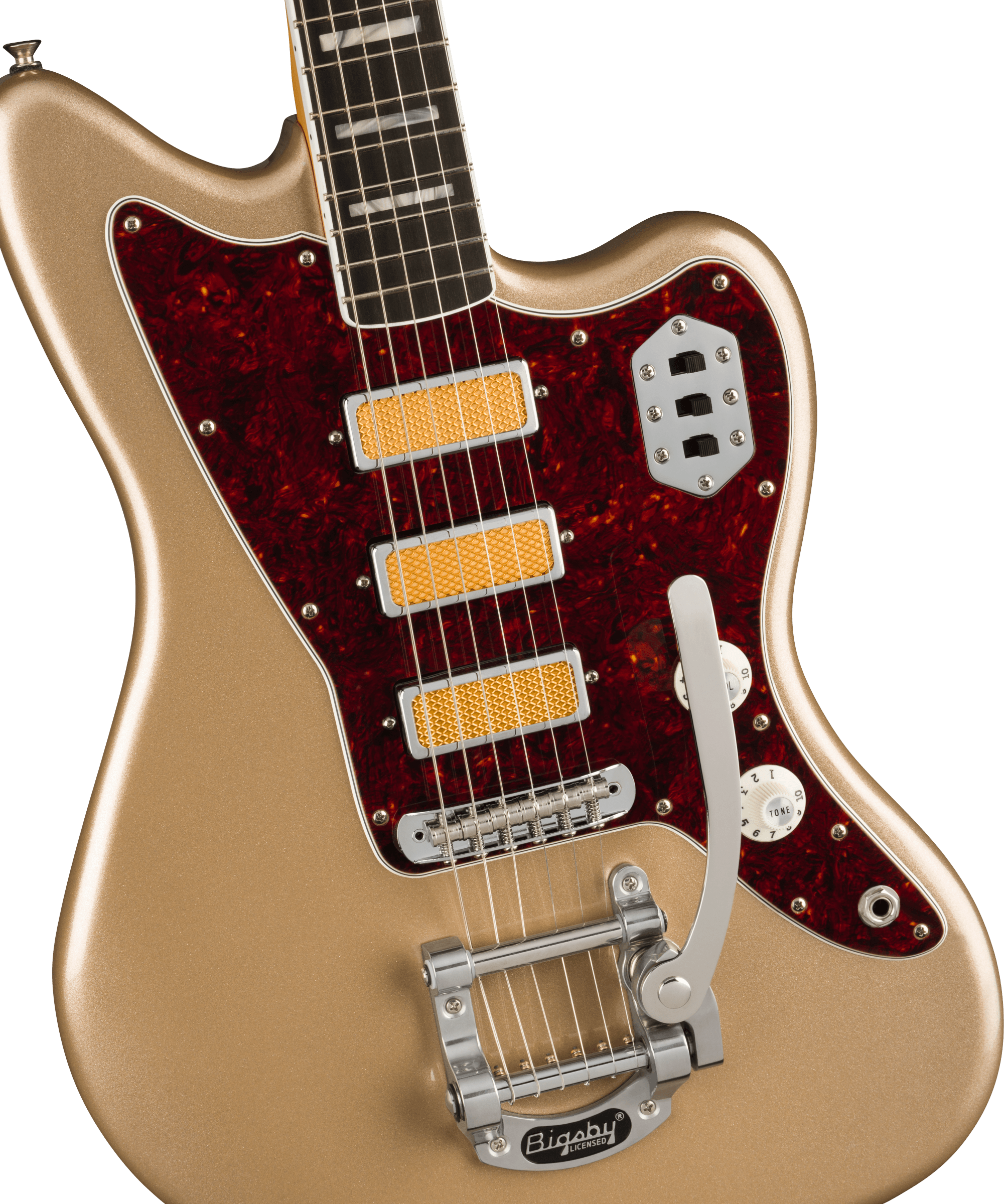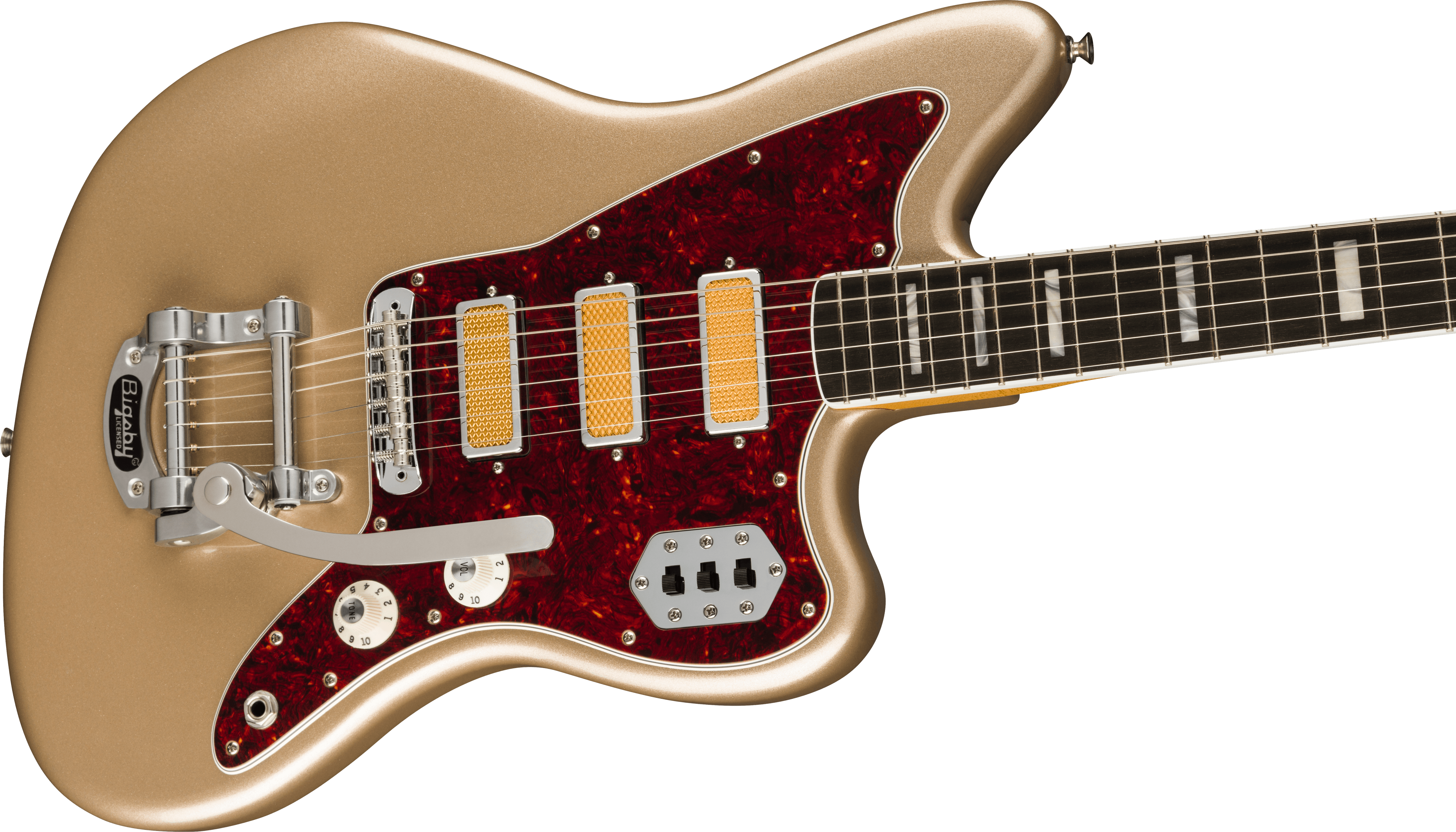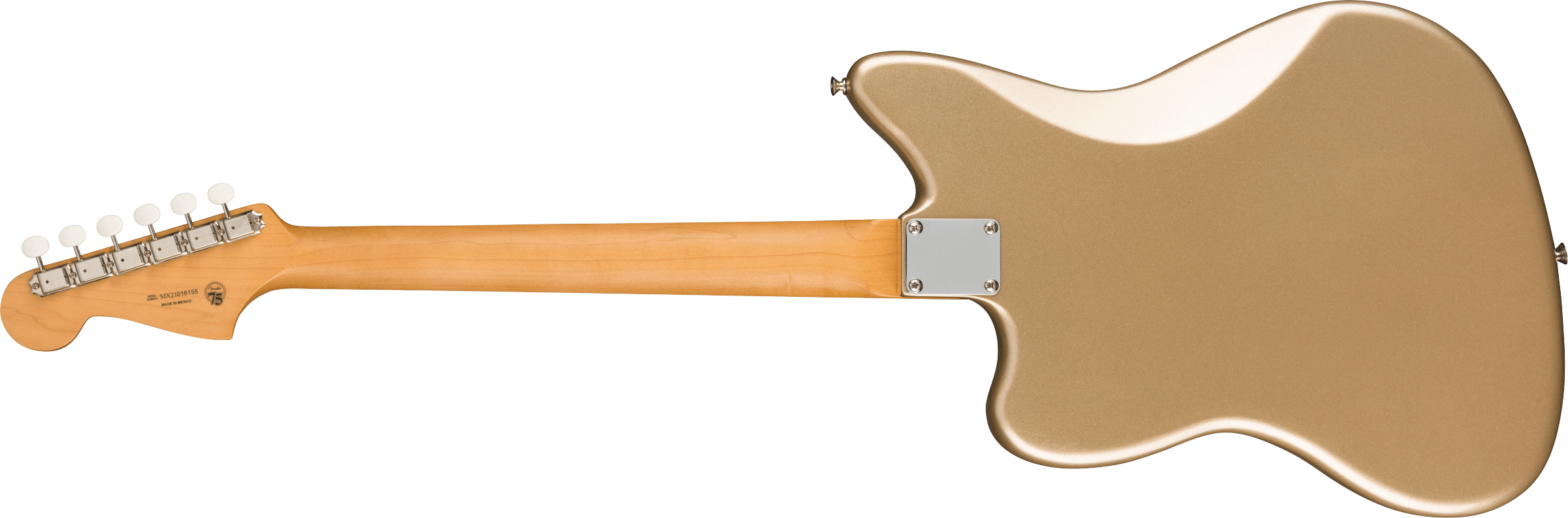 FENDER GOLD FOIL JAZZMASTER EB SHORELINE GOLD est une guitare électrique solid body, modèle Gold Foil Jazzmaster Ebony Fingerboard, avec un corps en acajou et une finition Gloss Polyester, un manche en érable au profil '60s "C", une touche en ébène à rayon 9,5" avec 21 frettes Narrow Tall et des incrustations White Pearloid Block, un sillet en os synthétique, un matériel nickelé, une tête de manche assortie, des mécaniques Vintage-Style avec le logo Fender et des boutons blancs avec un abaississeur de cordes Butterfly et un pont Jazzmaster Bridge avec des selles Mustang et un vibrato Bigsby-Licensed B50. L'électronique à configuration HHH consiste en 3 micros Gold Foil Mini-Humbucker, avec un contrôle Master Volume, un contrôle Master Tone et 3 interrupteurs à glissière On/Off (un pour chaque micro). Inclut un étui Fender Deluxe Gig Bag.