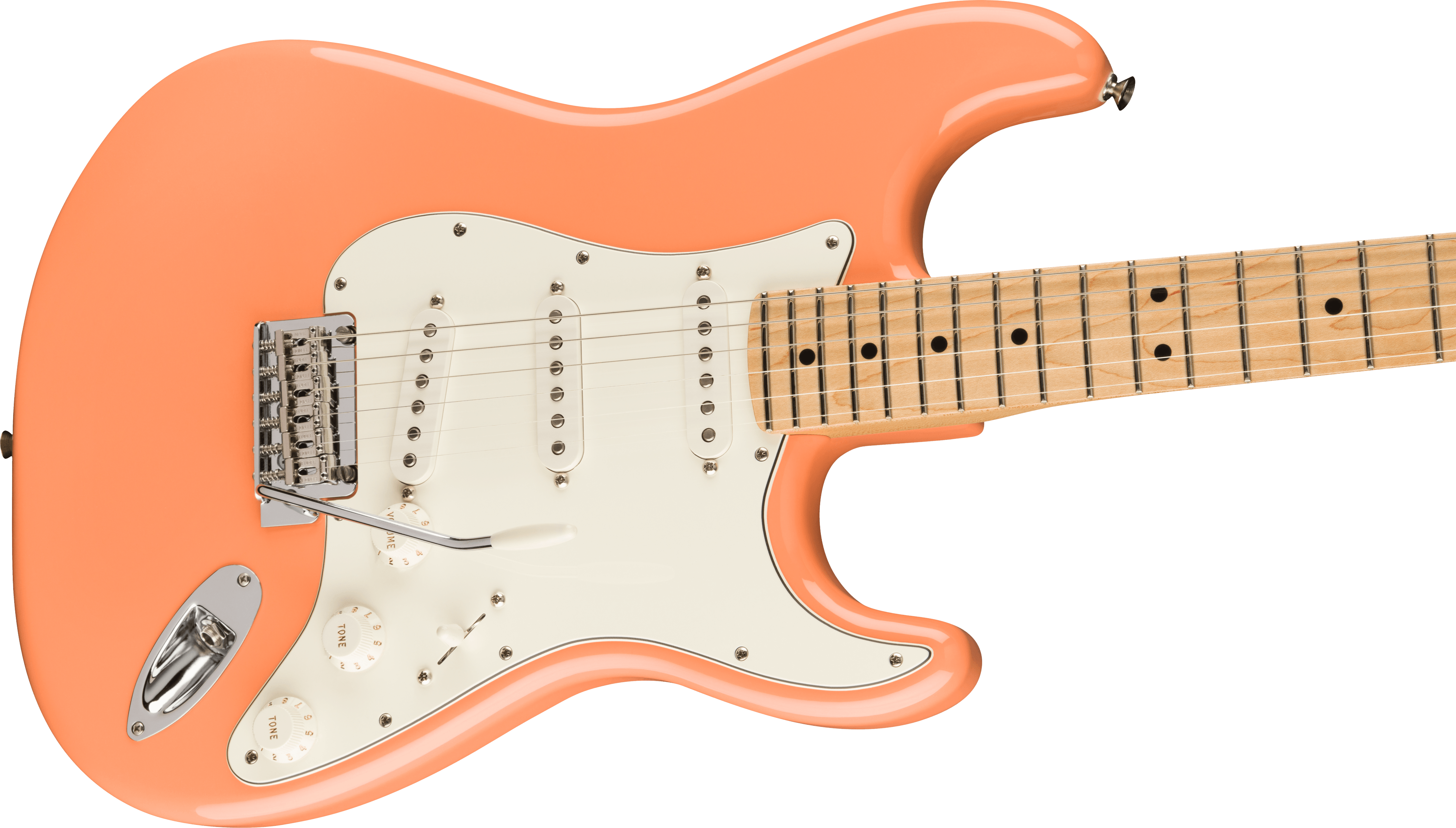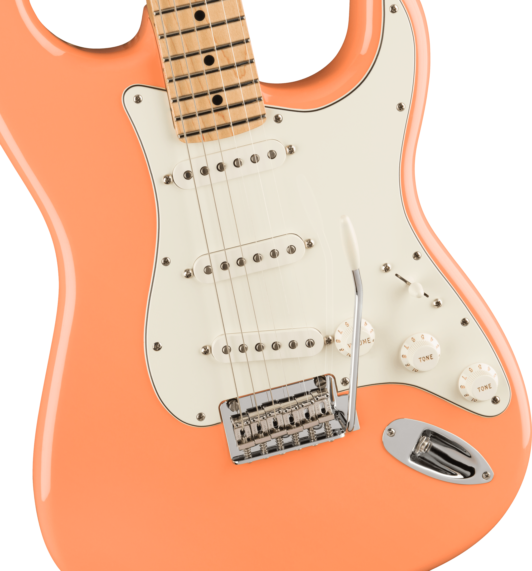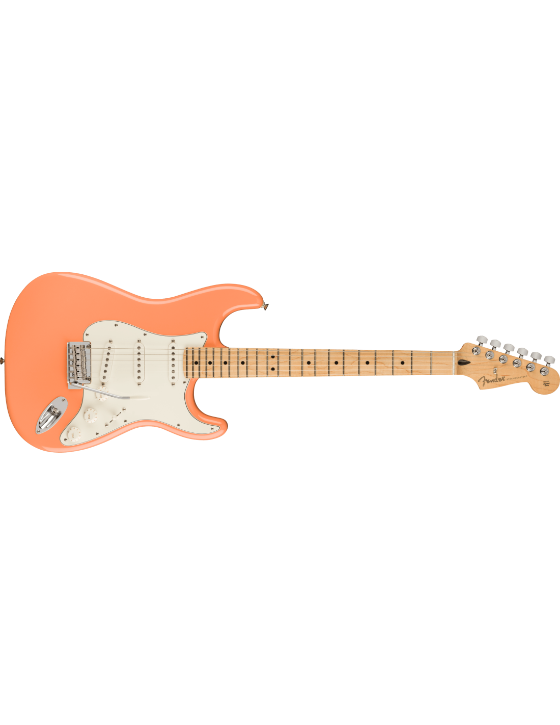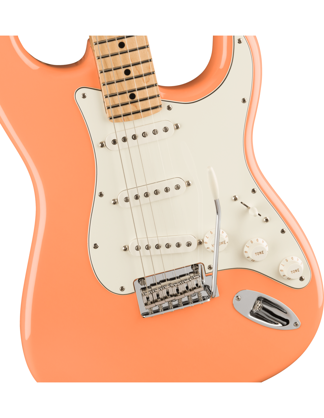 FENDER PLAYER STRAT MN PCP LTD est une guitare électrique solid body, modèle Limited Edition Player Stratocaster, avec un corps en Alder (Ontano) et une finition Gloss Polyester, un manche en érable au profil Modern C-profile, un doigté en érable avec un rayon de 9,5" et 22 frettes Medium Jumbo et des incrustations Black Dots, un sillet en os synthétique, un matériel chromé, Truss Rod Single Action Head Adjust, mécaniques Fender Standard Cast/Sealed avec des alésages de cordes Dual-Wing, un pont Tremolo synchronisé en 2 points avec 6 selles en acier plié et un pickguard 3-Ply Parchment. L'électronique en configuration SSS consiste en 3 micros Single-Coil Player Series Alnico 5 Strat avec un contrôle Master Volume, 2 contrôles Master Tone et un sélecteur de micros à 5 voies.