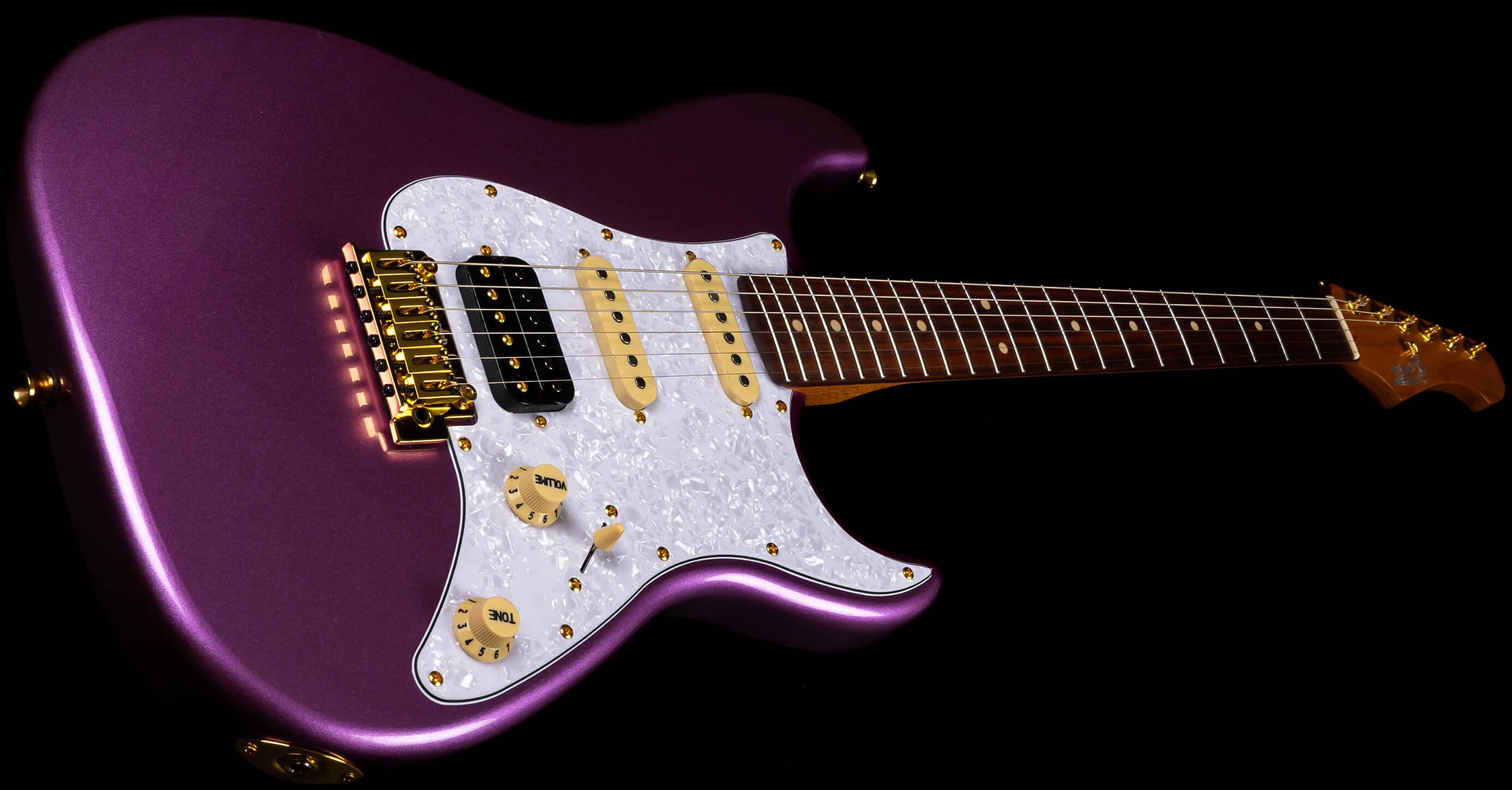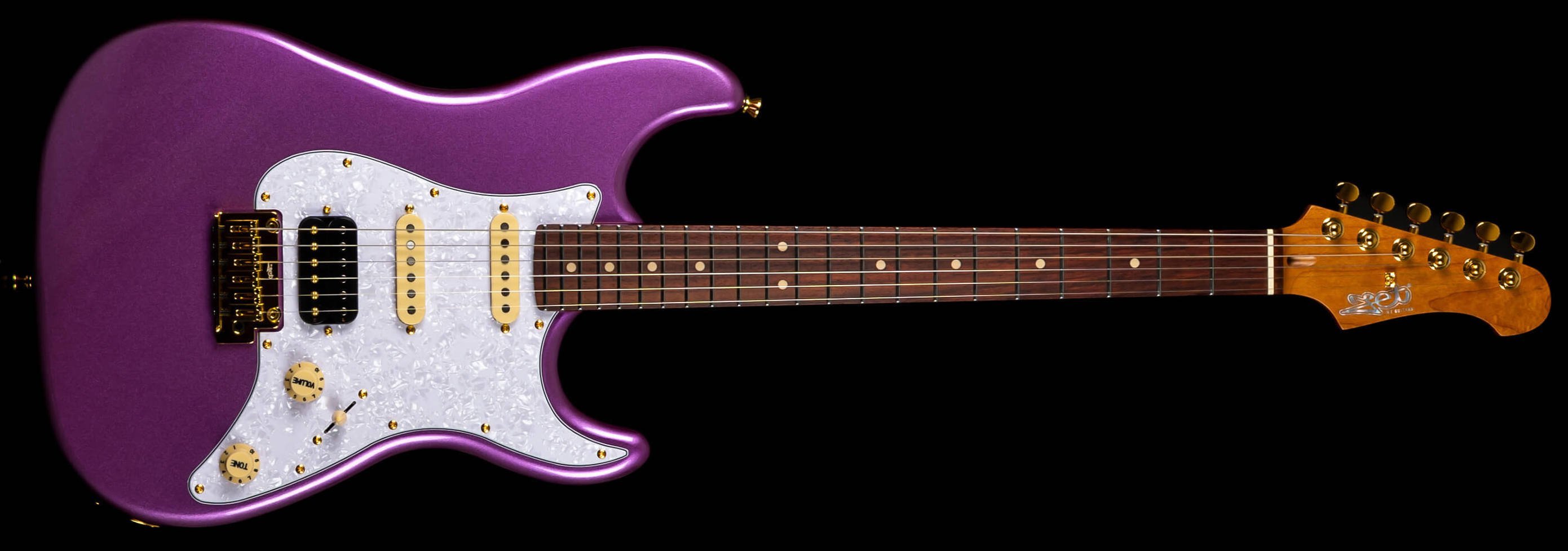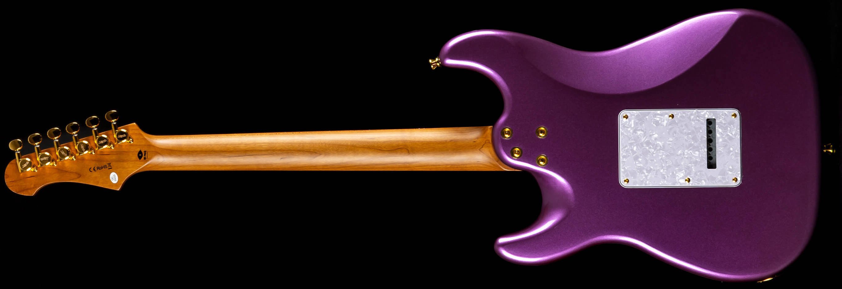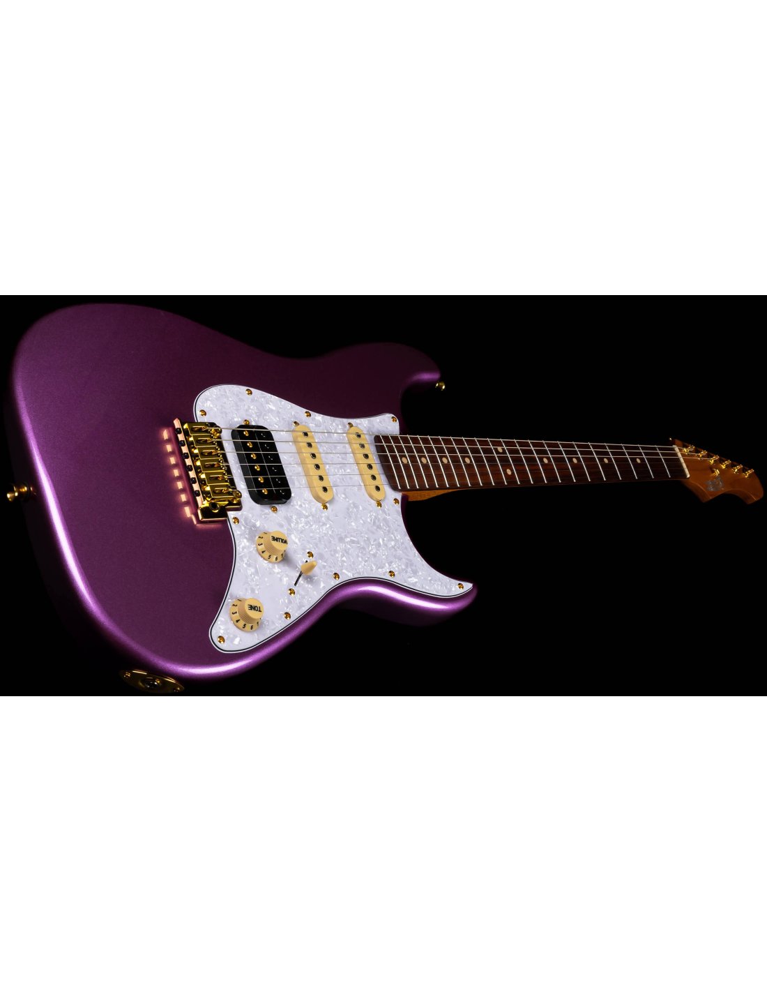 JET JS-480 V HSS VIOLET GOLD HARDWARE est une guitare électrique solid body Strato Style, modèle JS-480 HSS, avec un corps en peuplier rôti, un manche en érable rôti canadien à profil Modern "C" shape, une touche en palissandre à rayon 9,5" avec 22 frettes Medium Jumbo, Truss Rod Double Action, un sillet en os, un matériel doré, des mécaniques Locking dorées et un pont Tremolo doré. L'électronique à configuration HSS consiste en un ensemble de micros Humbucker et Single-Coil HSS Alnico V Custom Model avec contrôle Master Volume, contrôle Master Tone et sélecteur de micros à 5 voies.