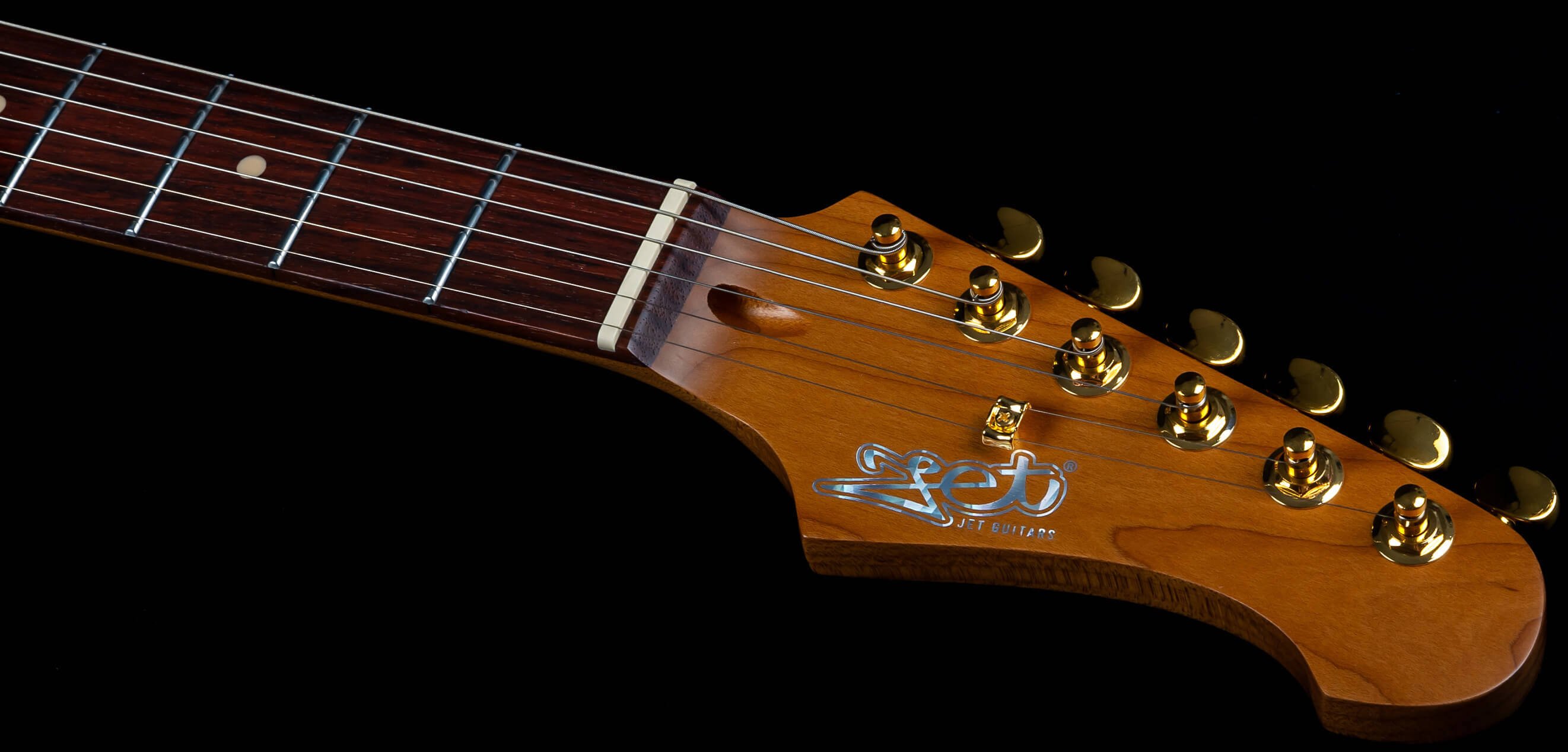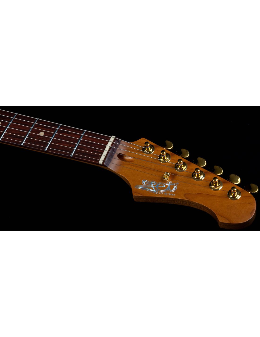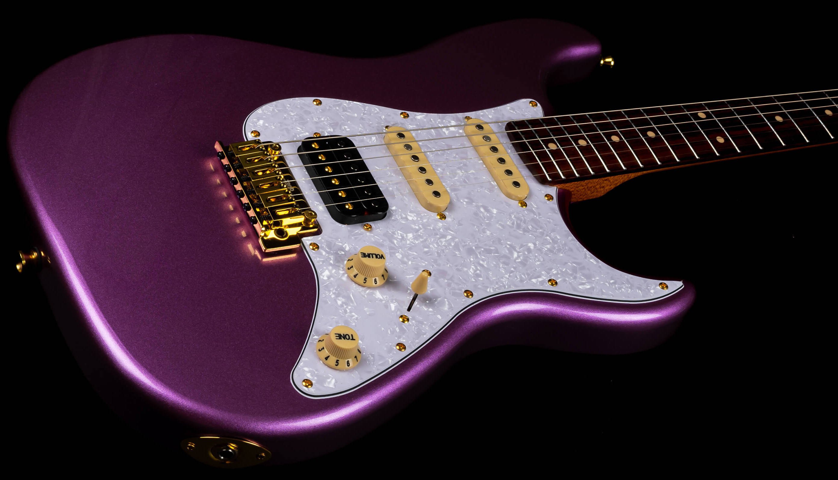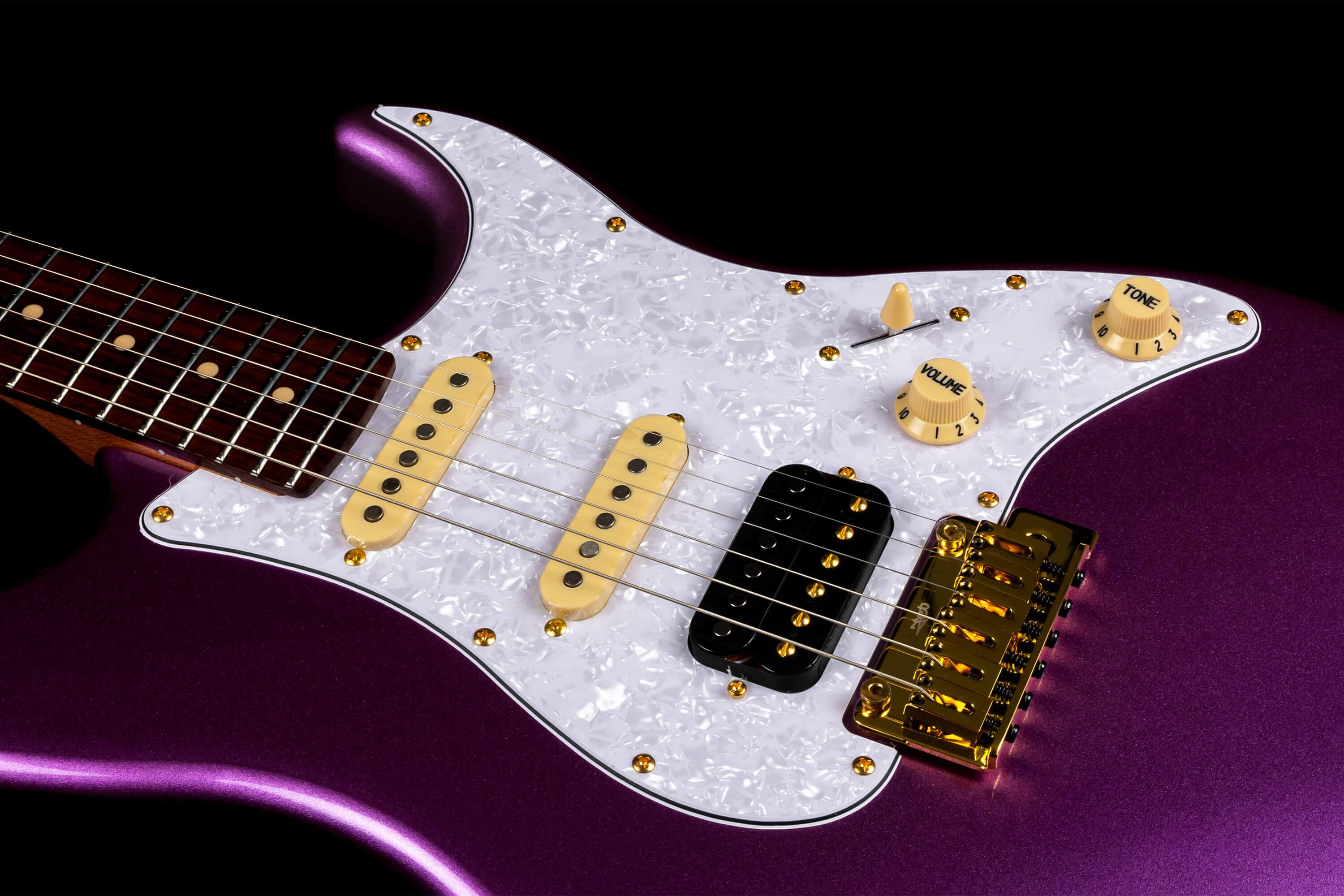 JET JS-480 V HSS VIOLET GOLD HARDWARE est une guitare électrique solid body Strato Style, modèle JS-480 HSS, avec un corps en peuplier rôti, un manche en érable rôti canadien à profil Modern "C" shape, une touche en palissandre à rayon 9,5" avec 22 frettes Medium Jumbo, Truss Rod Double Action, un sillet en os, un matériel doré, des mécaniques Locking dorées et un pont Tremolo doré. L'électronique à configuration HSS consiste en un ensemble de micros Humbucker et Single-Coil HSS Alnico V Custom Model avec contrôle Master Volume, contrôle Master Tone et sélecteur de micros à 5 voies.