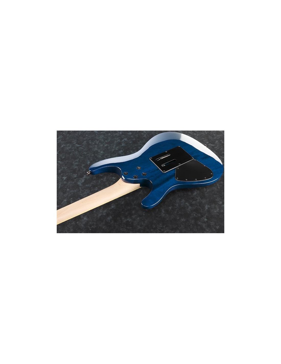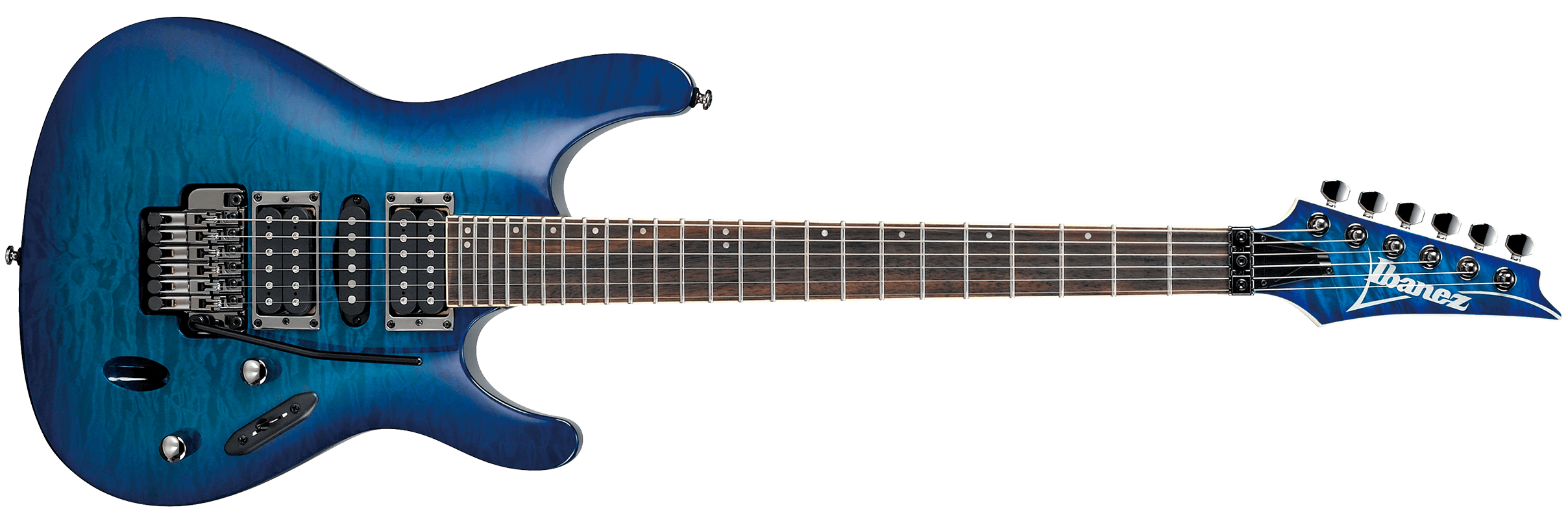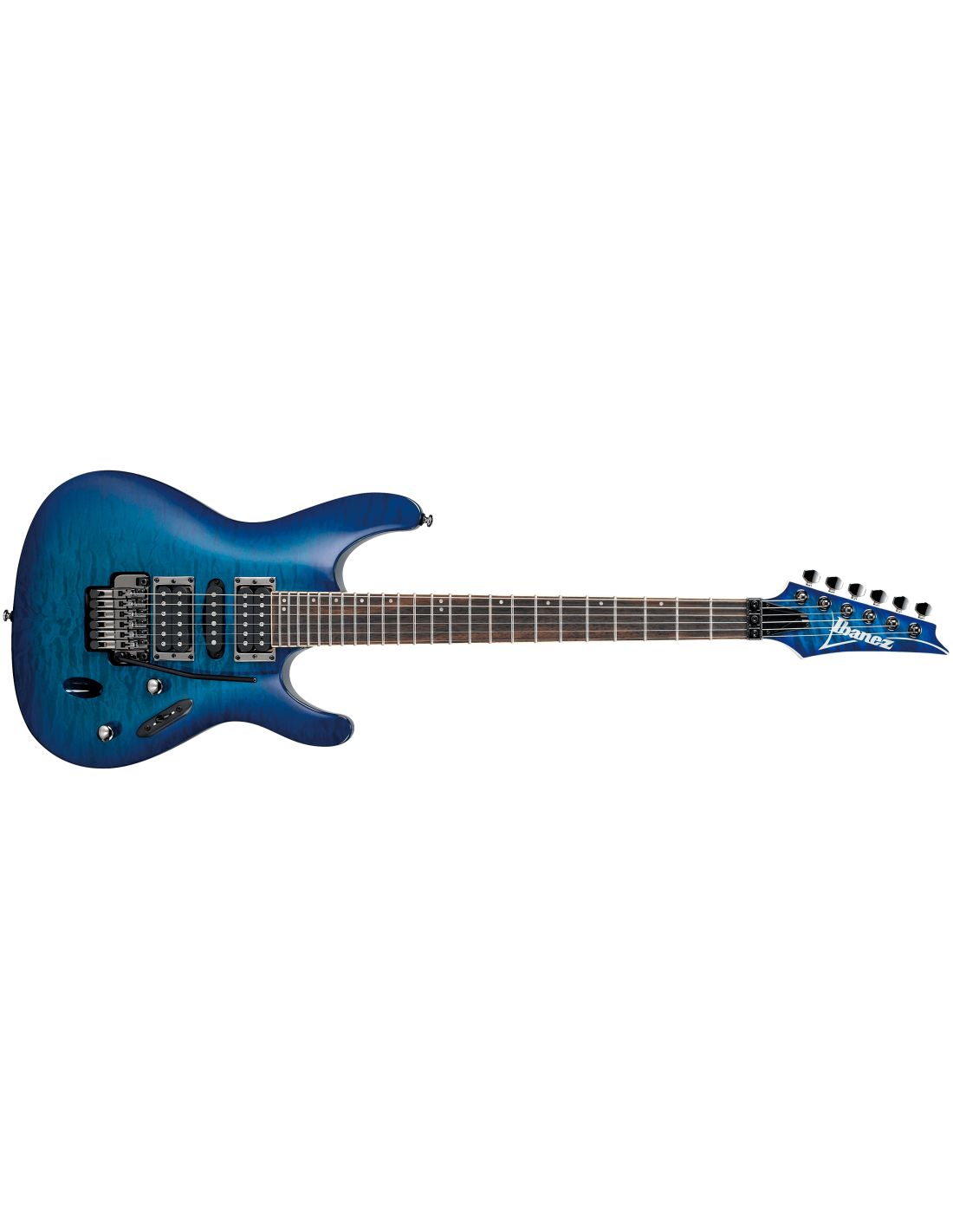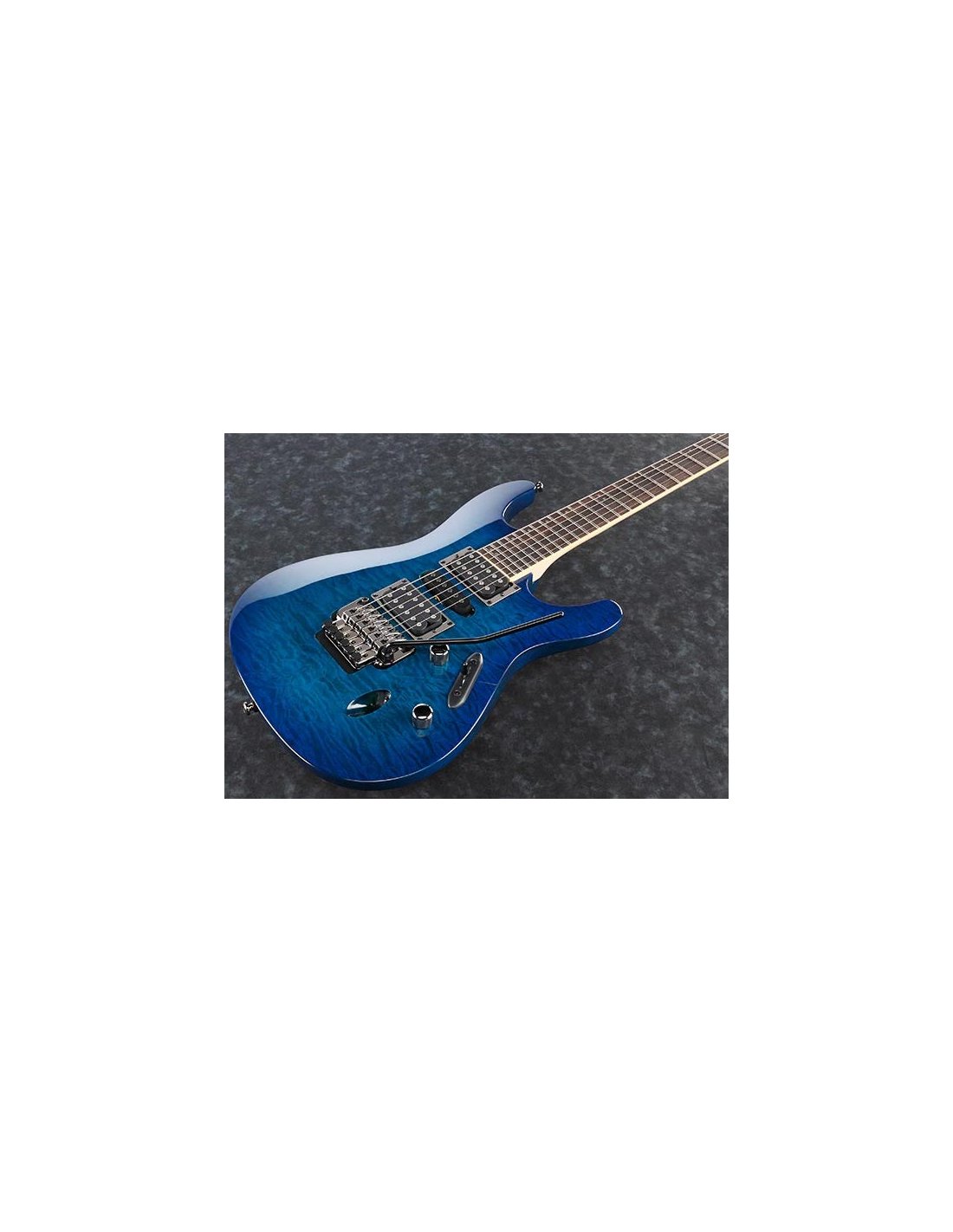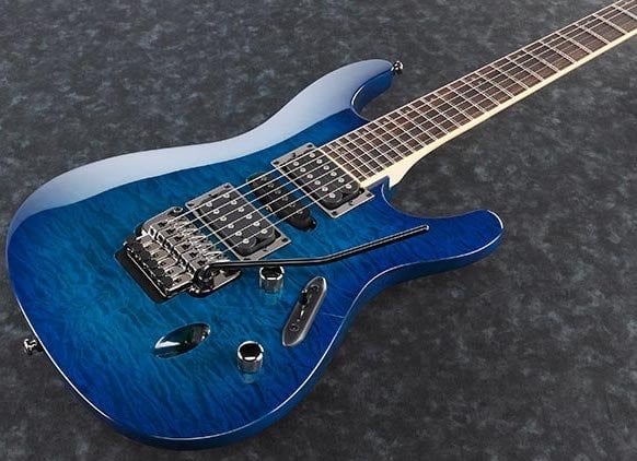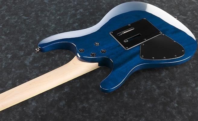IBANEZ S670QM-SPB est une guitare électrique solid body, série Ibanez S modèle Ibanez S670QM, avec un corps en Meranti et un top en Érable Quilté, un manche Wizard III en Érable, un touche en Palissandre à rayon 15,75" avec 24 frettes Jumbo et des incrustations Off-set White dot, un sillet de tête Locking de 43mm, un matériel Cosmo Black, des mécaniques Cosmo Black en ligne et un pont Tremolo Edge-Zero II. L'électronique à configuration HSH se compose de 2 micros Humbucker Quantum passifs/céramiques au pont et au manche, et d'un micro Single Coil Quantum passif/alnico au centre, avec un contrôle Master Volume, Master Tone et un sélecteur de micros à 5 voies.